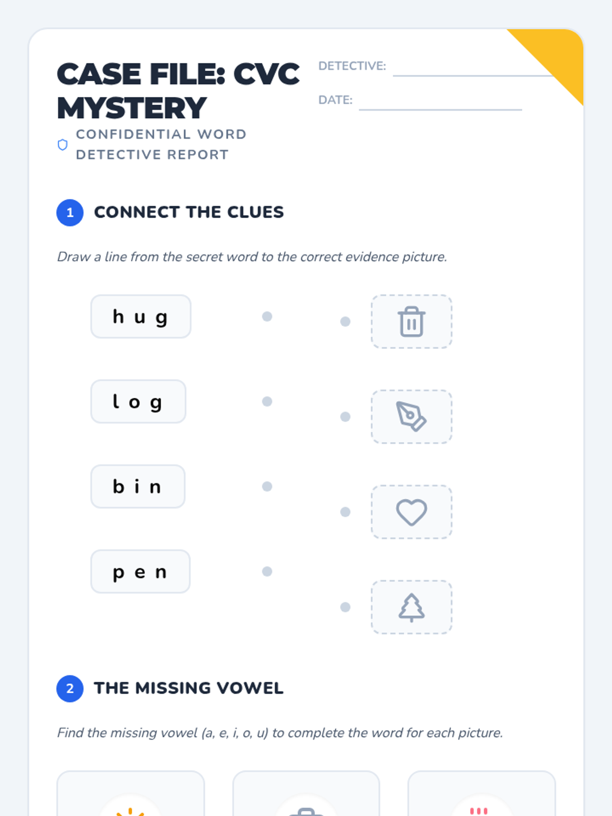 Students become 'Word Detectives' to decode and build simple Consonant-Vowel-Consonant words through visual blending and independent practice. This lesson reinforces phonemic awareness and early reading skills.