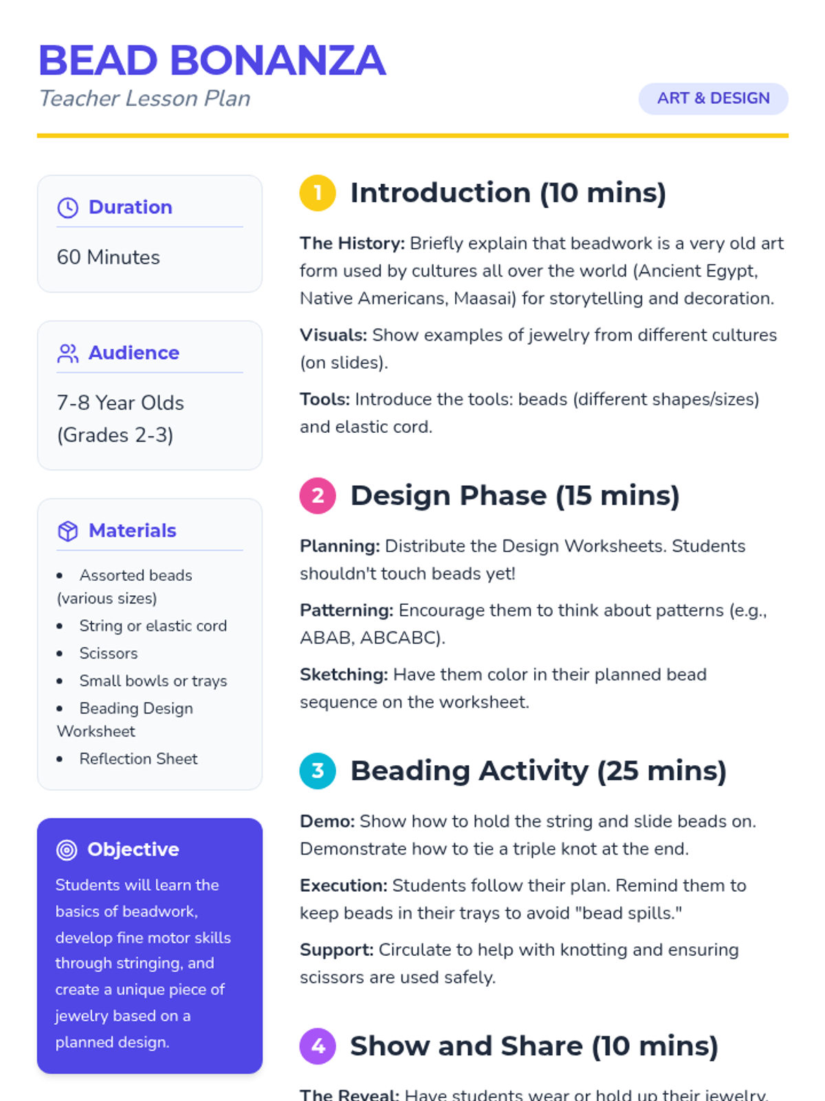 Students learn the basics of beadwork, plan their designs, and create colorful jewelry while developing fine motor skills and cultural appreciation.