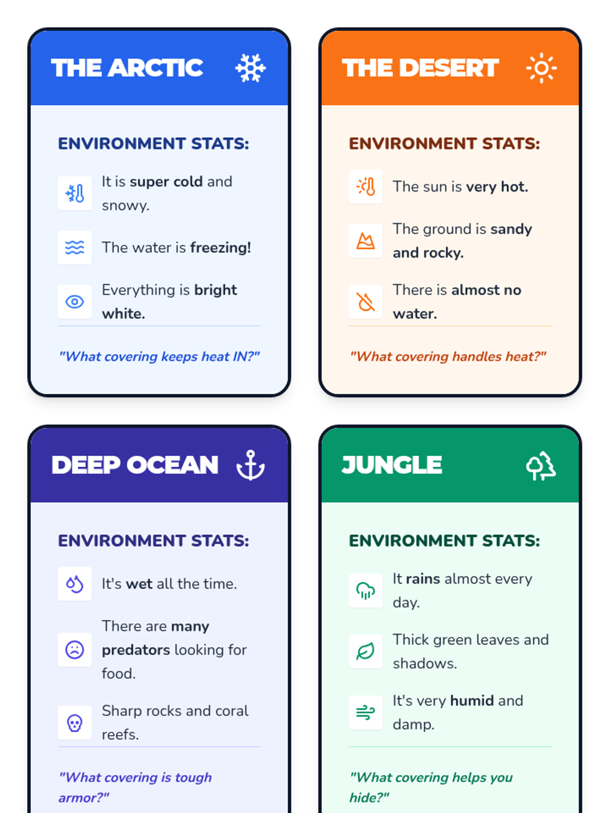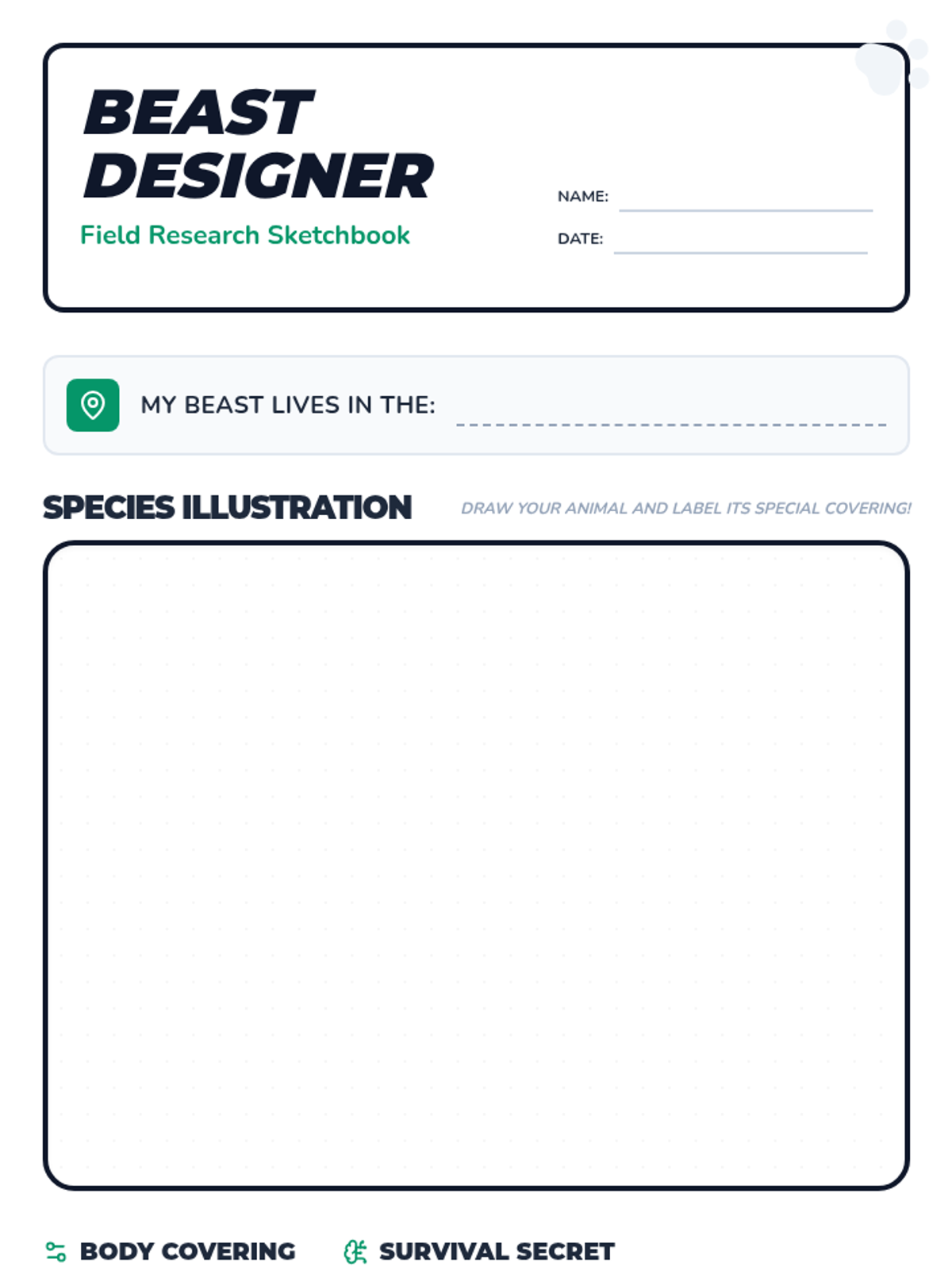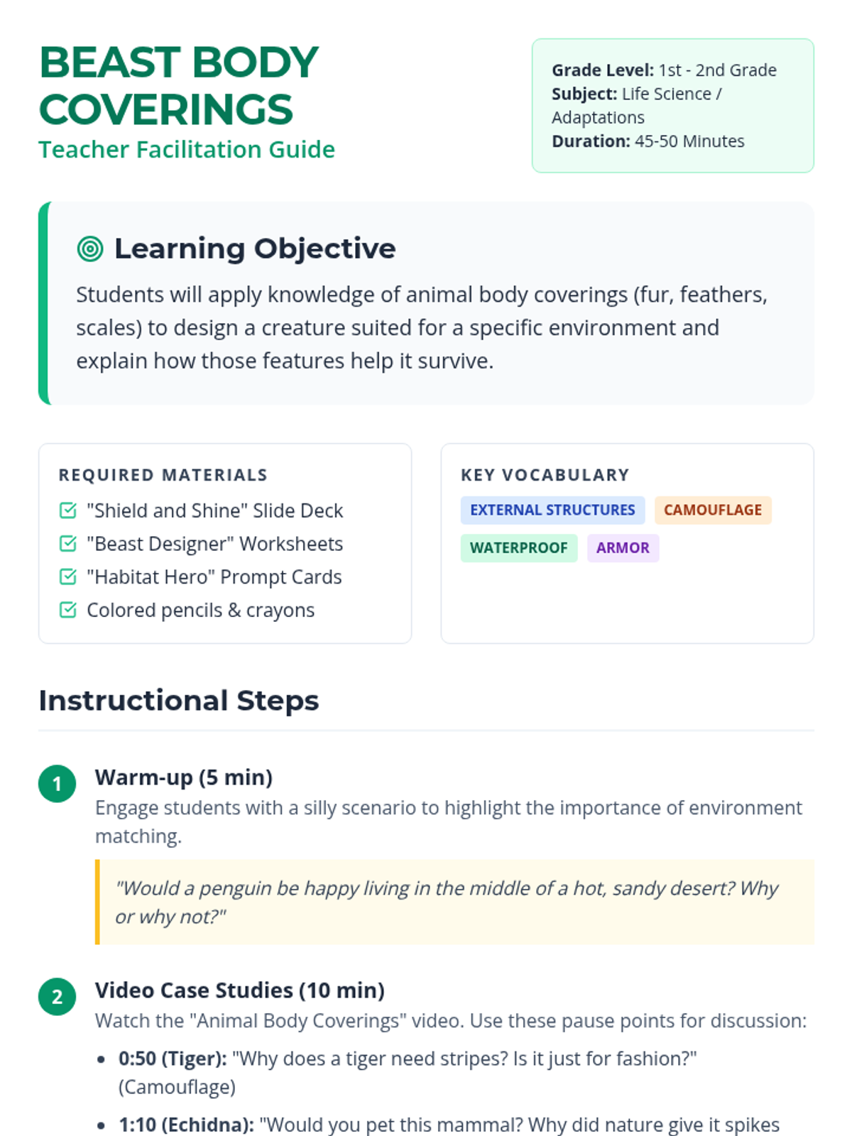 A hands-on science lesson for 1st-2nd grade students to explore how fur, feathers, and scales help animals survive in different environments, culminating in a creative beast-designing project.