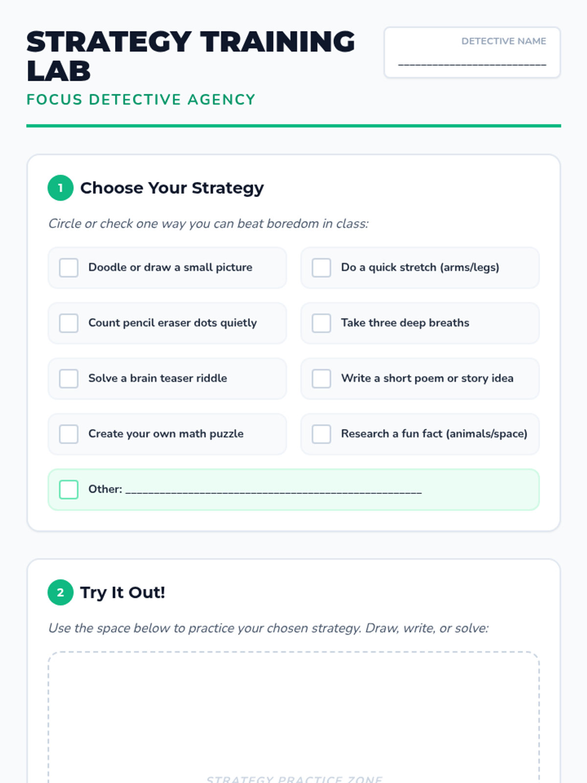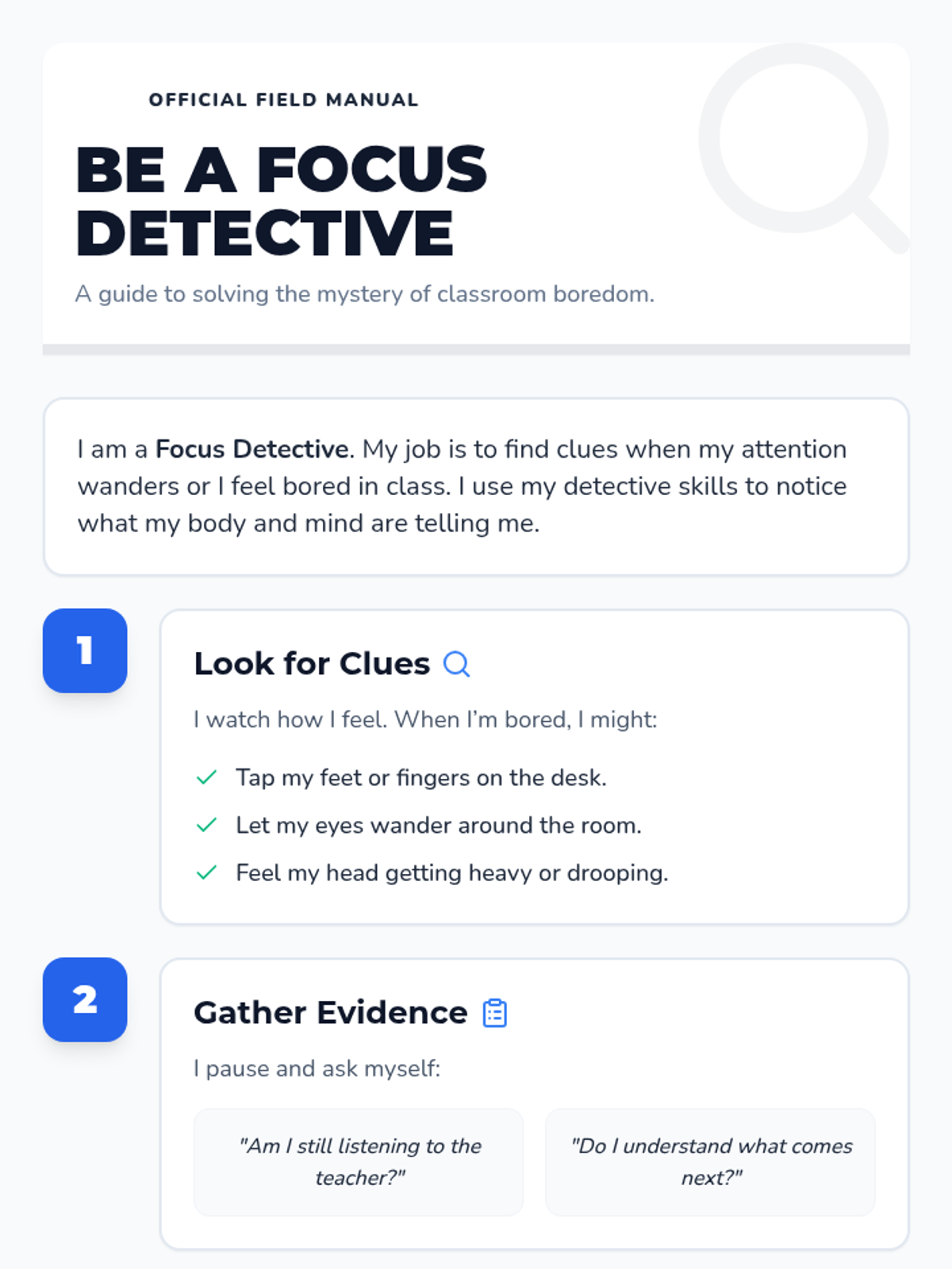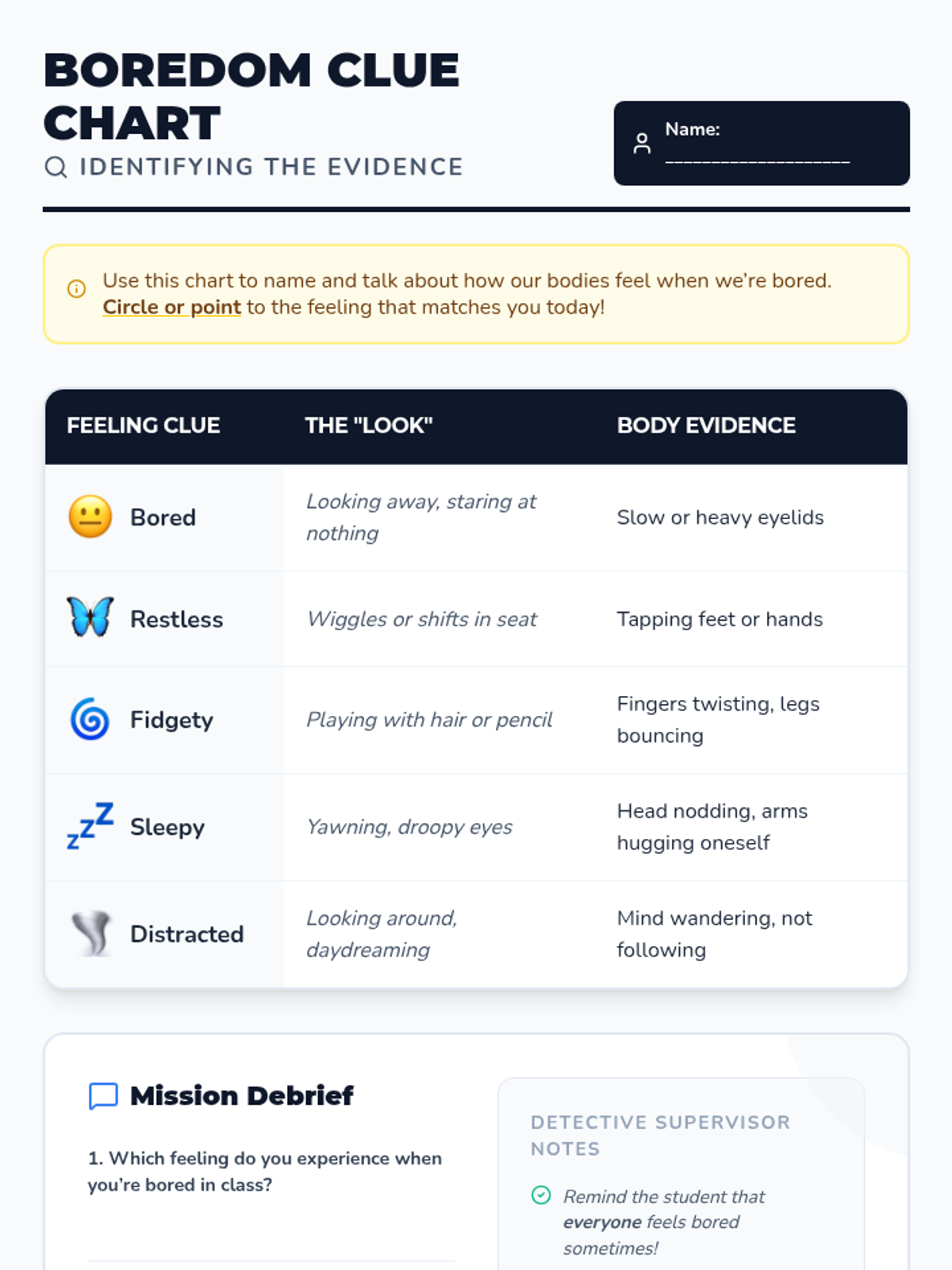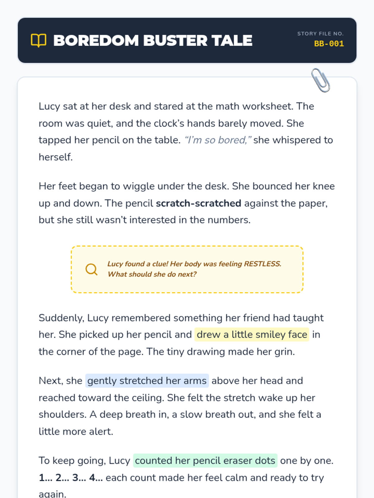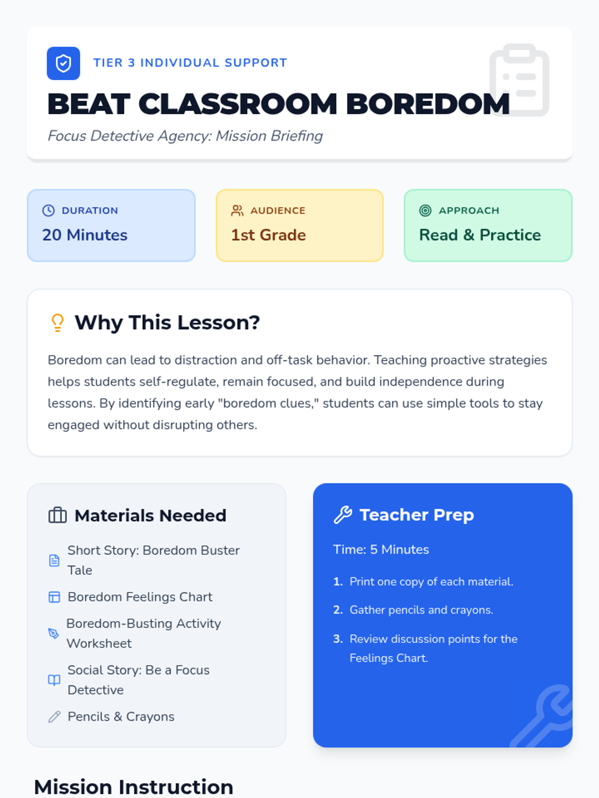 A one-session, 20-minute individual lesson for a first-grade student to learn self-regulation strategies for classroom boredom through stories, discussion, and practice.
