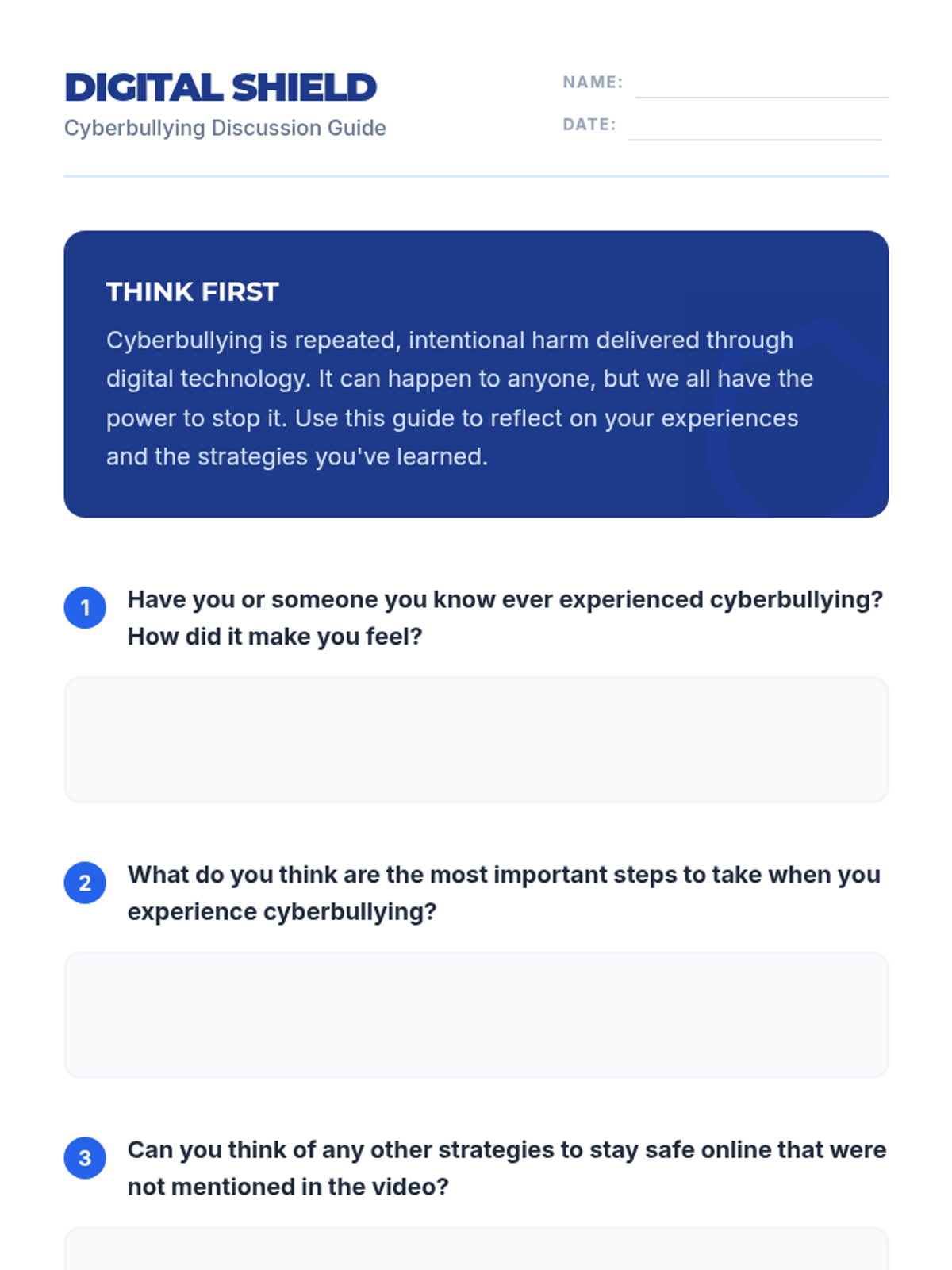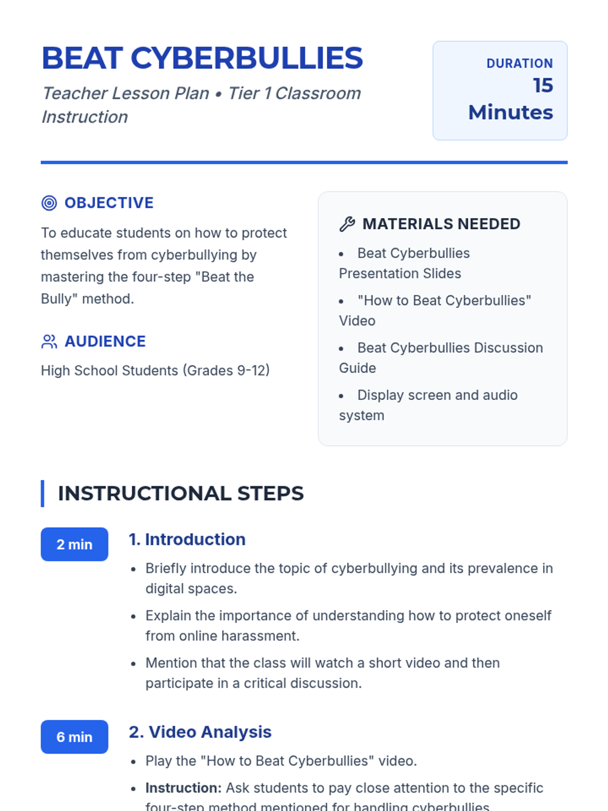 This lesson educates high school students on how to protect themselves from cyberbullying using a four-step method: Privacy, No Retaliation, Blocking, and Reporting. it includes a video analysis and interactive group discussion.