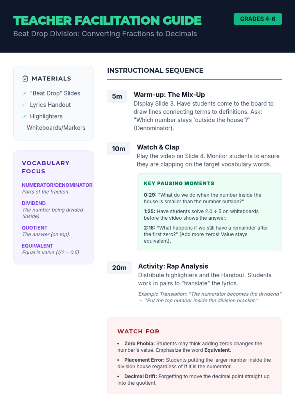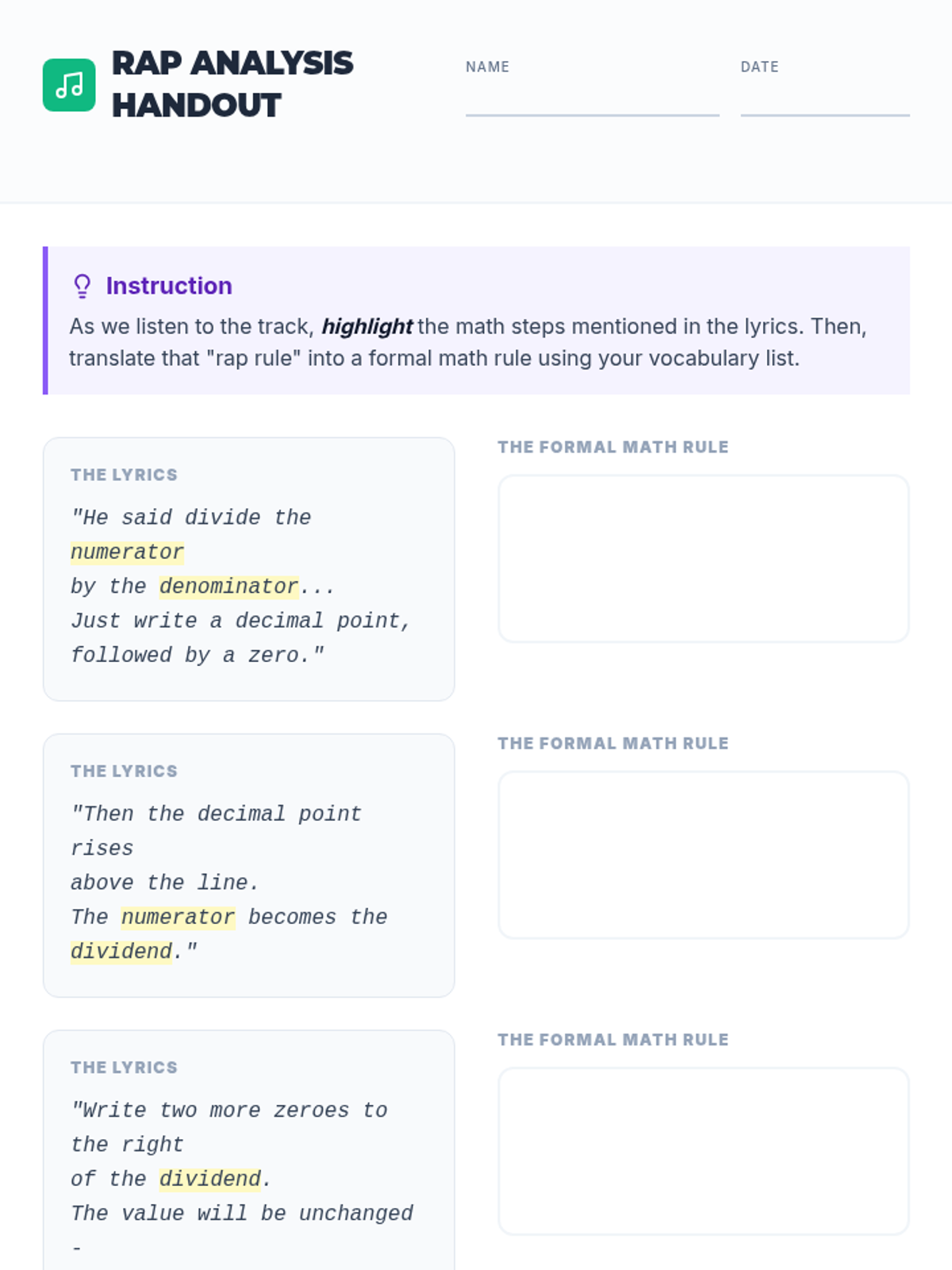 A music-infused lesson where students analyze a math rap to master vocabulary and the process of converting fractions to decimals using long division.