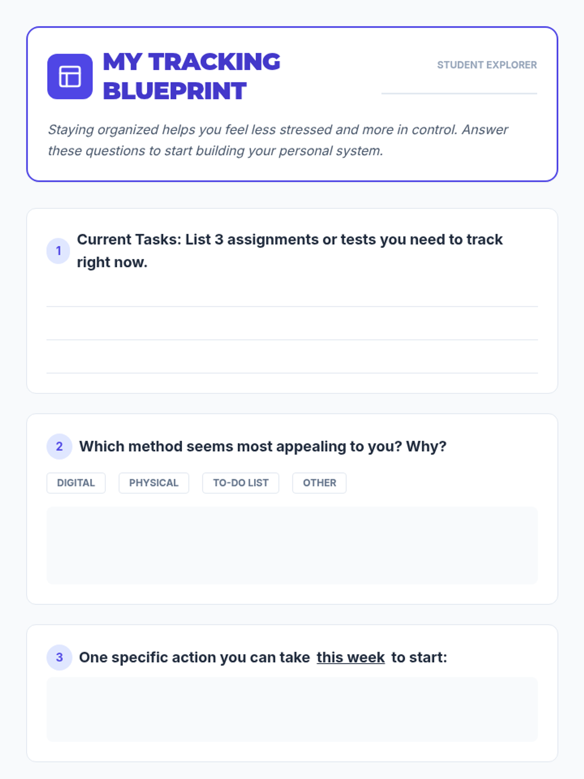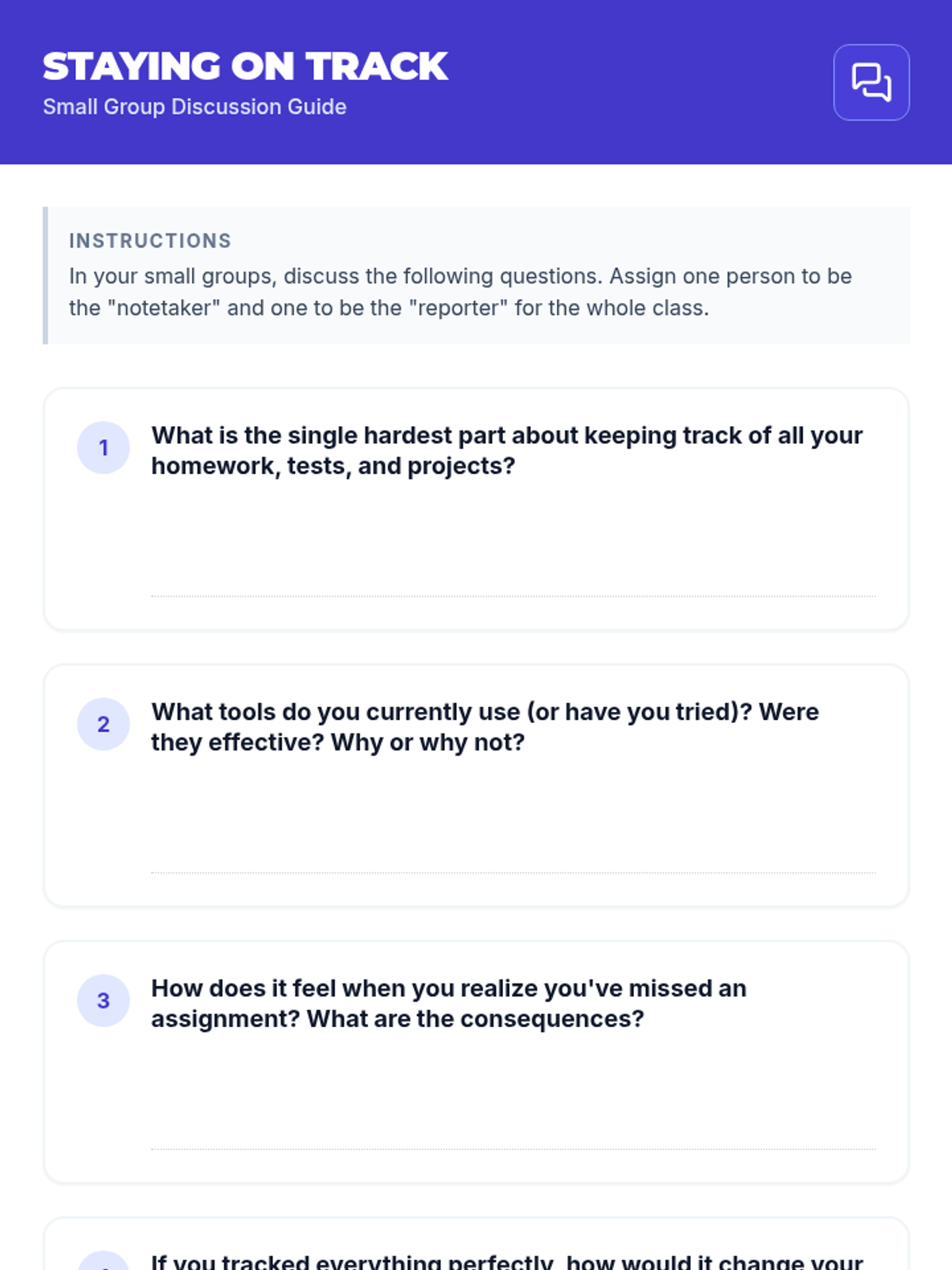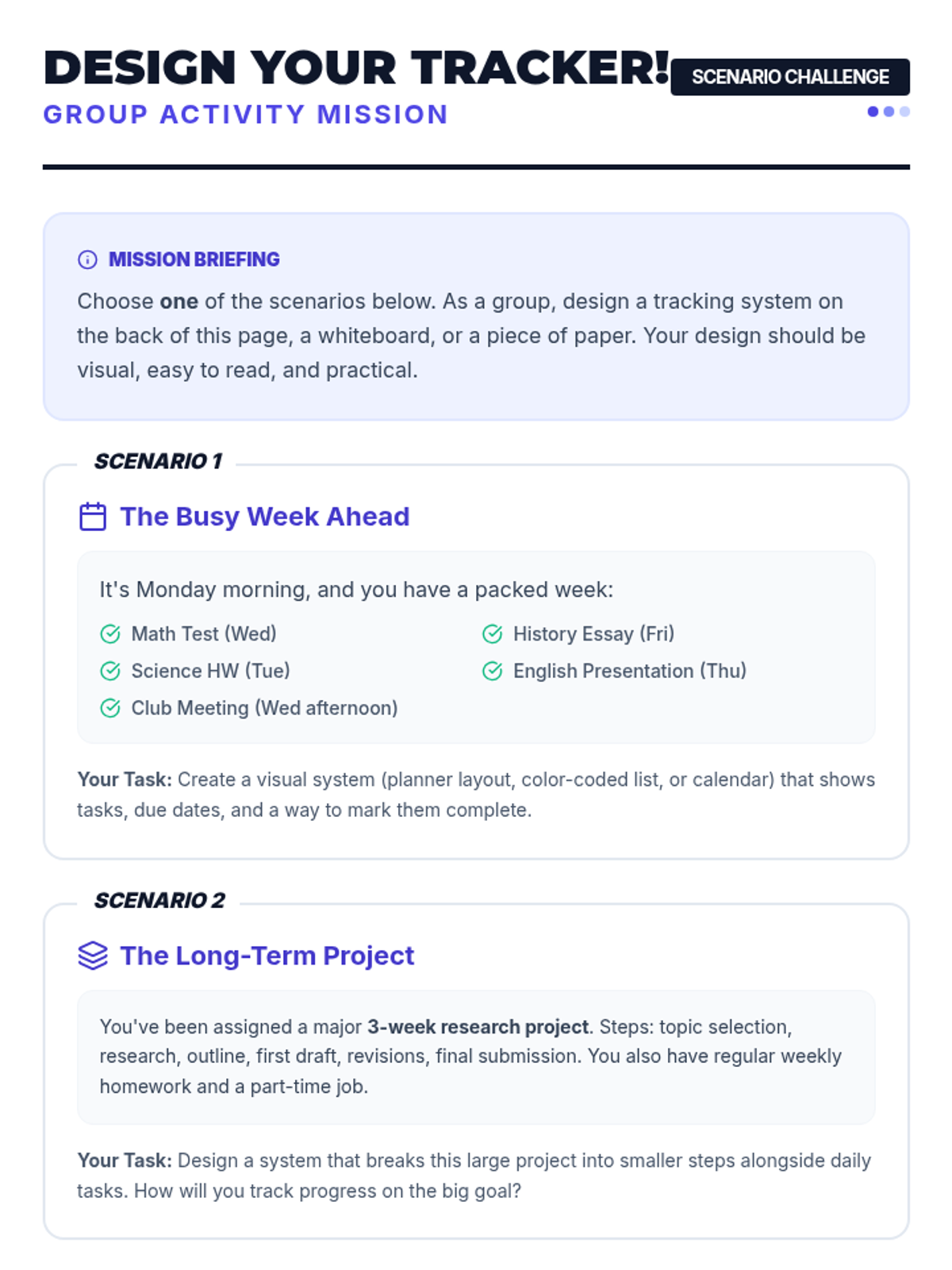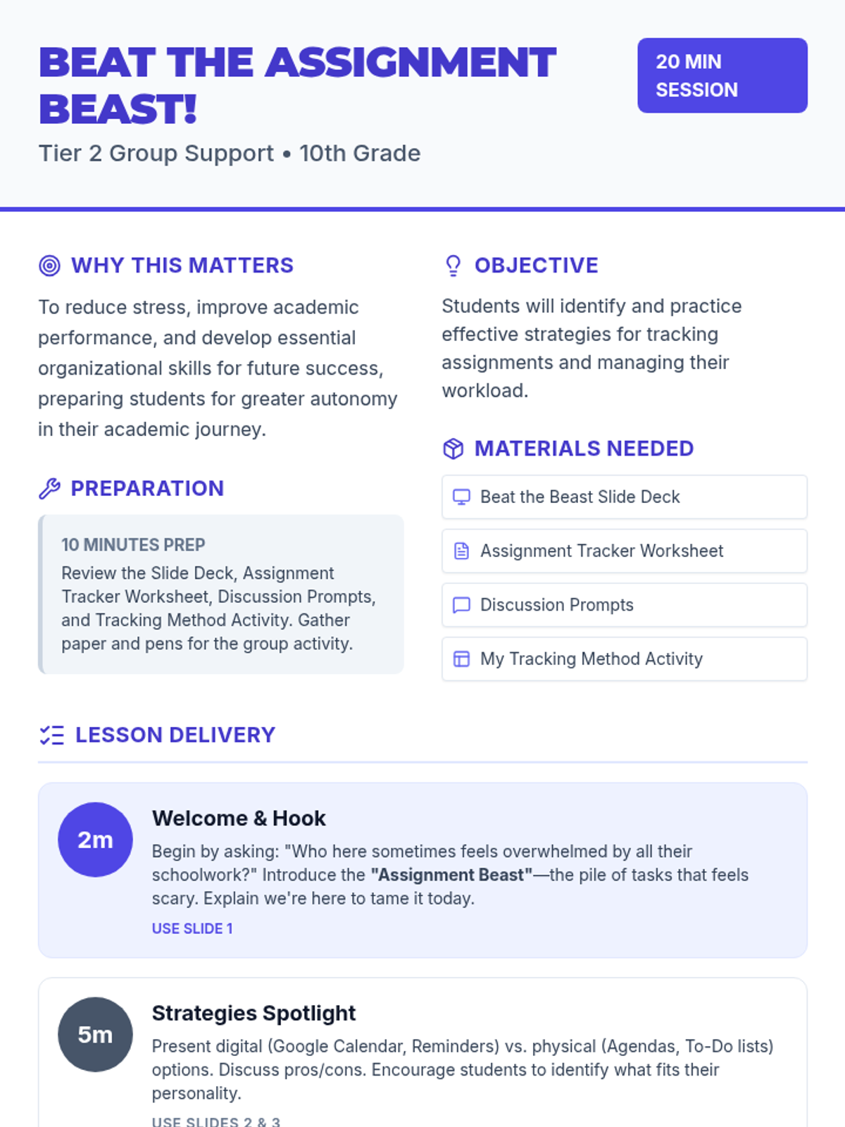 A 20-minute Tier 2 group lesson for 10th graders focused on mastering assignment tracking to reduce stress and improve academic performance. Students explore digital and physical organization strategies through interactive discussion and scenario-based planning.