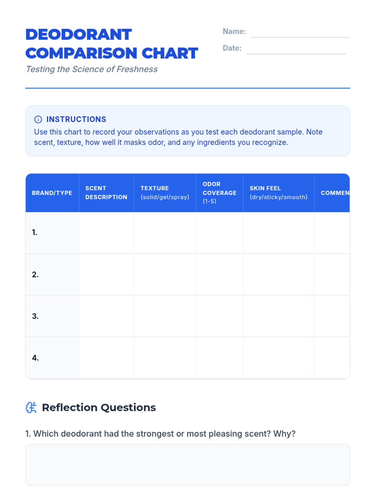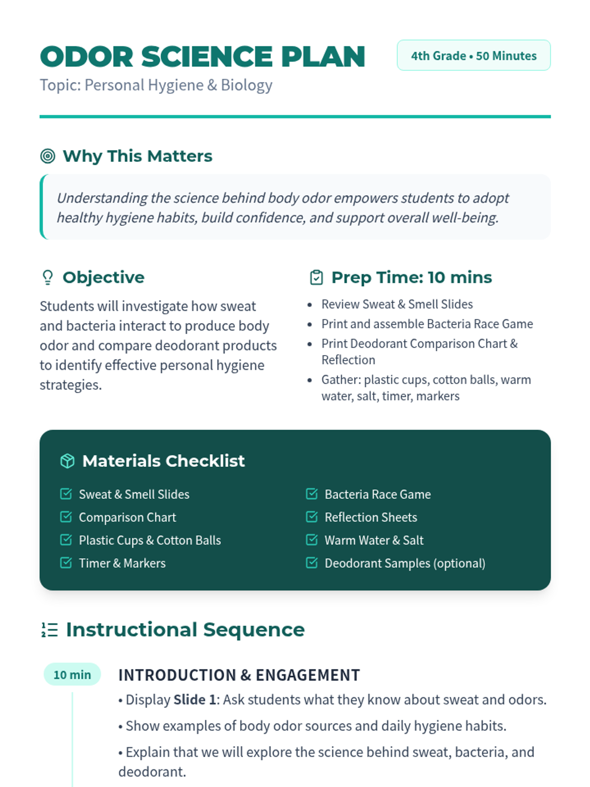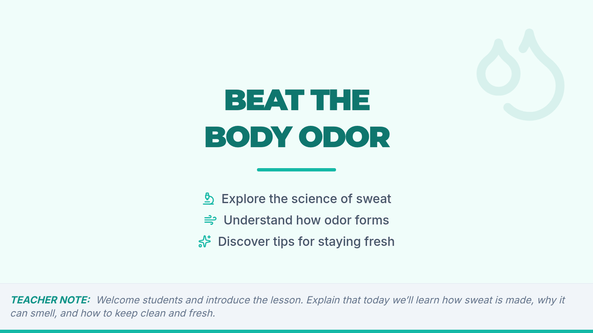 In this 50-minute Tier 1 lesson for 4th graders, students explore the science of sweat, bacteria, and deodorant through hands-on activities that make personal hygiene fun and memorable. This lesson builds understanding of body odor causes and empowers students with practical strategies for daily hygiene.