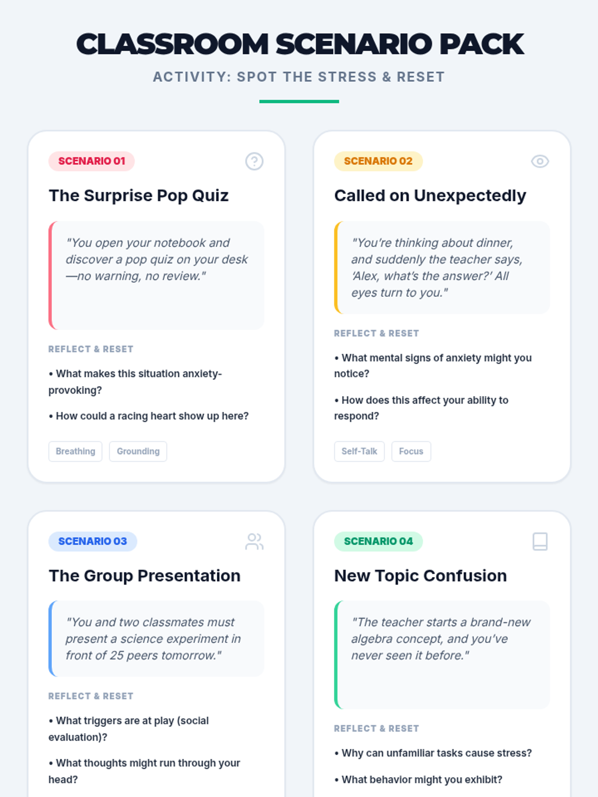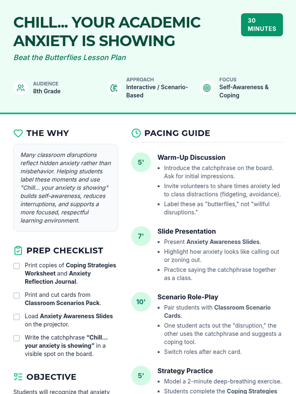 A 30-minute lesson for 8th graders to recognize how academic anxiety drives classroom behavior and learn practical coping strategies to regain focus.