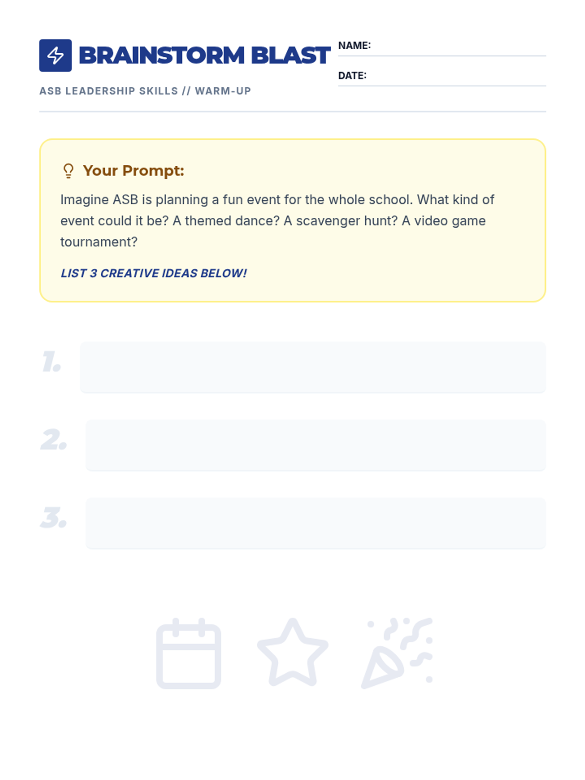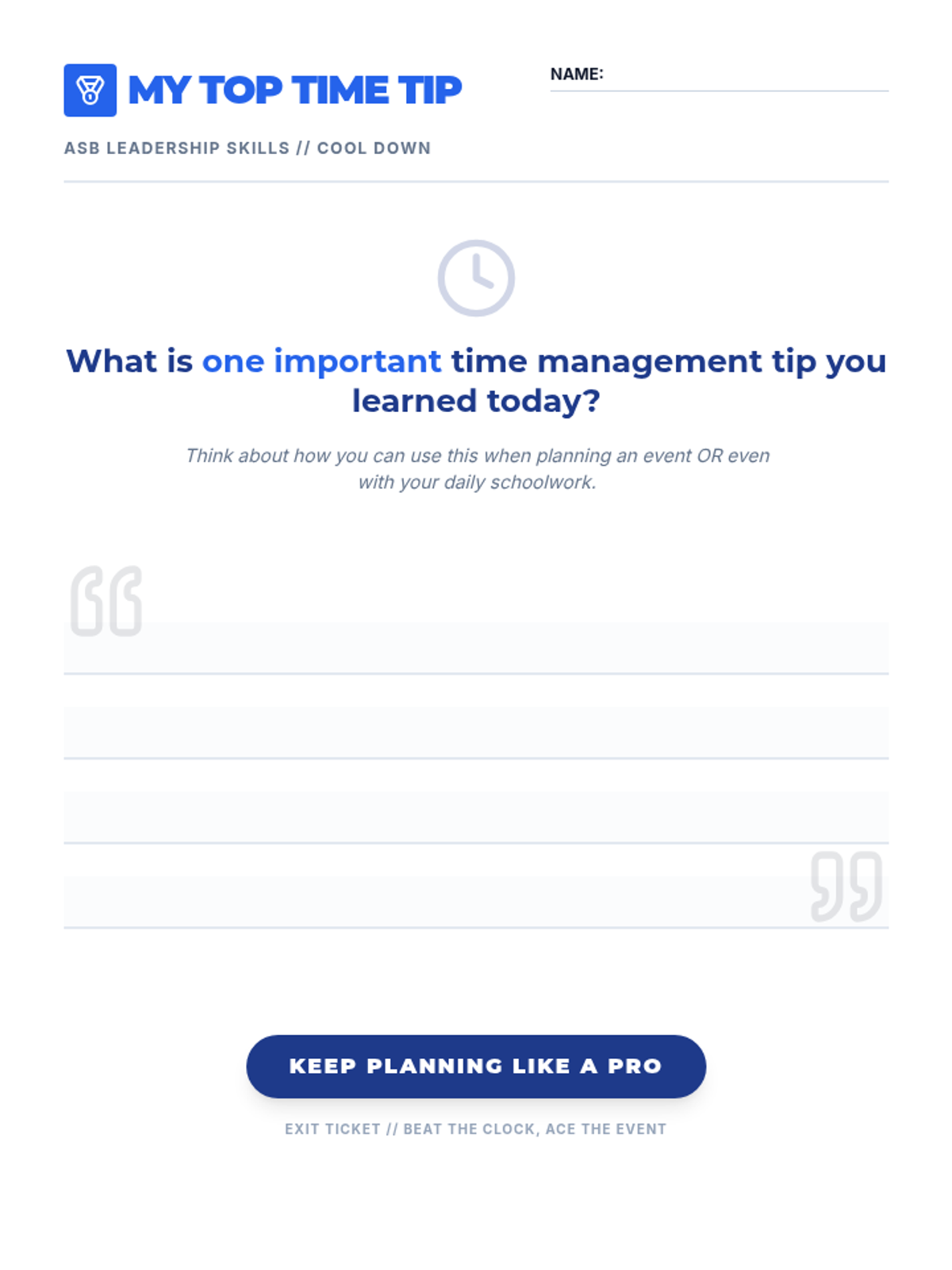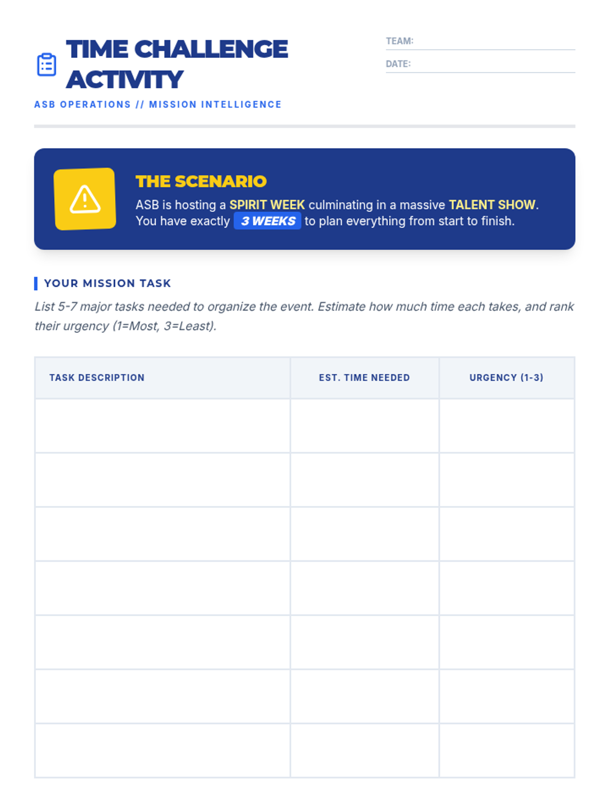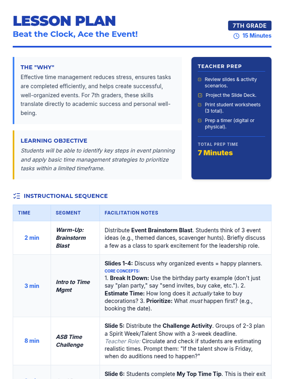 A fast-paced 15-minute lesson for 7th graders on time management skills, using ASB event planning as a high-stakes, engaging scenario. Students learn to break down tasks, estimate time, and prioritize to reach their goals.