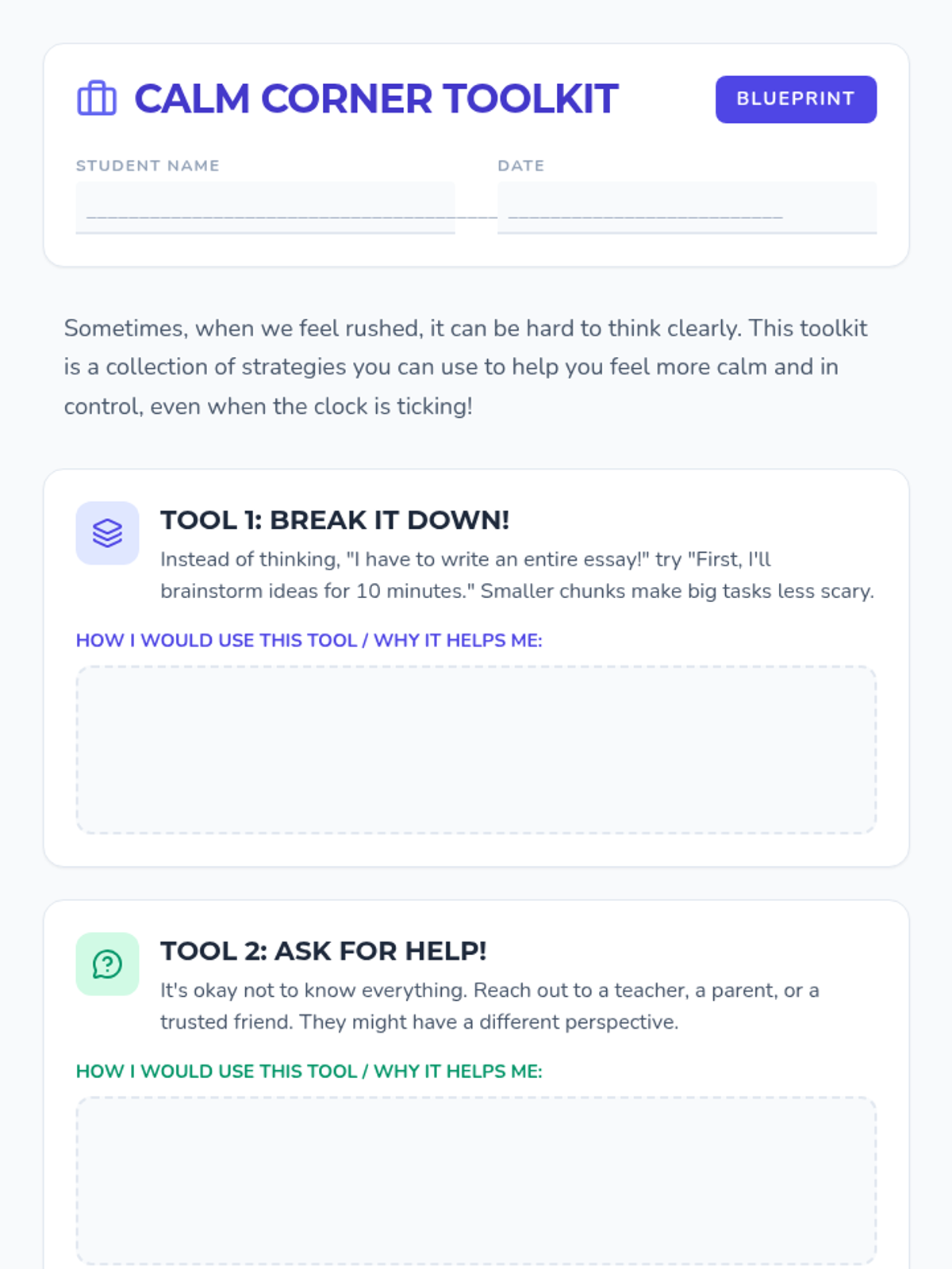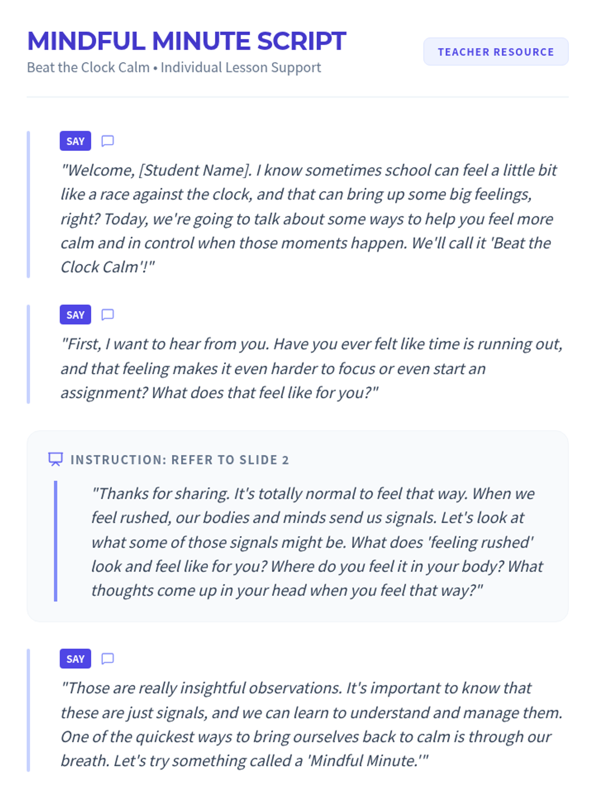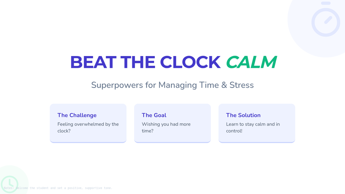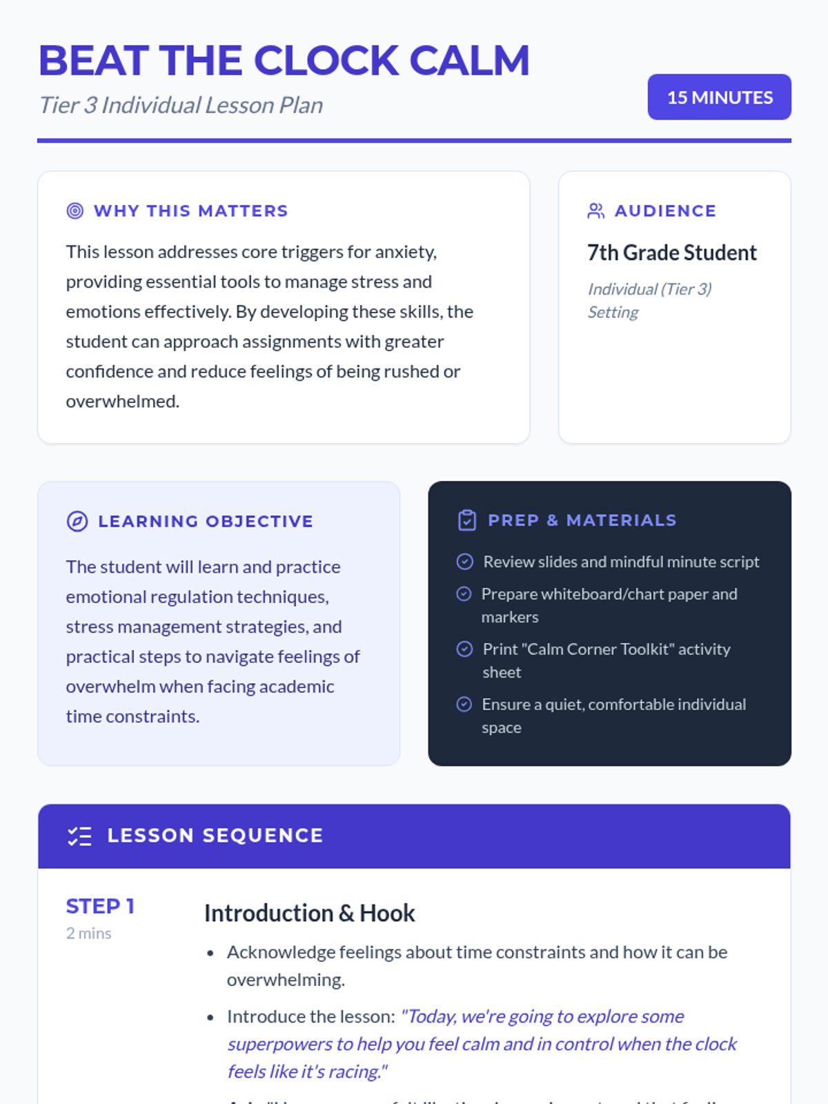 A 15-minute Tier 3 individual lesson for 7th graders to manage stress and emotional regulation when facing academic time constraints. Students learn to recognize stress signals and build a toolkit of calming strategies.
