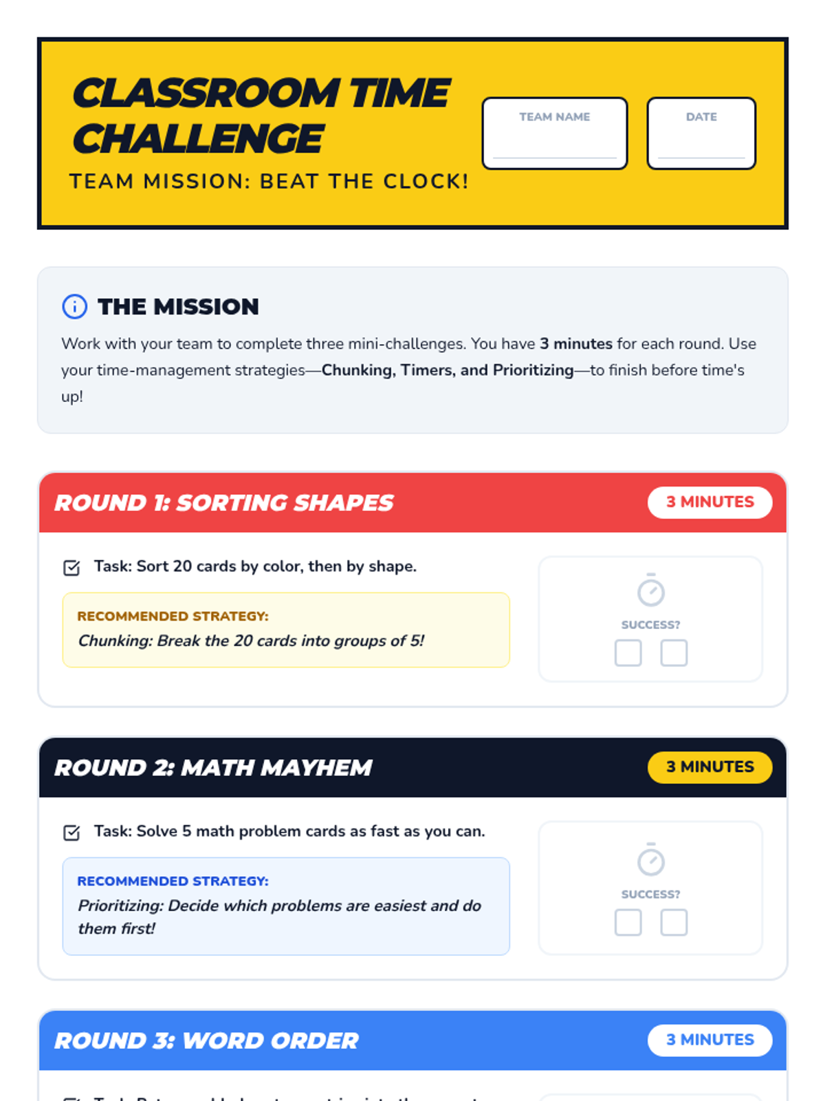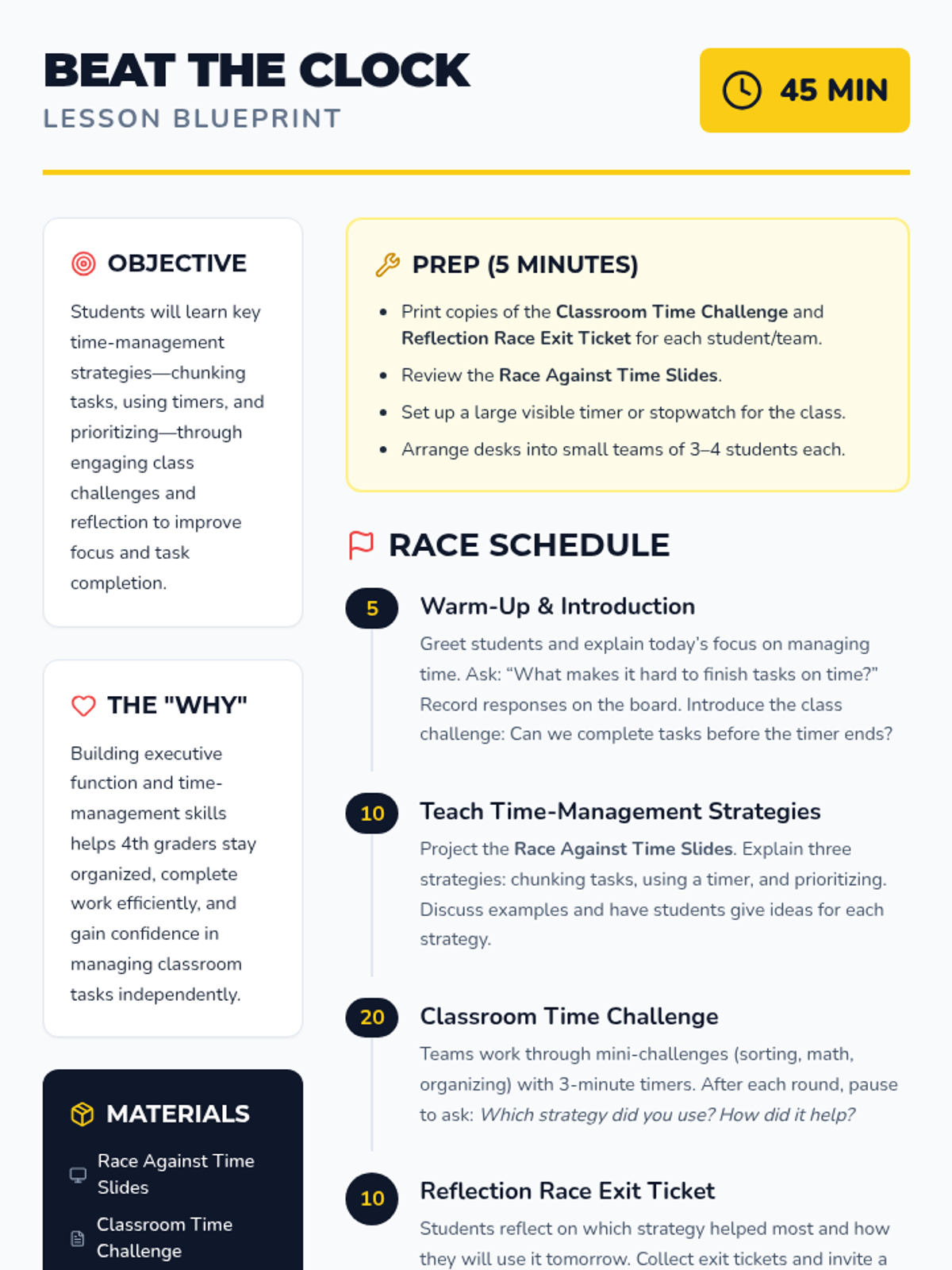 A dynamic lesson that teaches whole-class time-management strategies through engaging challenges, helping students stay on track and manage tasks efficiently.