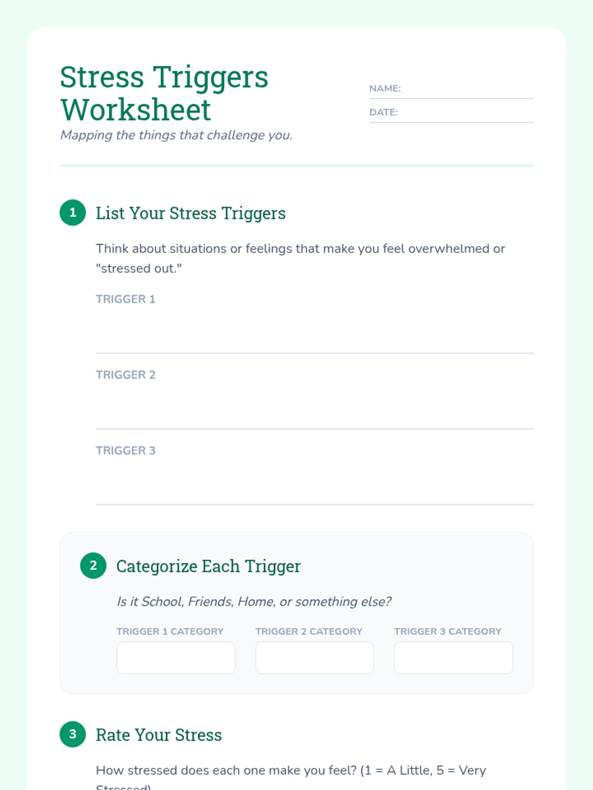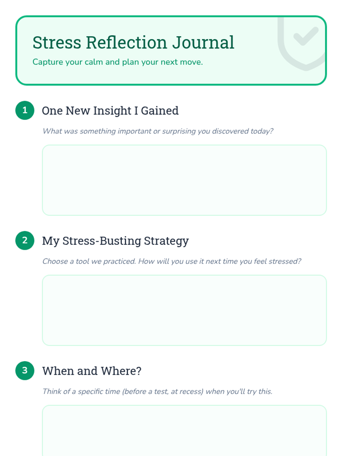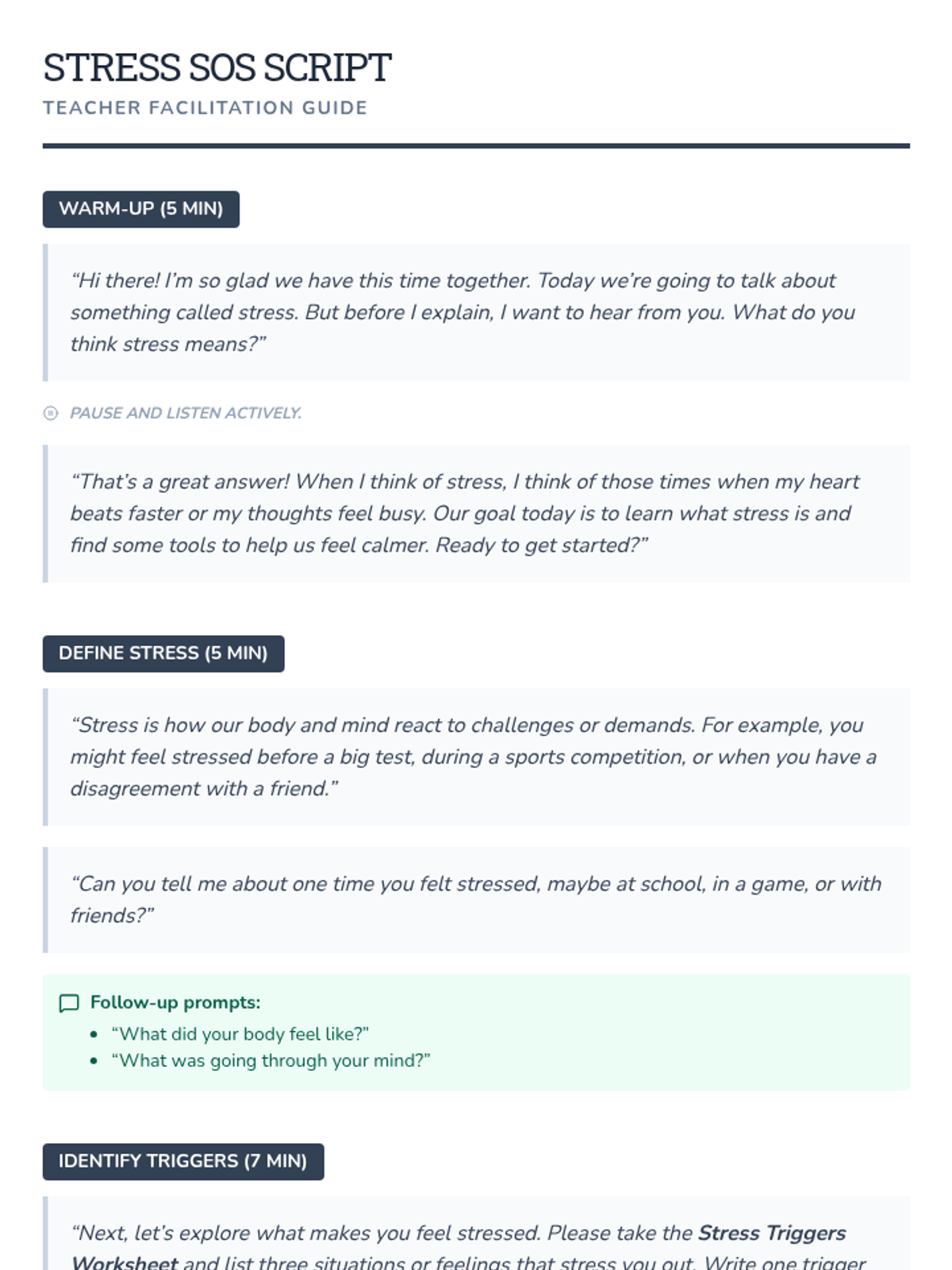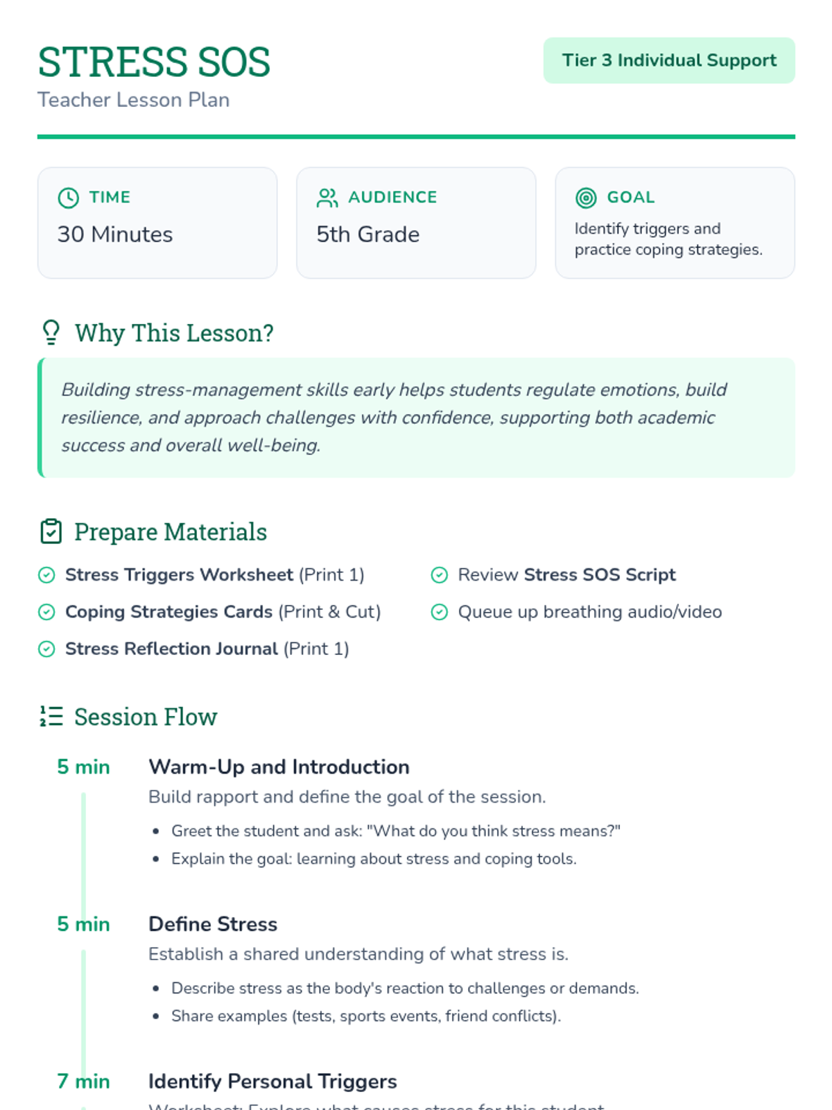 A 30-minute individual Tier 3 support lesson for 5th graders to identify stress triggers and master coping strategies like deep breathing and positive self-talk.