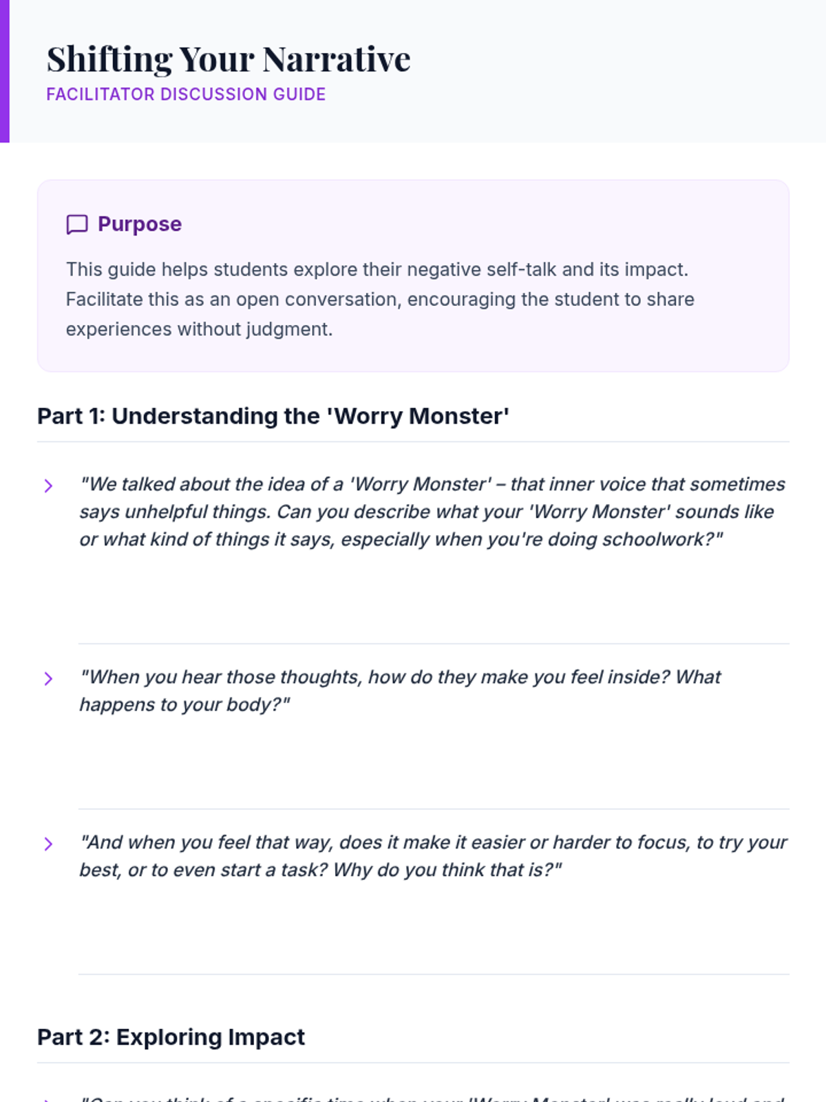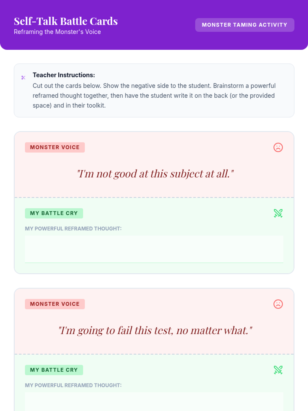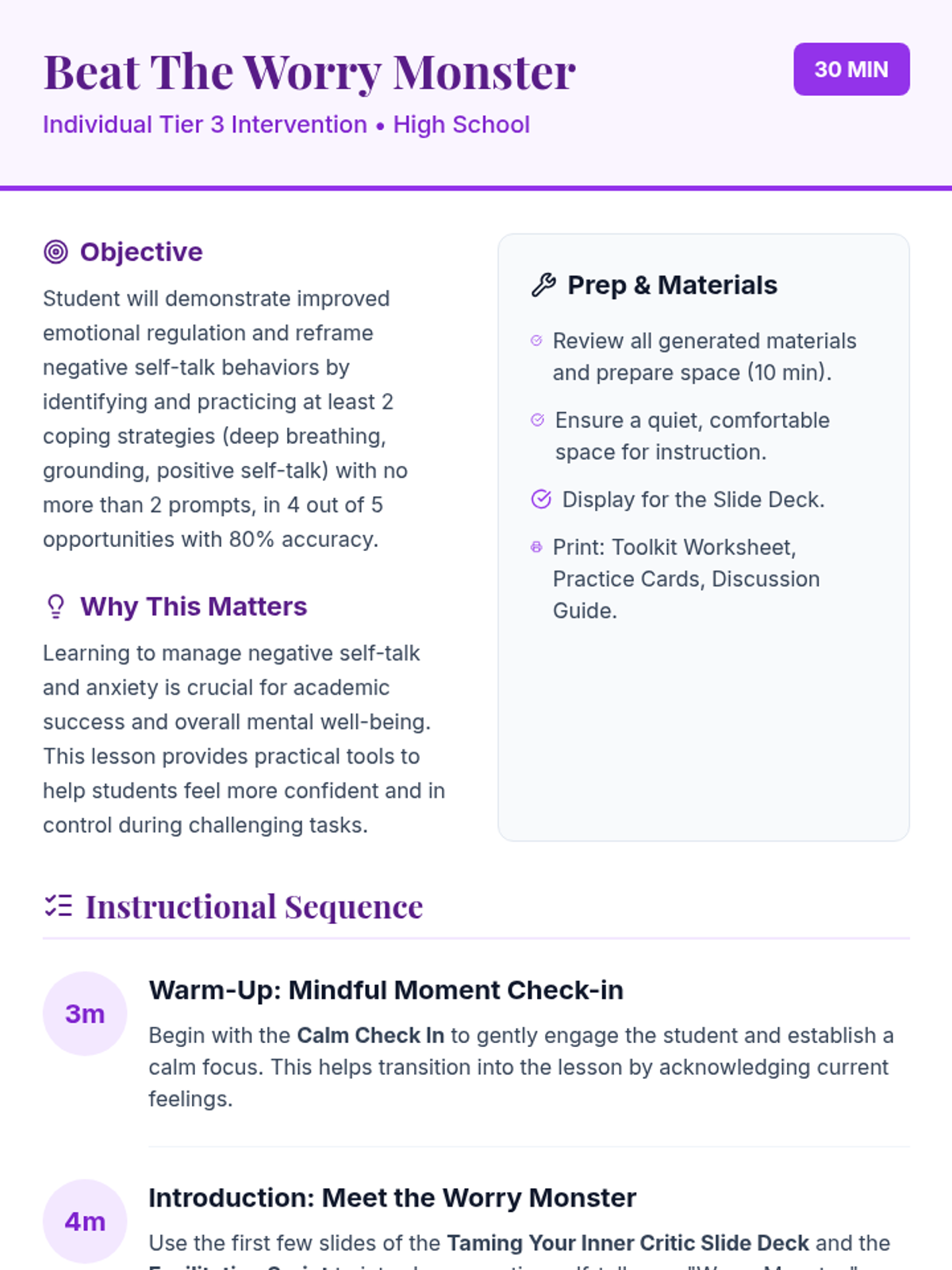 A 30-minute Tier 3 intervention for high school students to manage negative self-talk and academic anxiety using grounding, breathing, and cognitive reframing techniques.