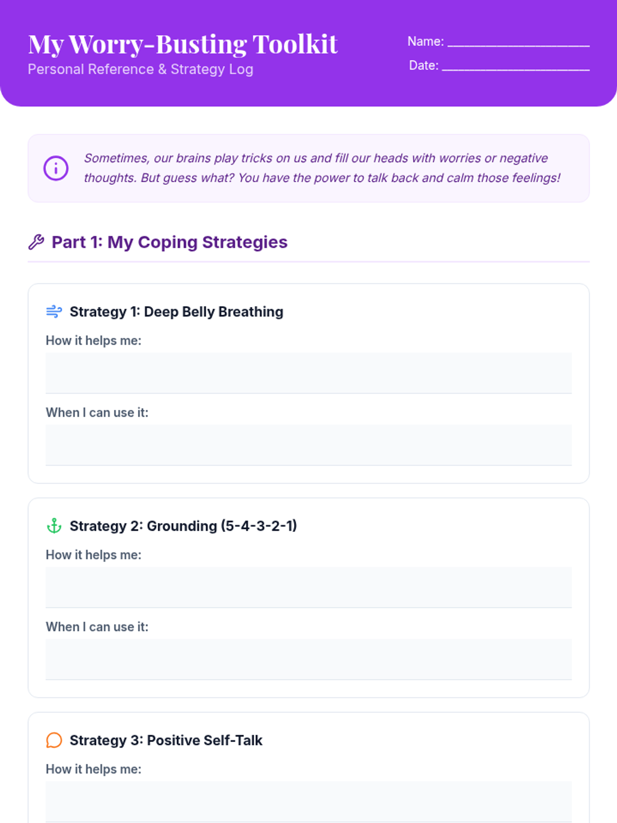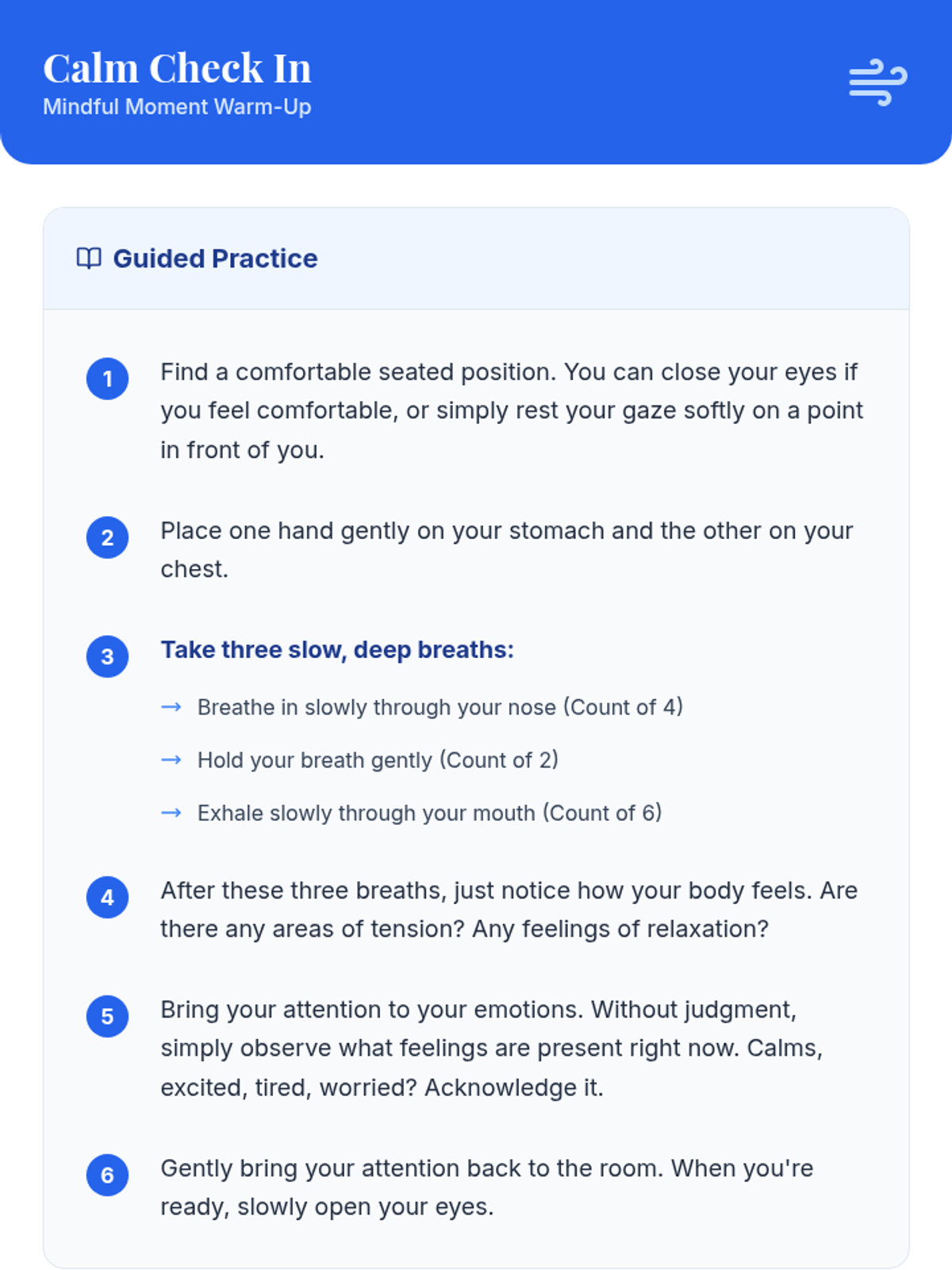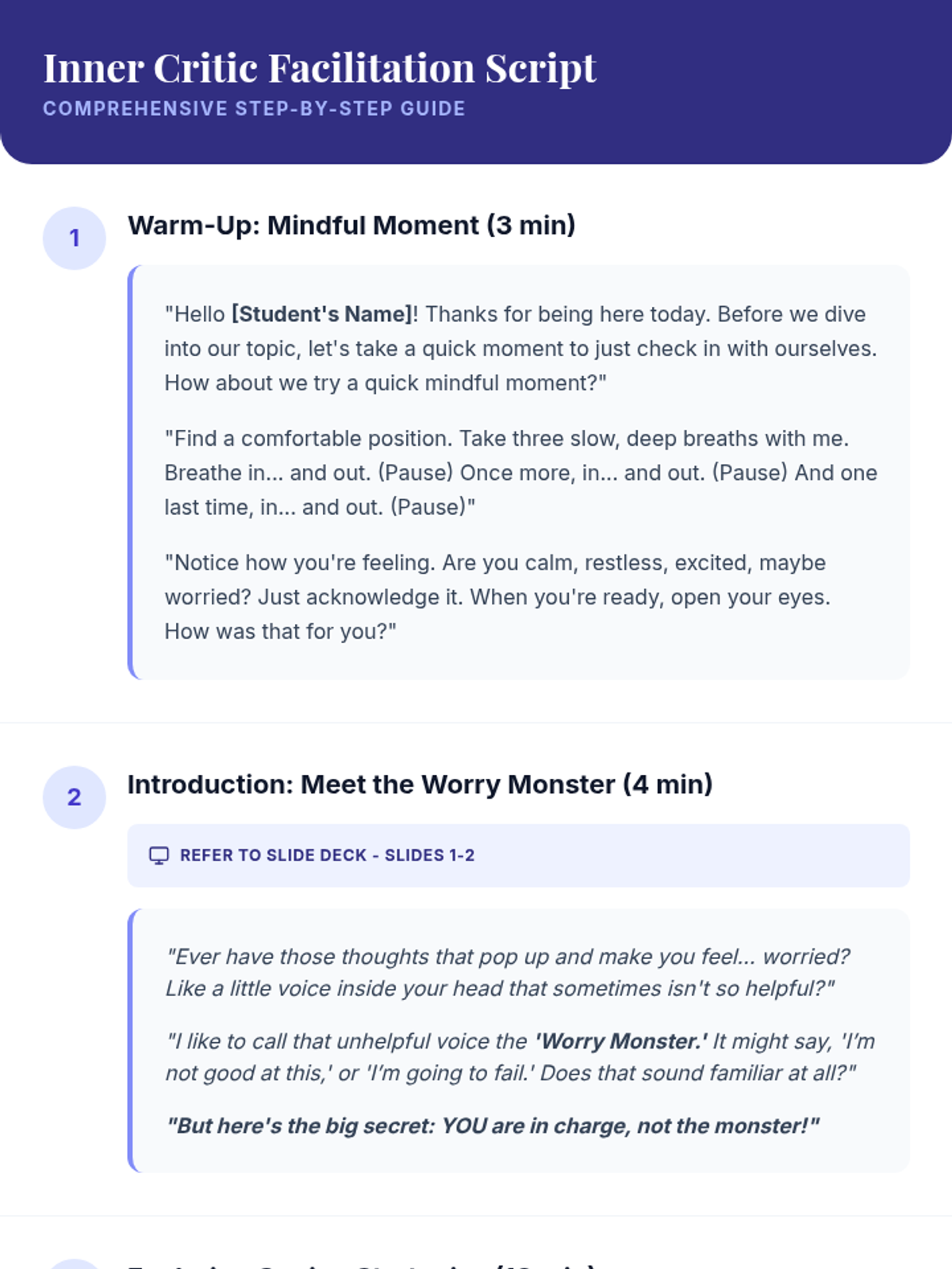A 30-minute Tier 3 intervention for high school students to manage negative self-talk and academic anxiety using grounding, breathing, and cognitive reframing techniques.