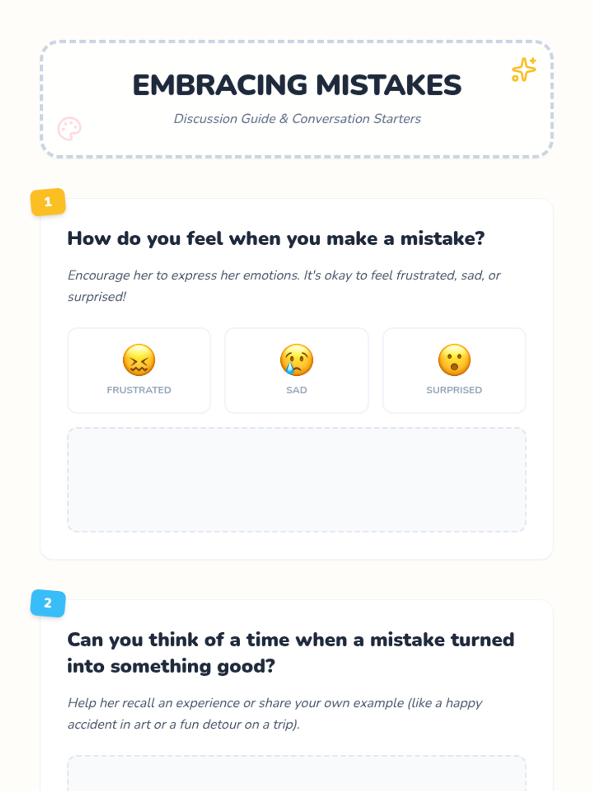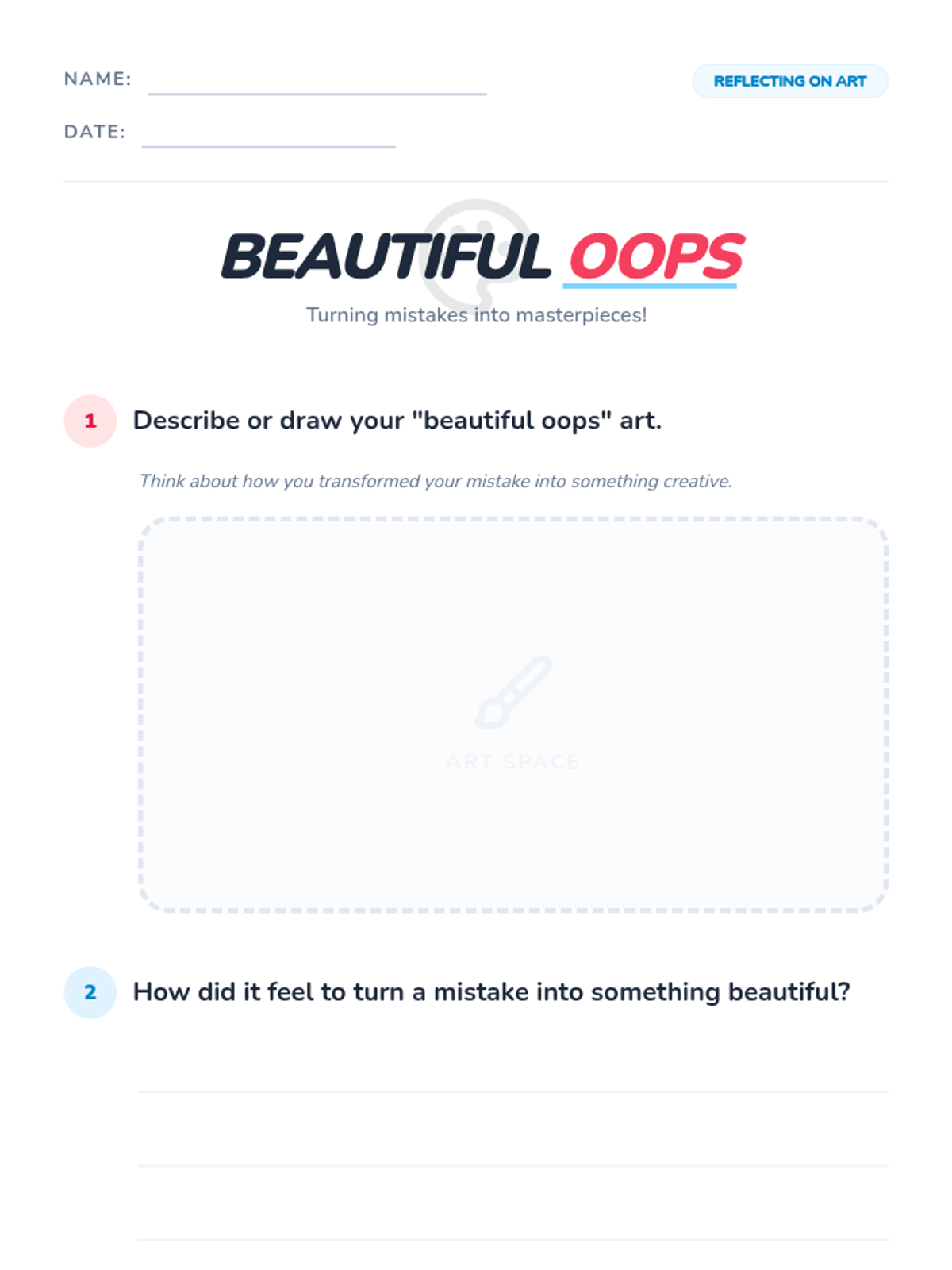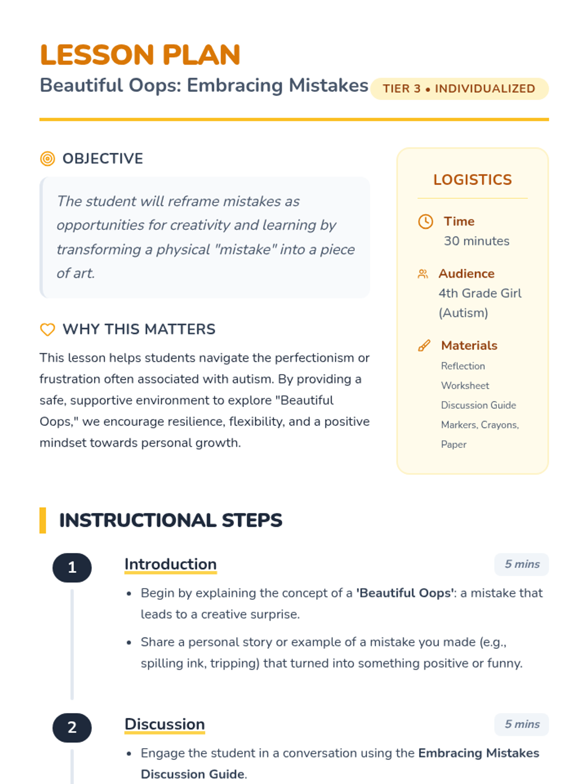 A Tier 3 individualized lesson for a fourth-grade student with autism, focusing on reframing mistakes as creative opportunities. Inspired by the 'Beautiful Oops' concept, the lesson uses art and reflection to build resilience and a growth mindset.