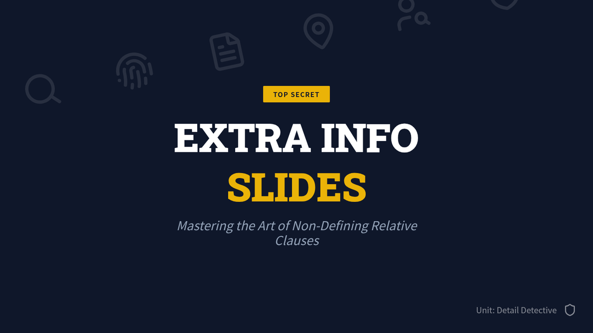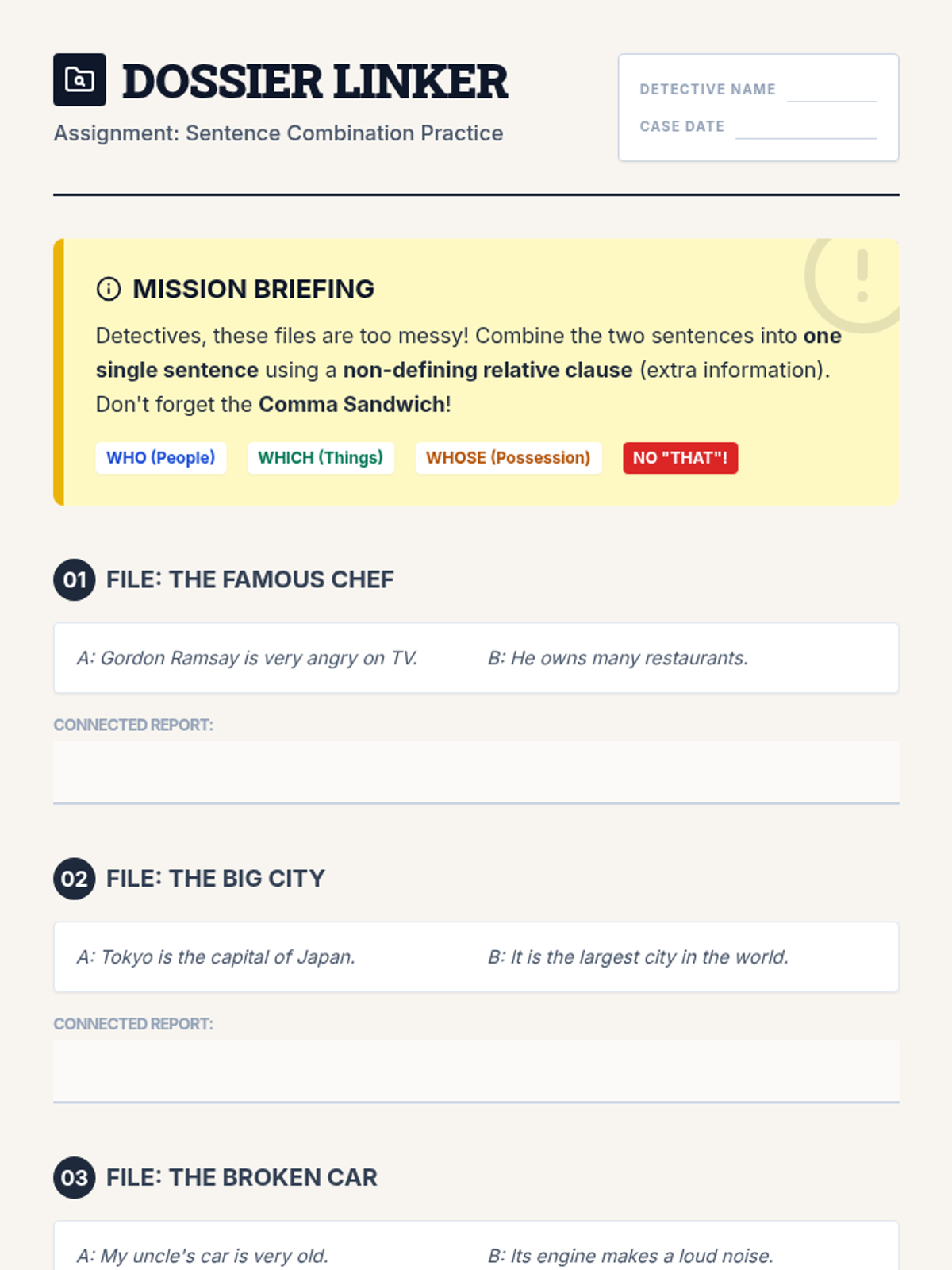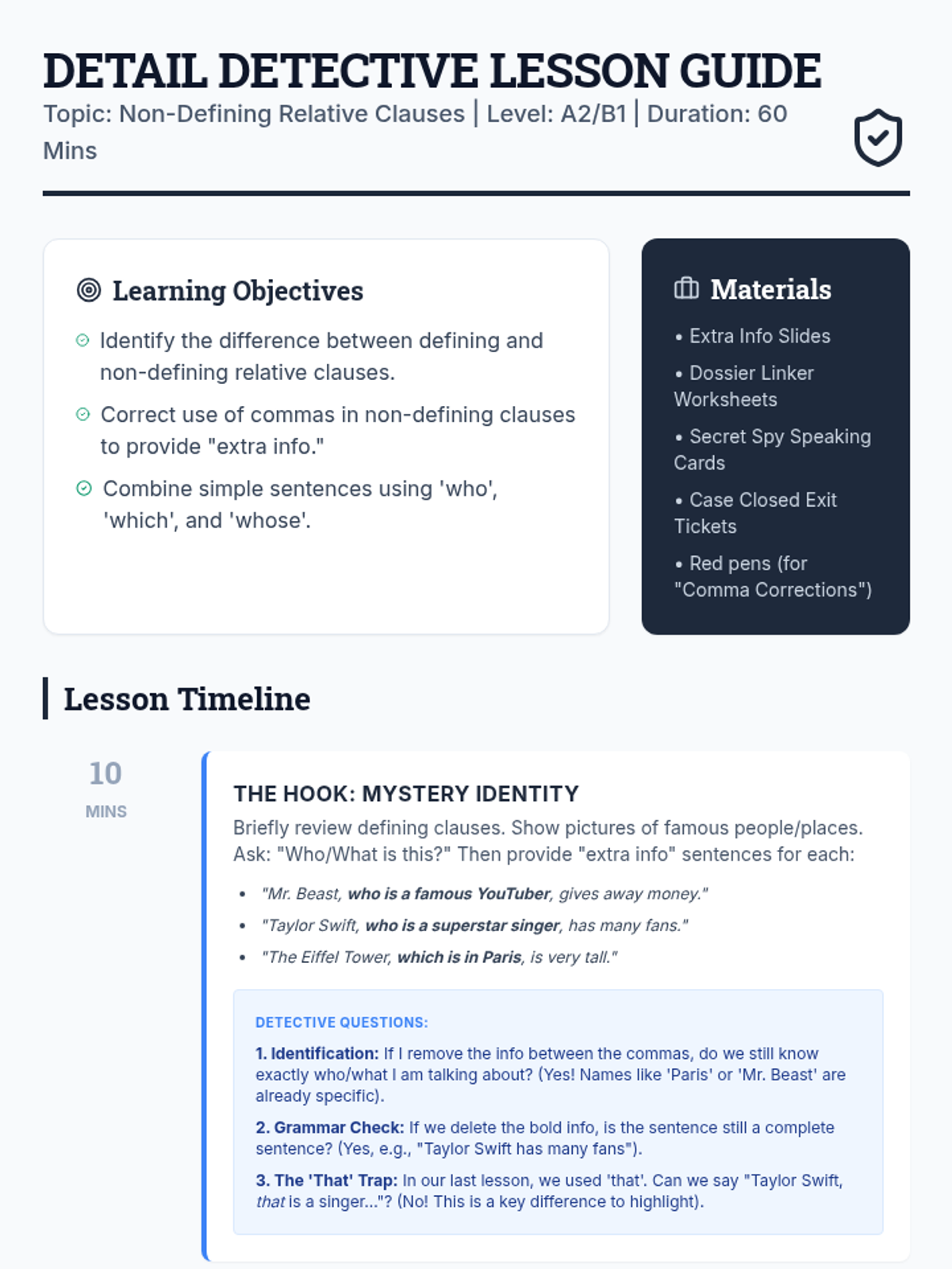 A 60-minute ESL lesson for A2 students focused on non-defining relative clauses through a 'Detail Detective' theme, featuring sentence combining, speaking cards, and comma mastery.