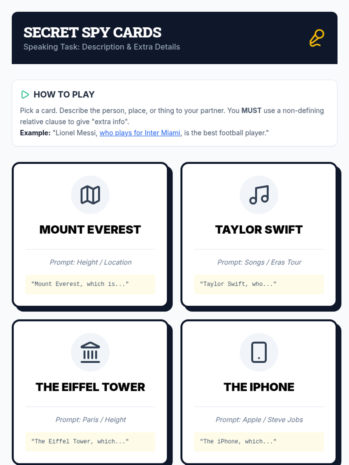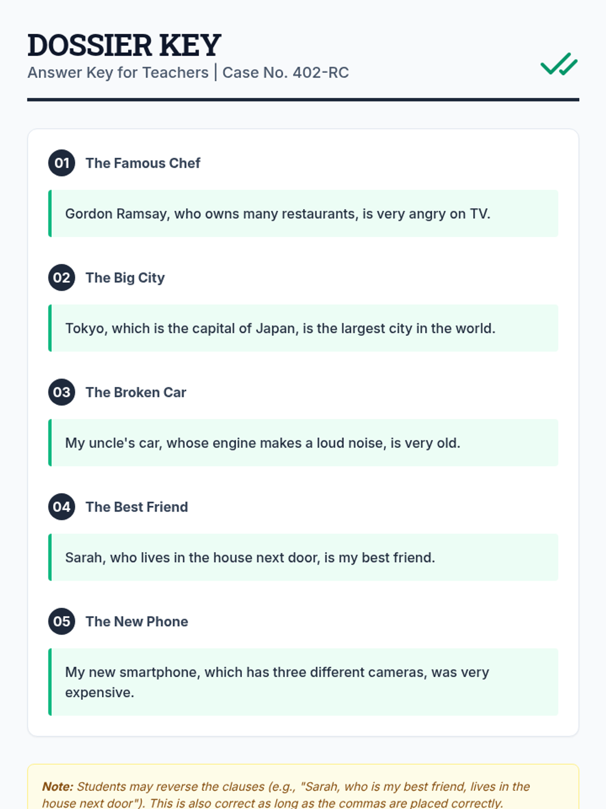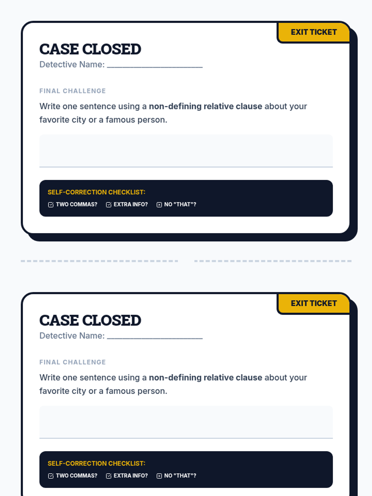 A 60-minute ESL lesson for A2 students focused on non-defining relative clauses through a 'Detail Detective' theme, featuring sentence combining, speaking cards, and comma mastery.