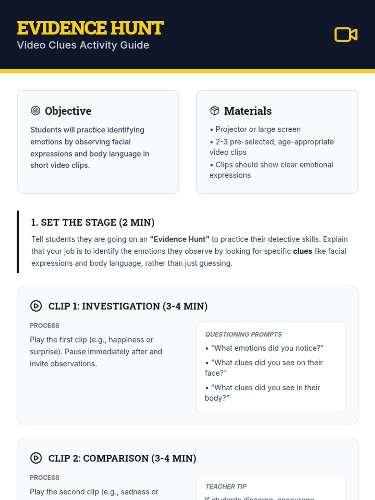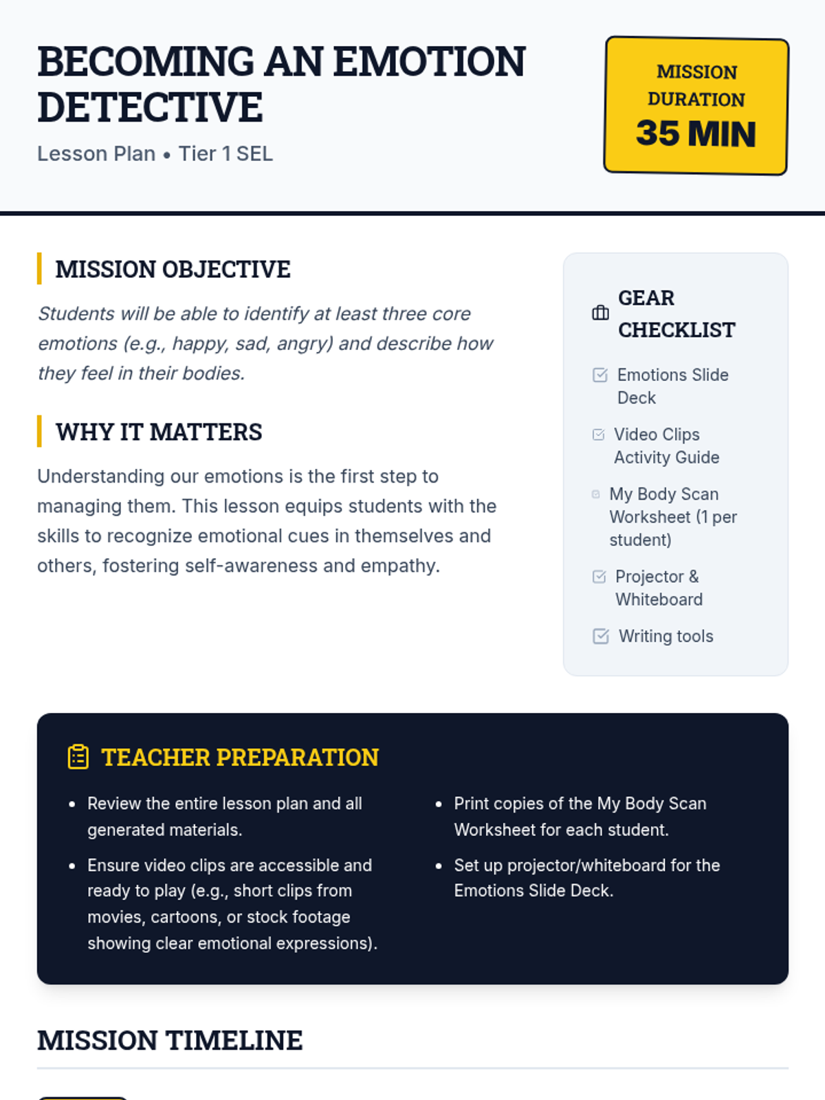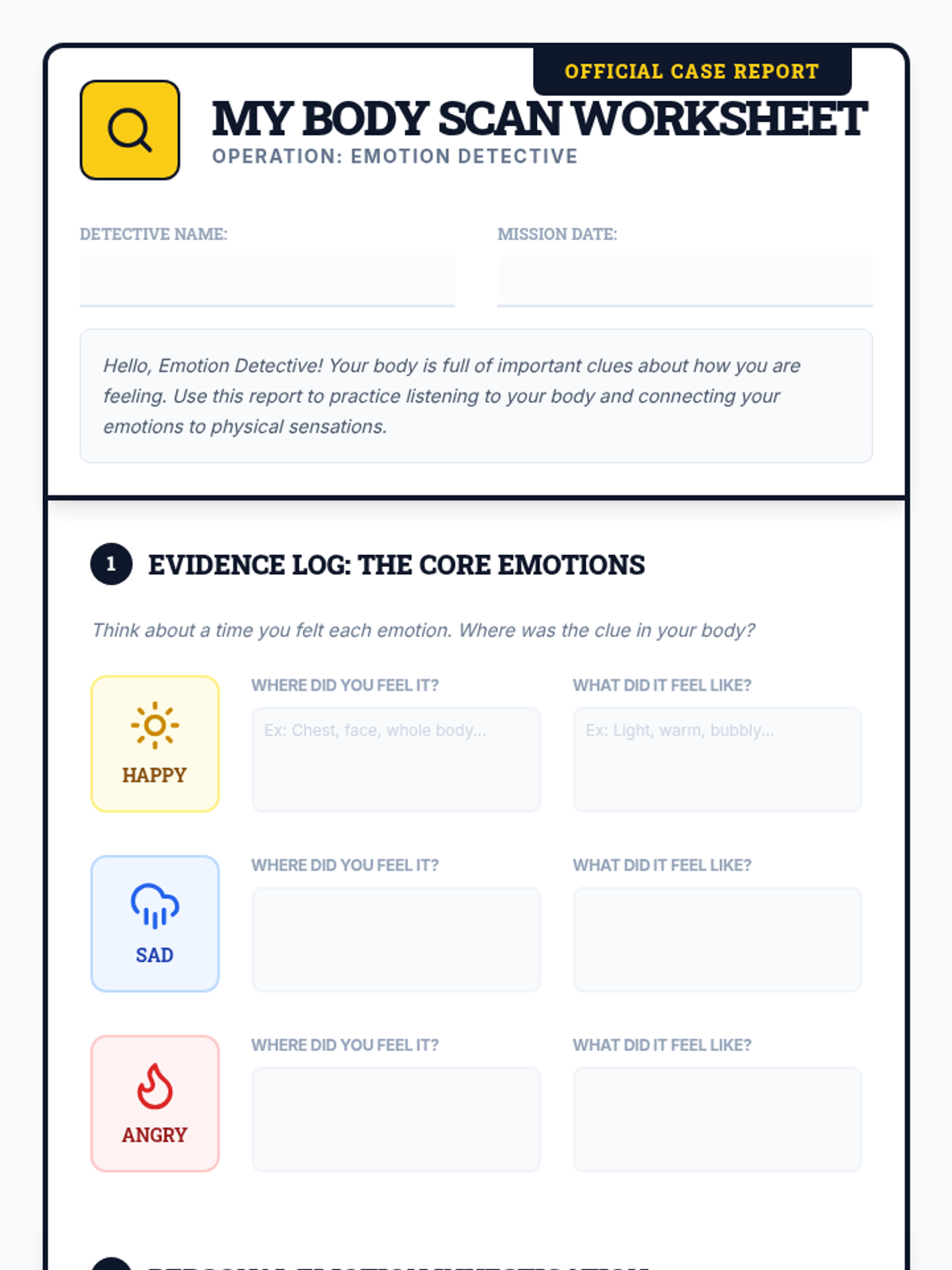 A 35-minute lesson for 5th graders to identify core emotions and physical sensations using a detective-themed approach to self-awareness.