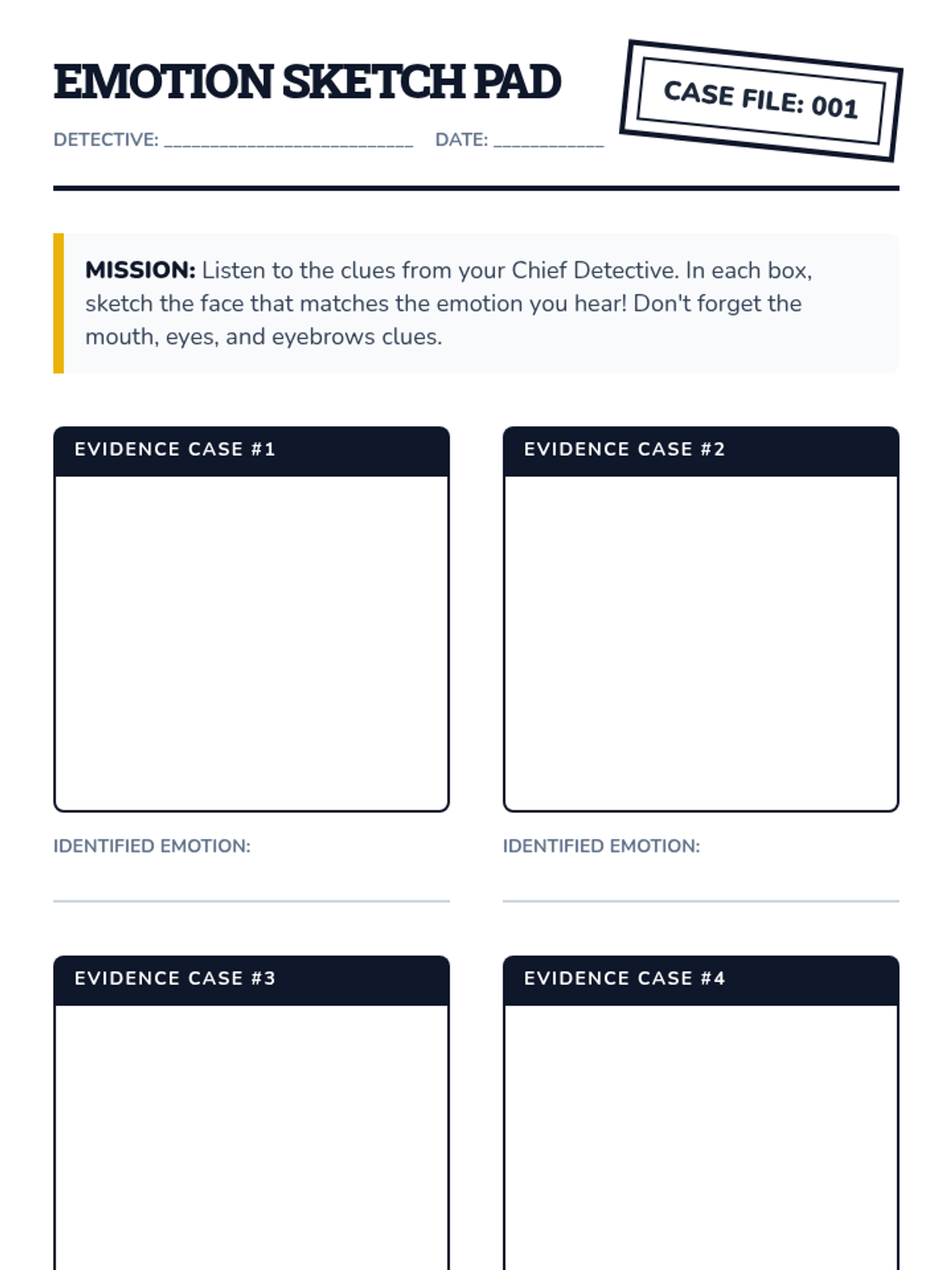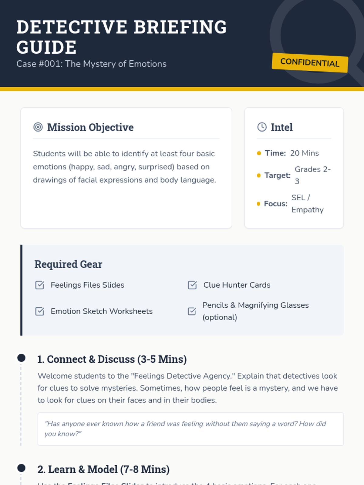 A 20-minute SEL lesson for grades 2-3 focused on identifying basic emotions through facial expressions and body language using a fun detective theme.