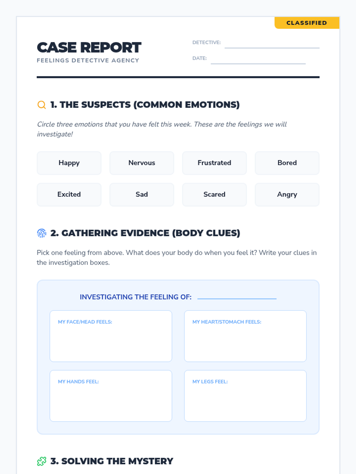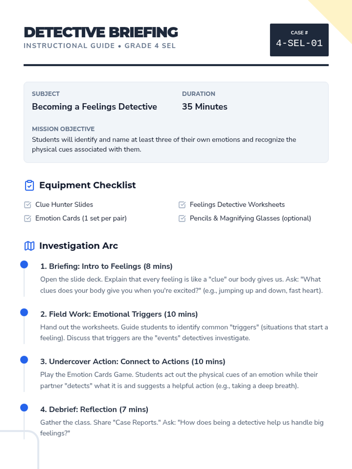 A 4th-grade social-emotional learning lesson where students become 'Feelings Detectives' to identify their own emotions and physical cues through investigation and play.