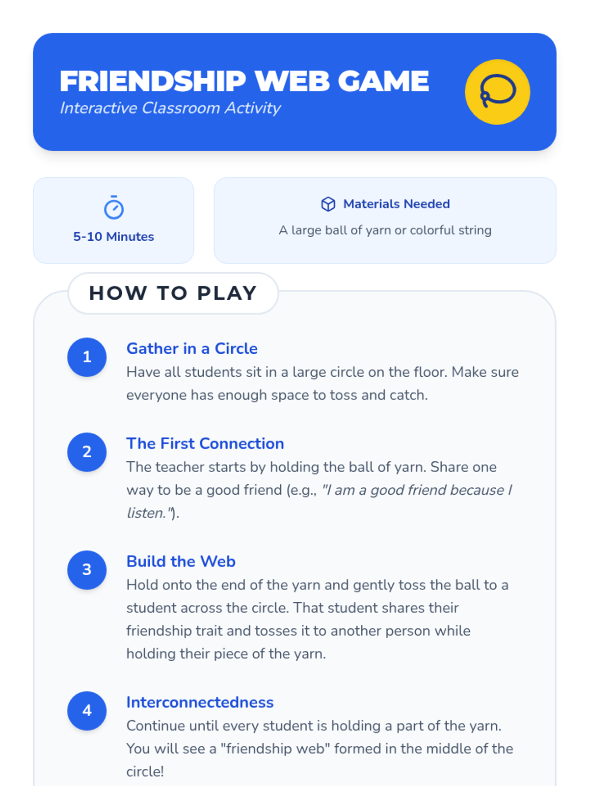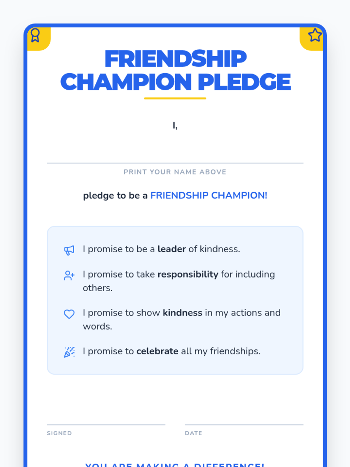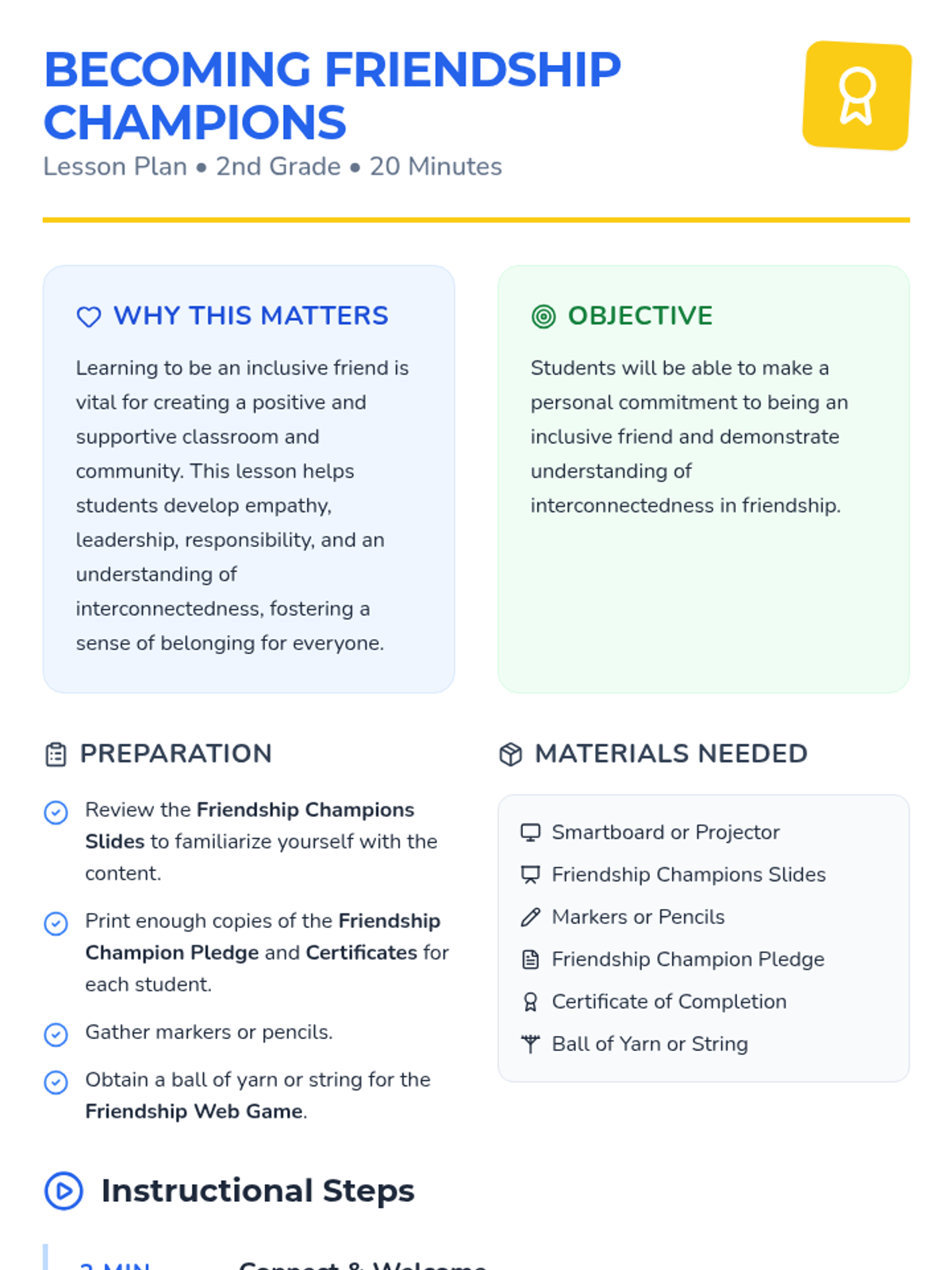 A 20-minute lesson for 2nd-grade students focused on inclusive friendship, leadership, and kindness through discussion, an interactive game, and a personal pledge.