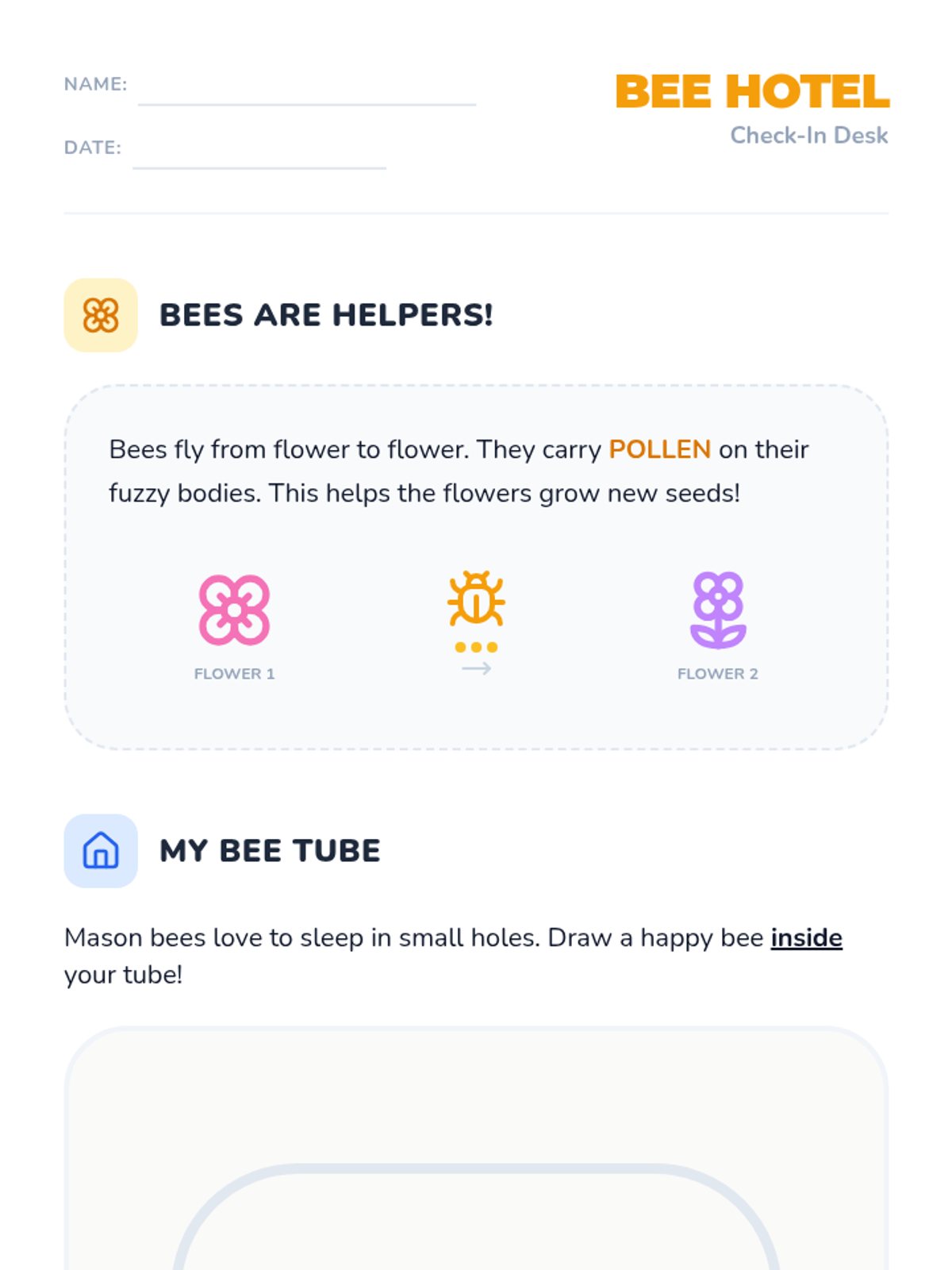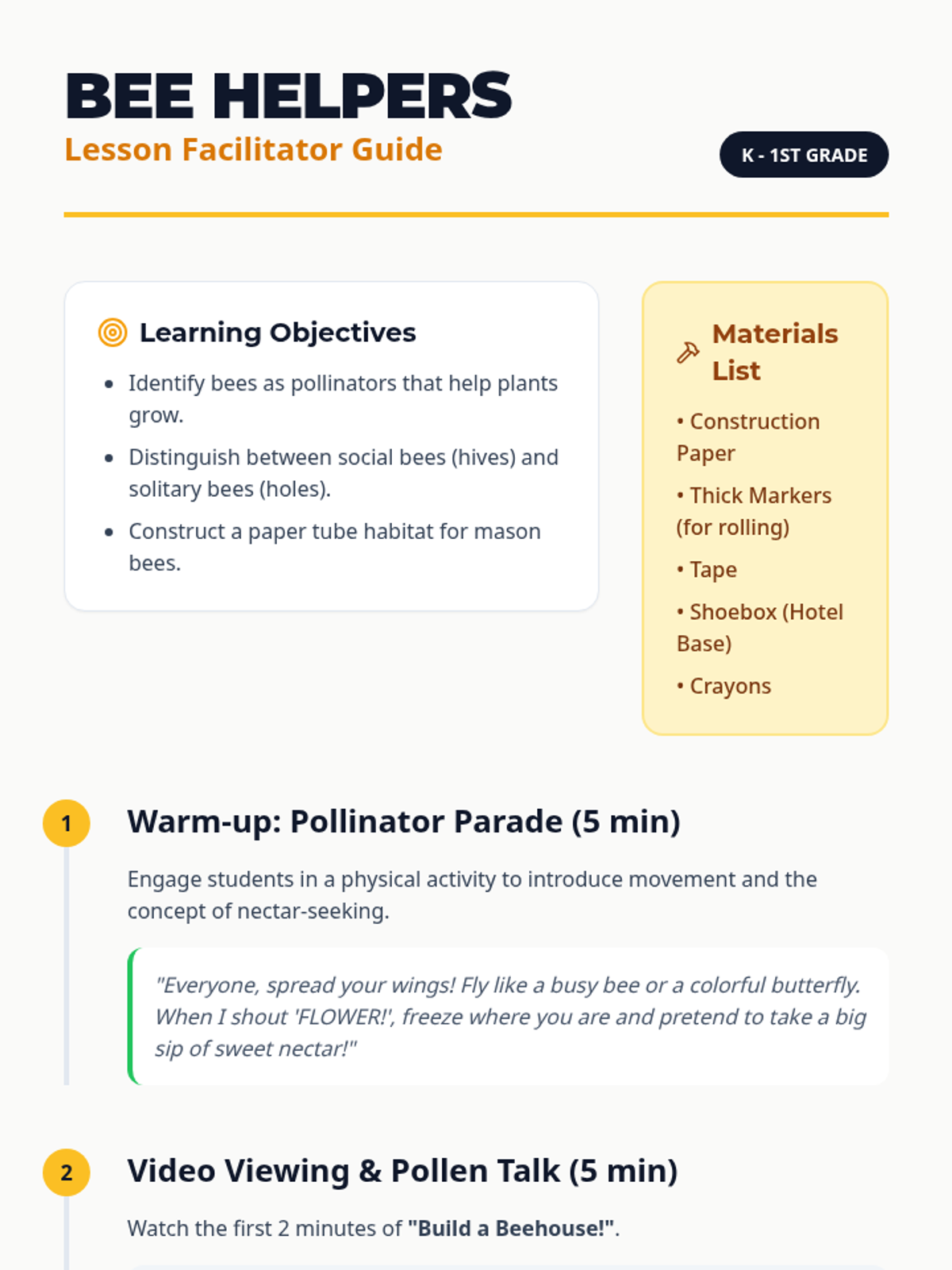 Students will discover how bees act as 'garden helpers' through pollination and create a collaborative 'Bee Hotel' for solitary mason bees. This hands-on lesson focuses on the difference between social and solitary bees and emphasizes environmental stewardship.