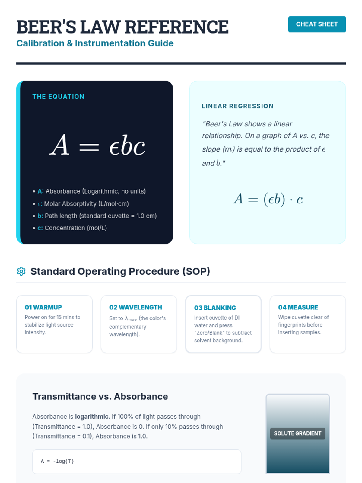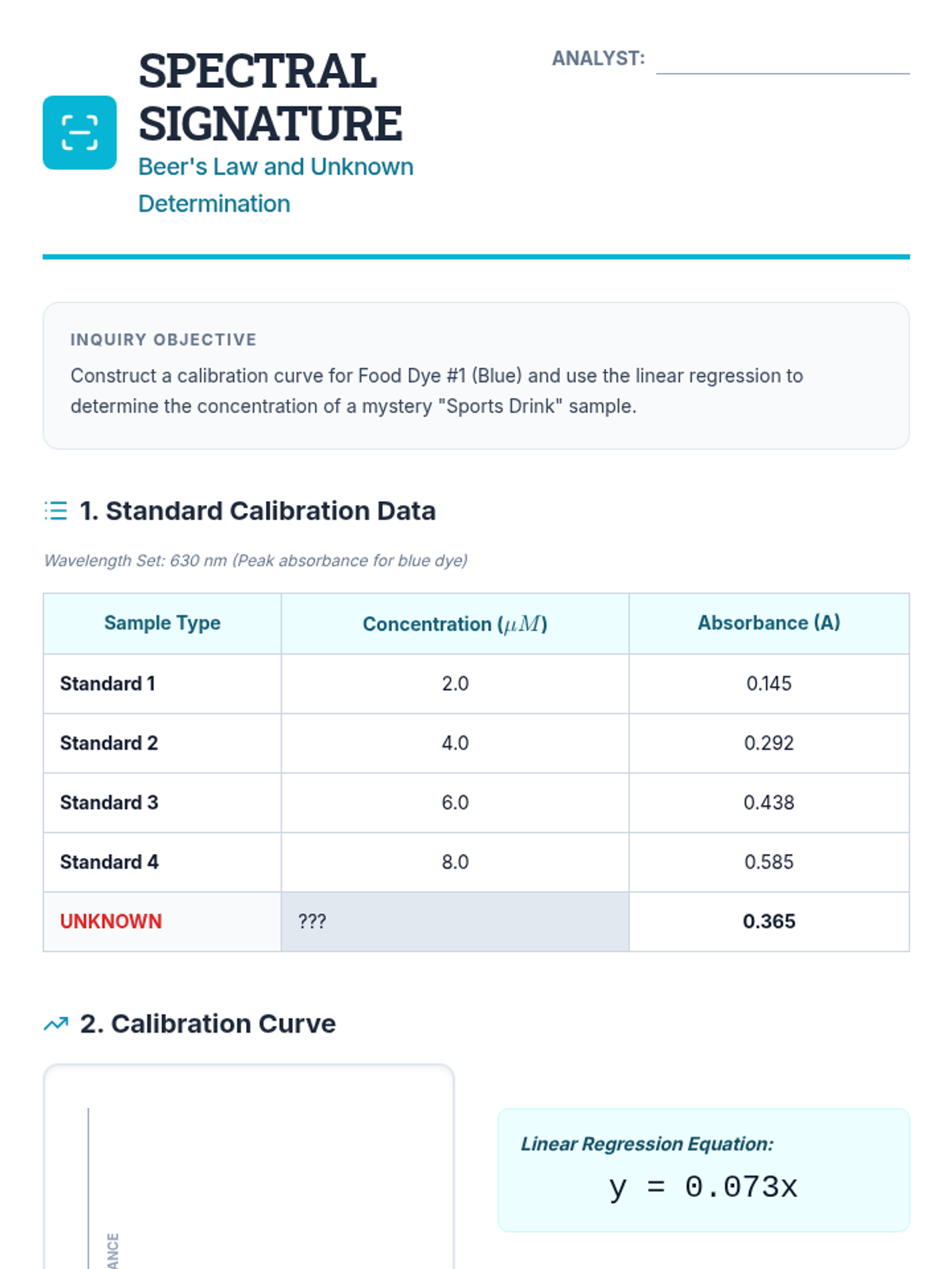 Students use spectrophotometry or colorimeters to establish a relationship between concentration and light absorbance (Beer's Law). They generate a calibration curve to determine the concentration of an unknown sample.