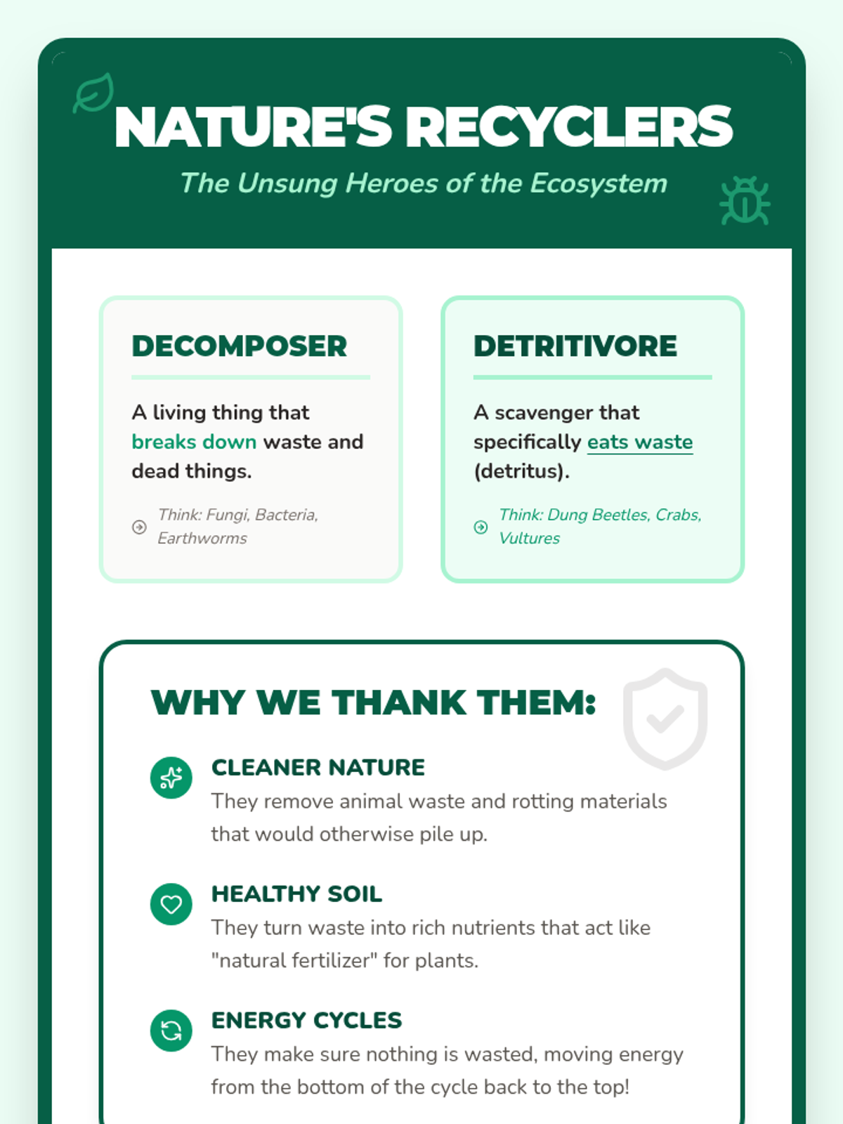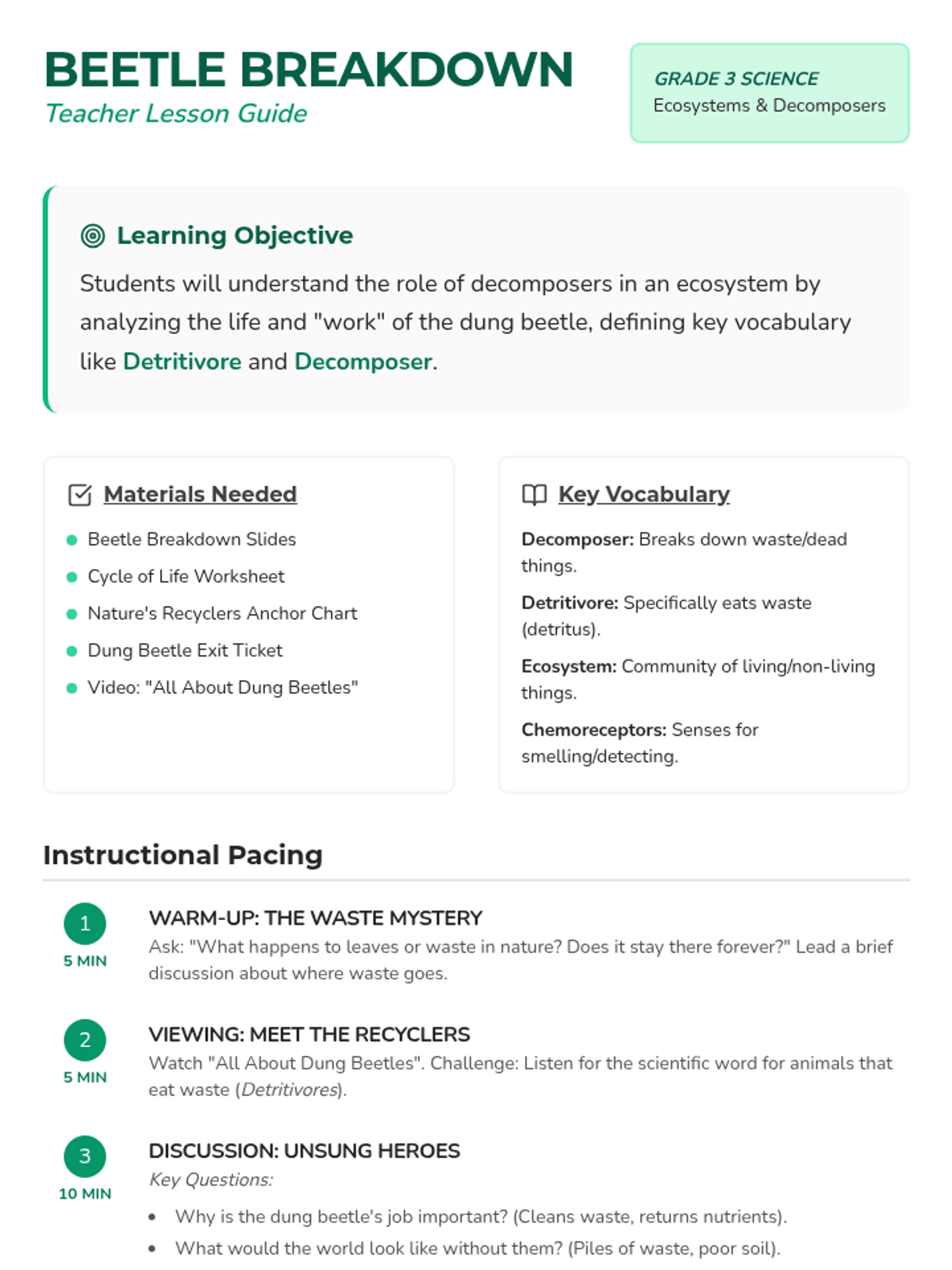 A 3rd-grade science lesson exploring the vital role of decomposers through the lens of the industrious dung beetle. Students learn about detritivores, nutrient recycling, and the importance of 'nature's recyclers' in maintaining a healthy ecosystem.