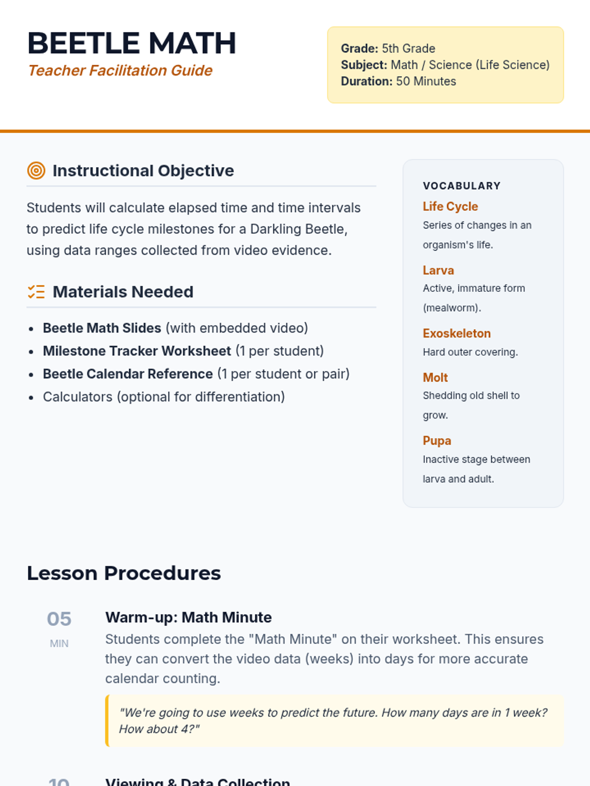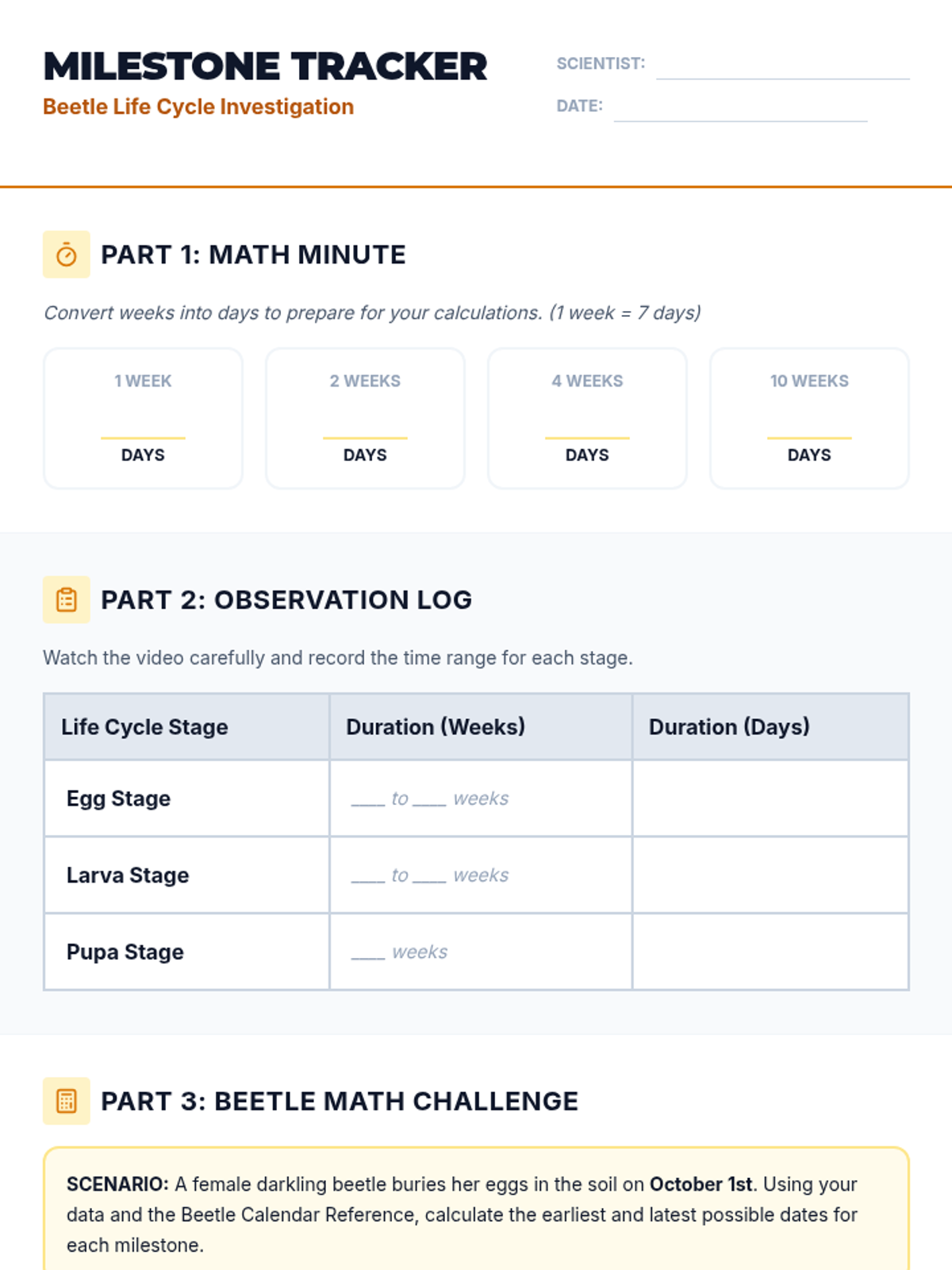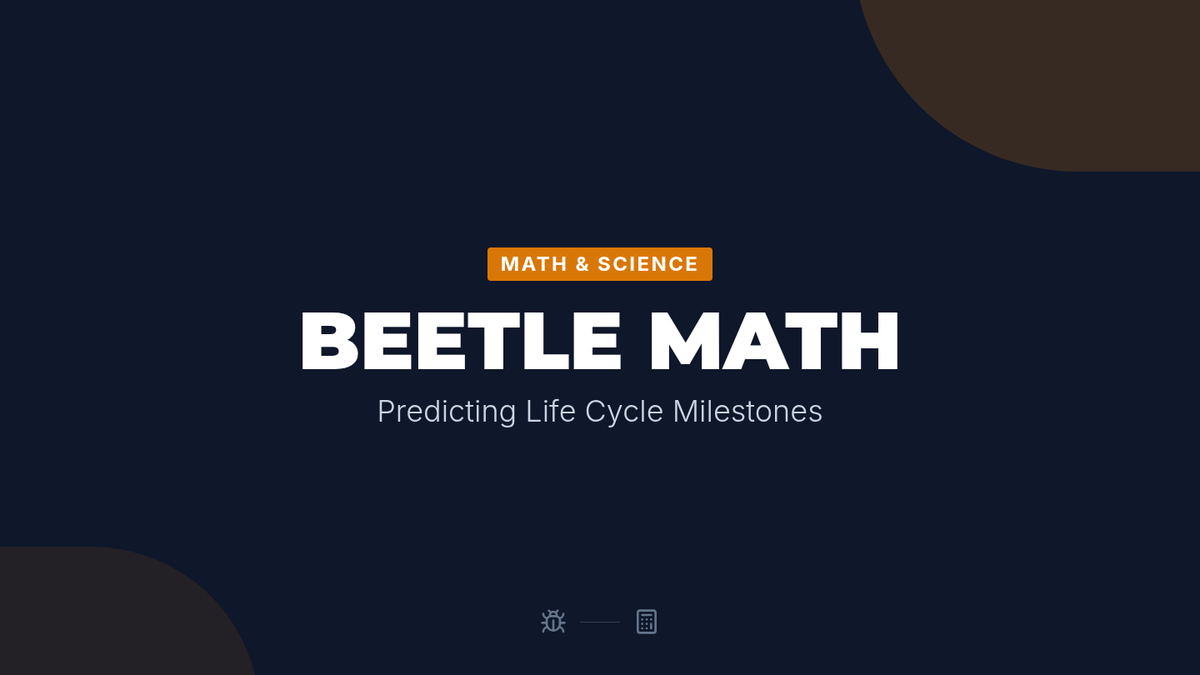 A math-integrated science lesson where students calculate the life cycle stages of a Darkling Beetle using real-world data and time intervals. Students use video evidence to predict milestones and understand biological variability.