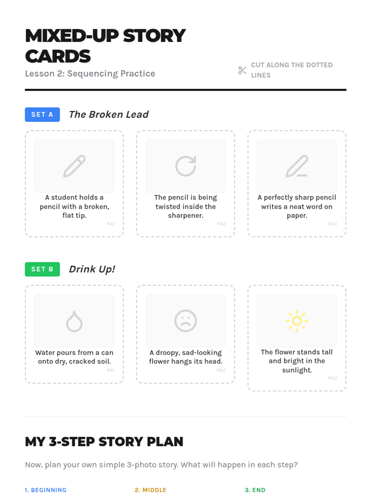Learners practice logical sequencing and plan a simple three-step photo story.