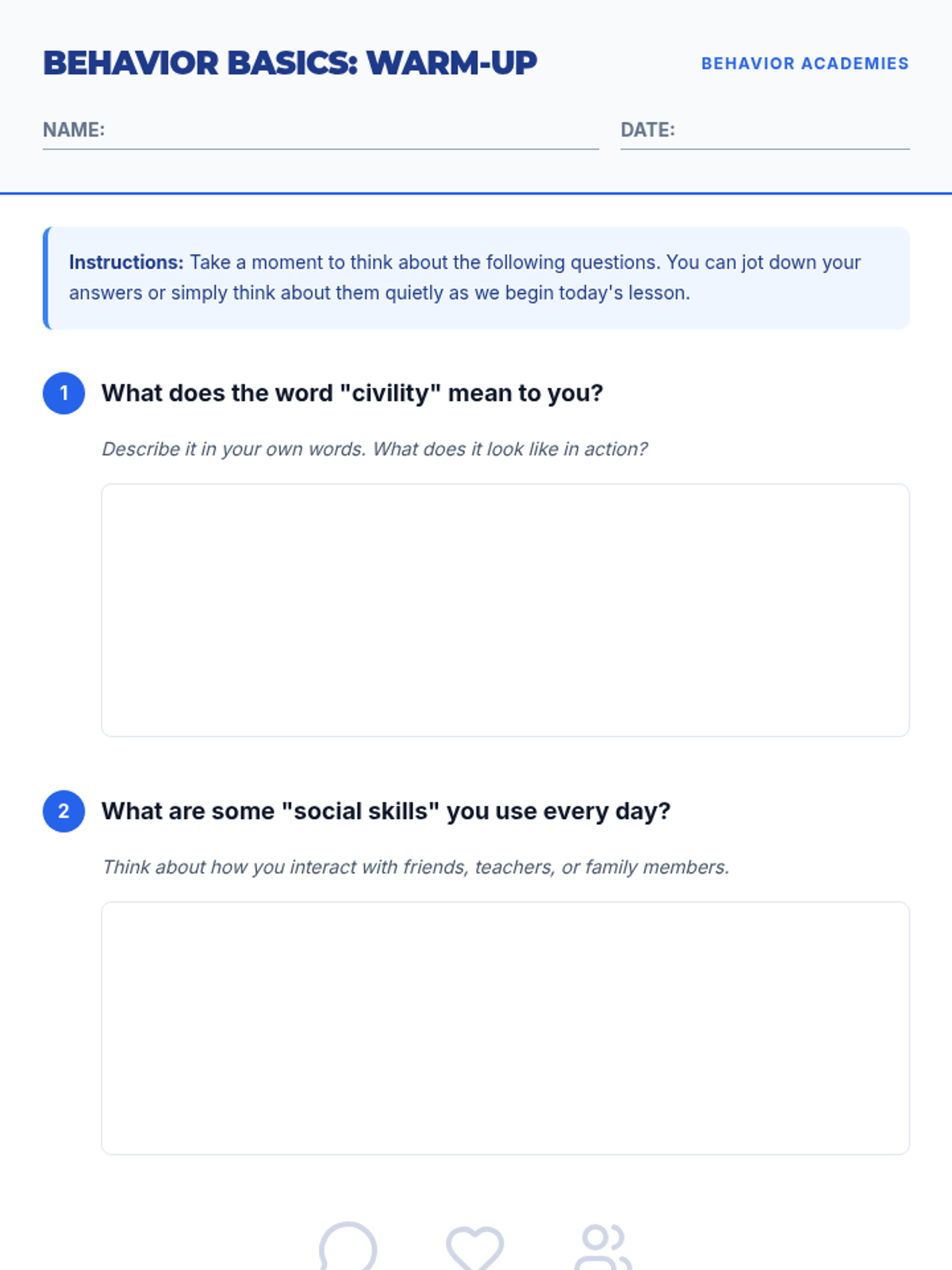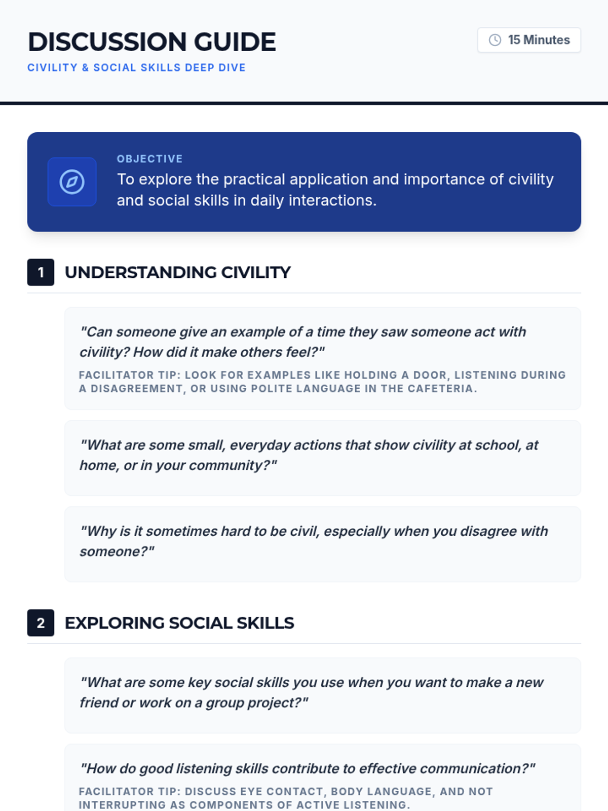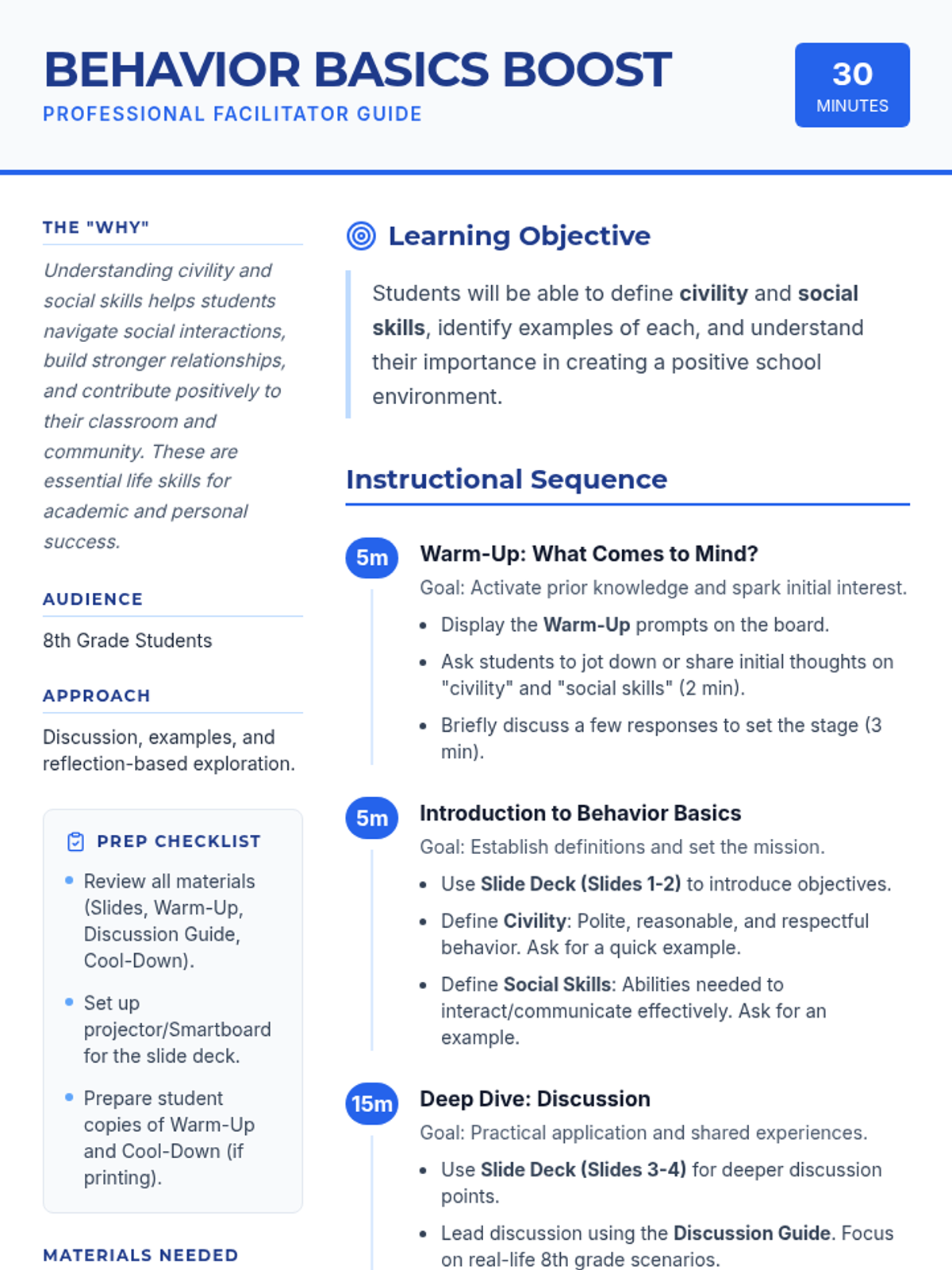 A 30-minute lesson for 8th-grade students focusing on civility and social skills. This lesson uses discussion and reflection to help students build a positive classroom environment and develop essential life skills for success.