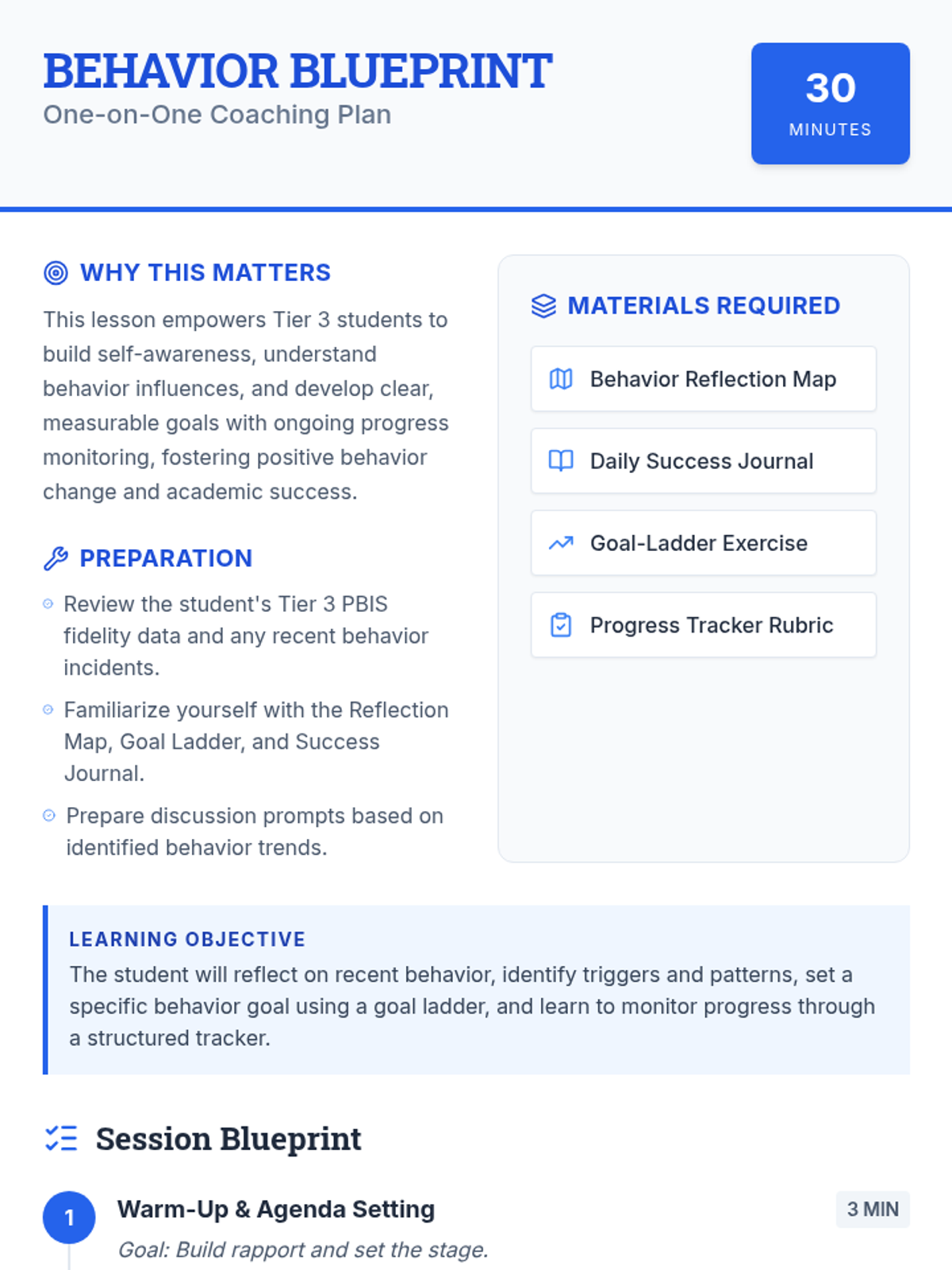 An individualized toolkit for 9th-grade Tier 3 MTSS coaching, focusing on PBIS-aligned behavior reflection, goal-setting, and progress monitoring. This 30-minute session empowers students to build self-awareness and sustainable behavioral habits.