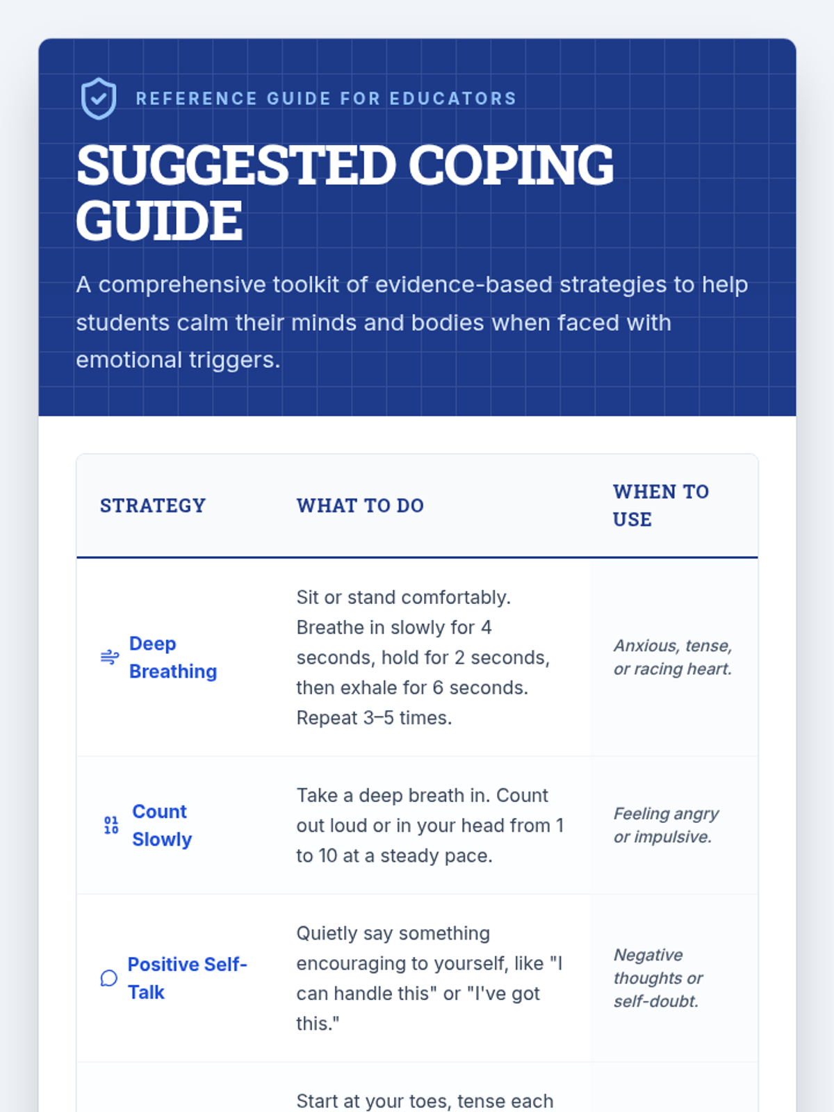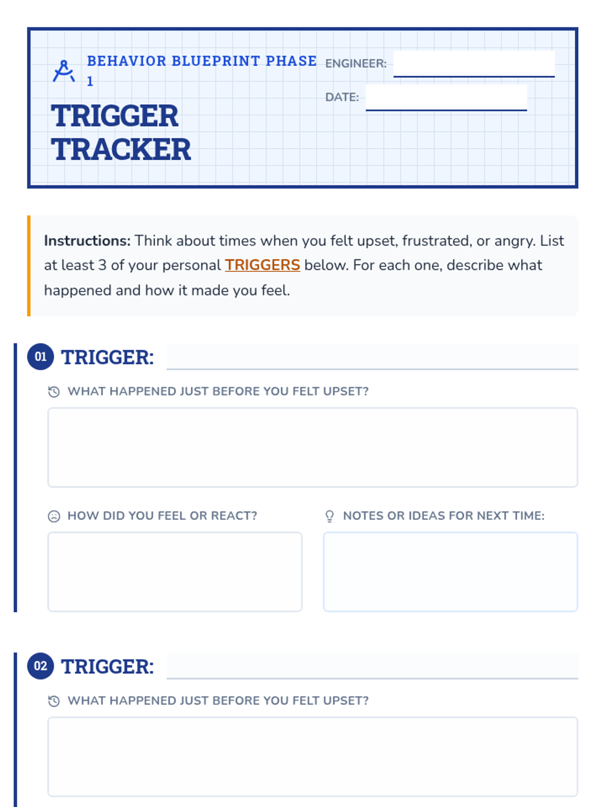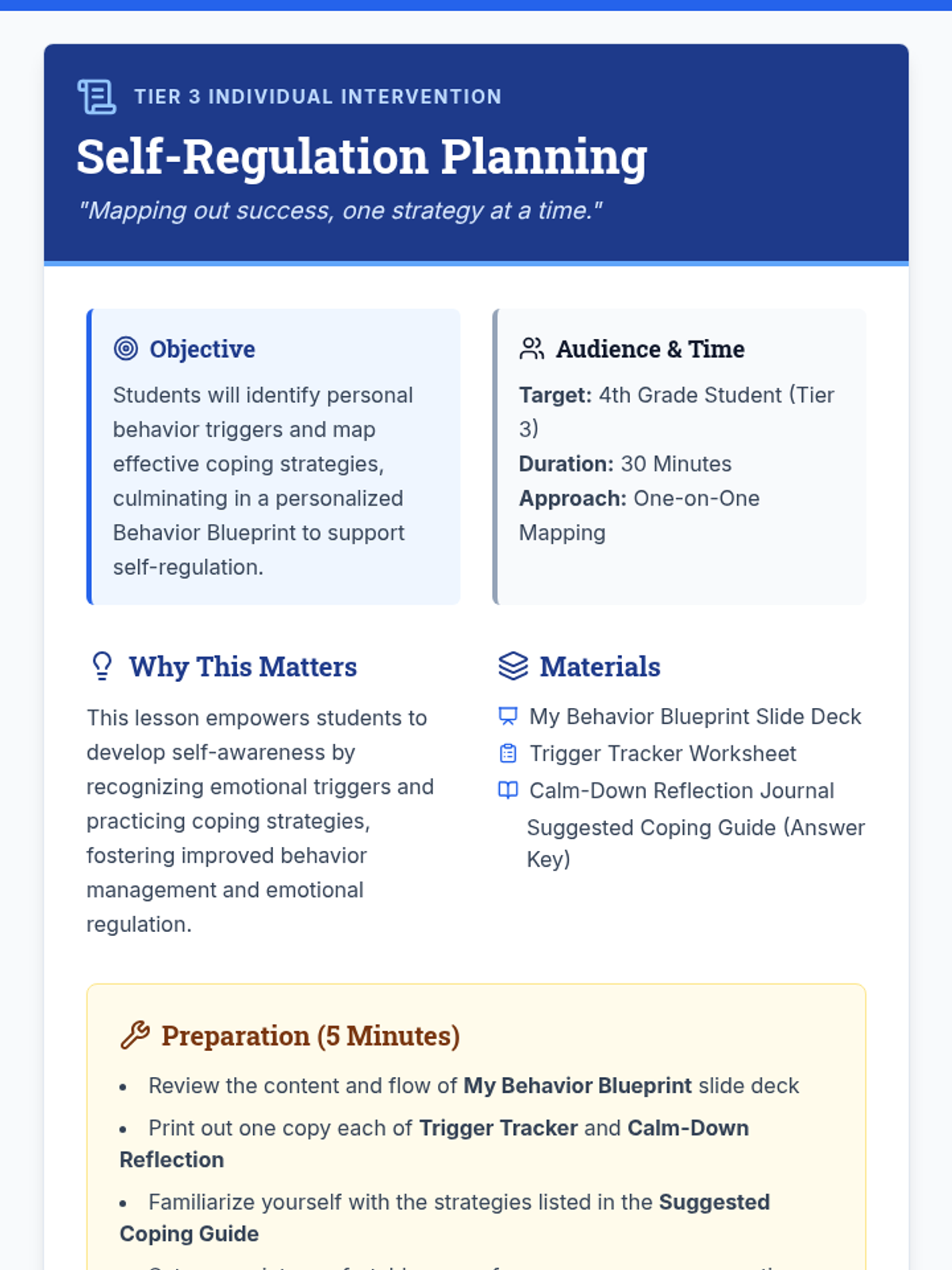 A Tier 3 individualized lesson for 4th graders to identify emotional triggers and develop personalized coping strategies through the creation of a Behavior Blueprint.