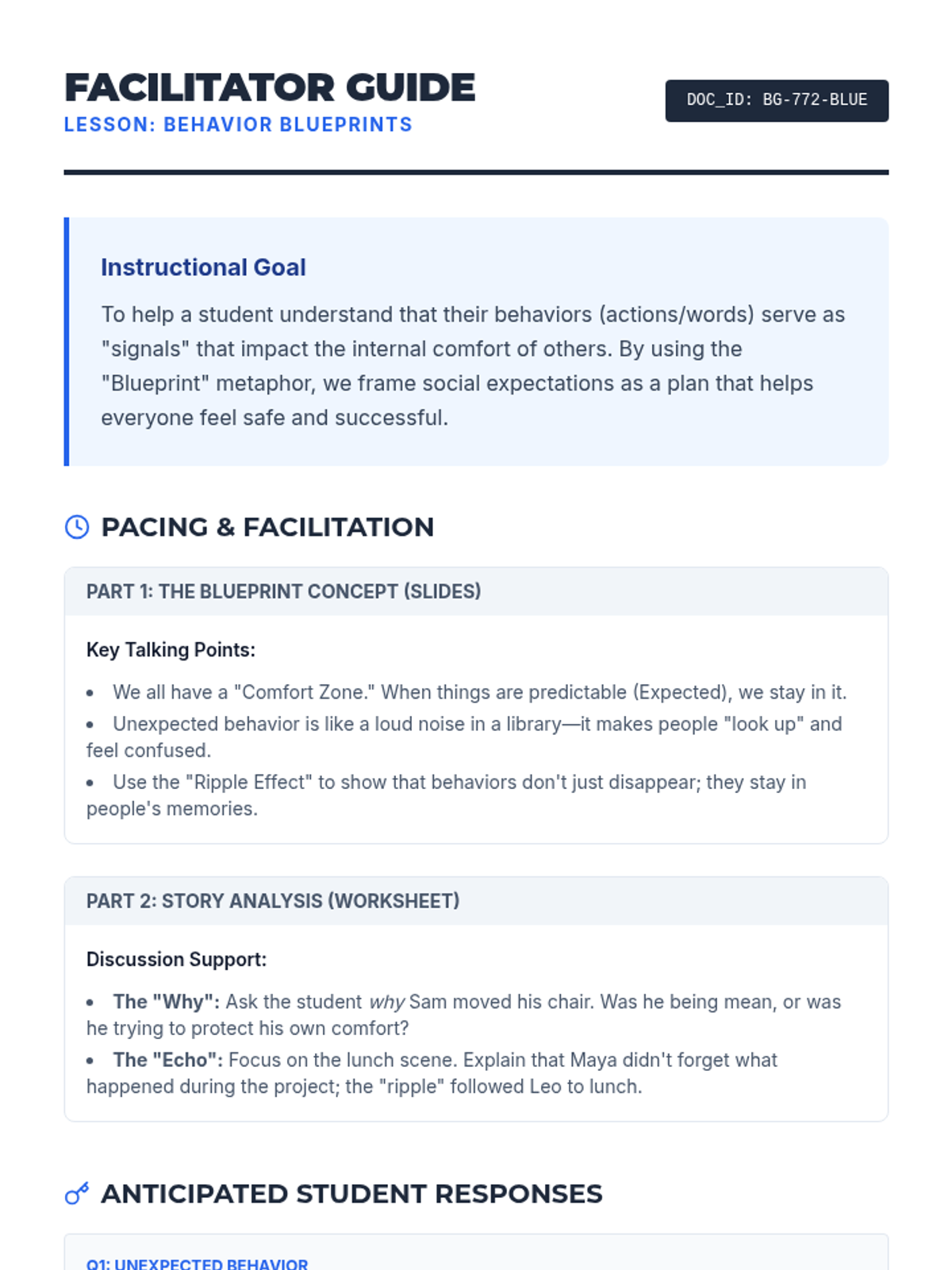 This lesson focuses on helping students understand the 'Social Ripple Effect'—how their behaviors impact the thoughts and feelings of those around them. Using a 'Behavior Blueprint' theme, students will explore the difference between expected and unexpected actions and how to maintain peer comfort.