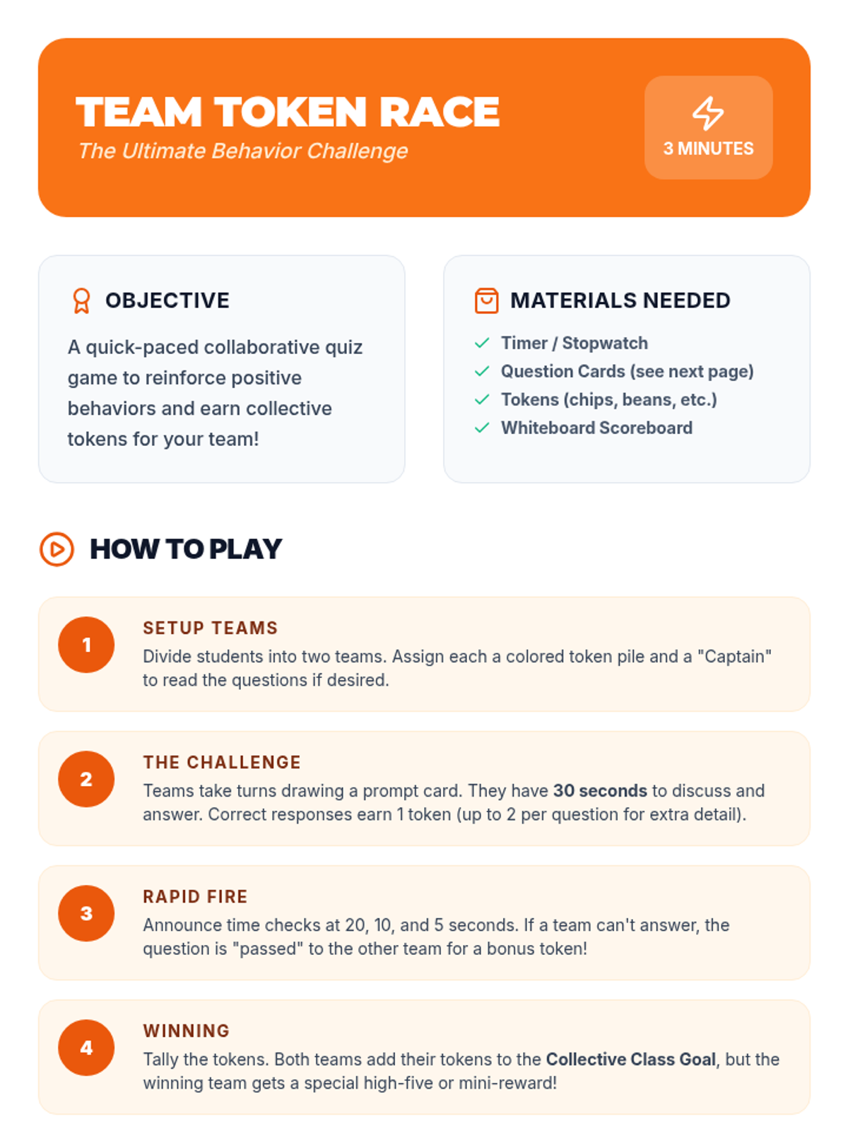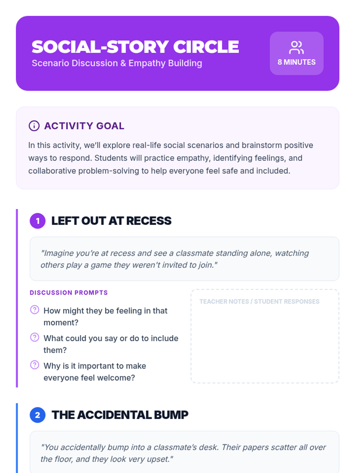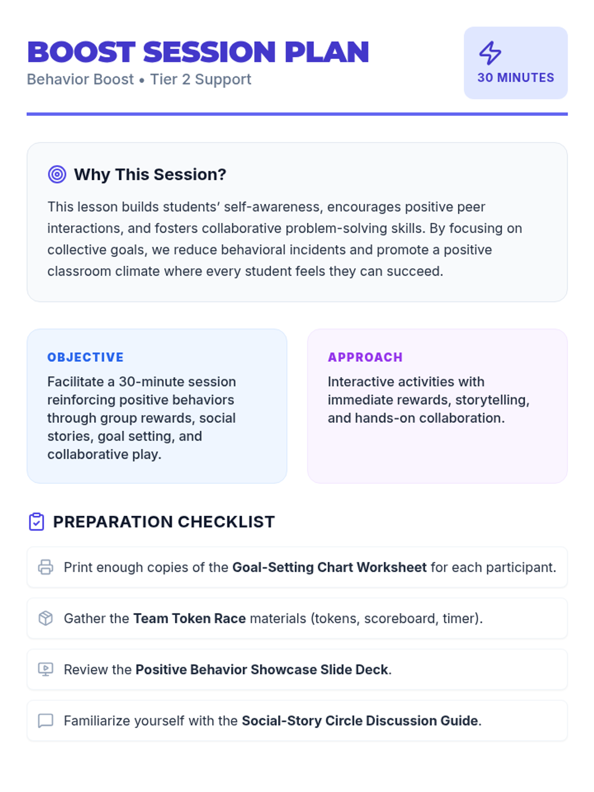 A 30-minute small-group session for 5th graders designed to reinforce positive behaviors through group rewards, social stories, and collaborative games. Students practice empathy, goal-setting, and teamwork in a supportive, high-energy environment.