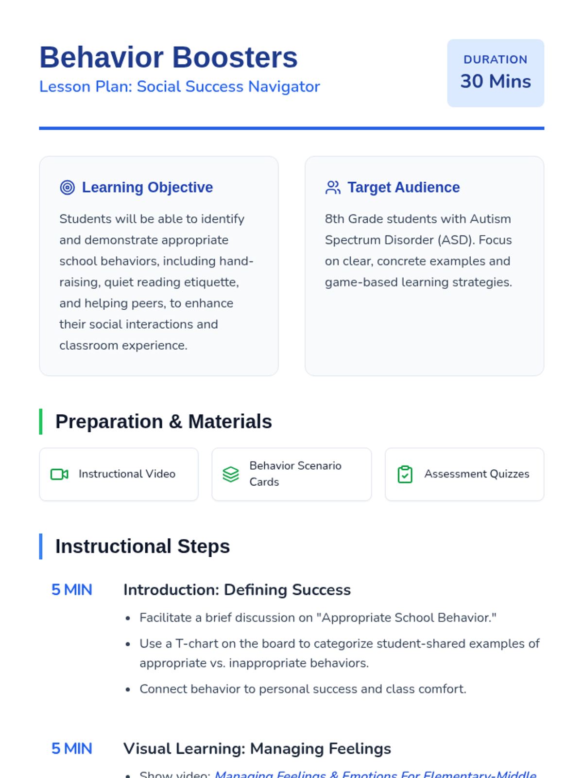 A social skills lesson for 8th graders with autism focusing on appropriate school behavior through video analysis, role-play scenarios, and a game-based approach.