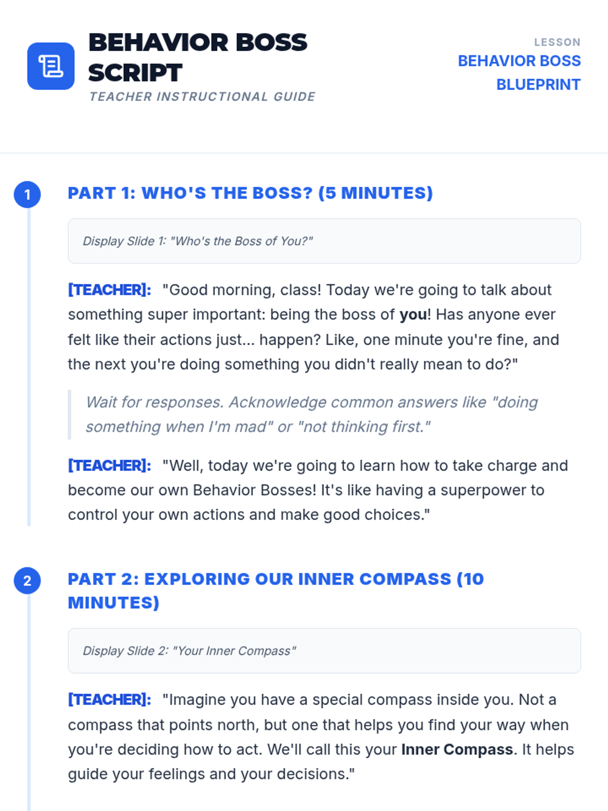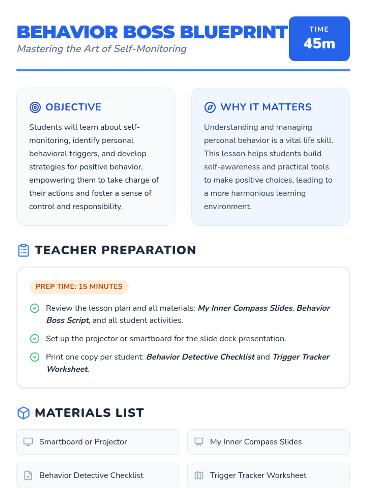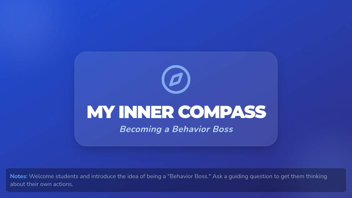 This lesson empowers elementary students to take charge of their actions by understanding self-monitoring, identifying personal triggers, and developing positive behavior strategies. Students will explore their 'inner compass' through interactive slides, a behavior detective activity, and personalized goal-setting.