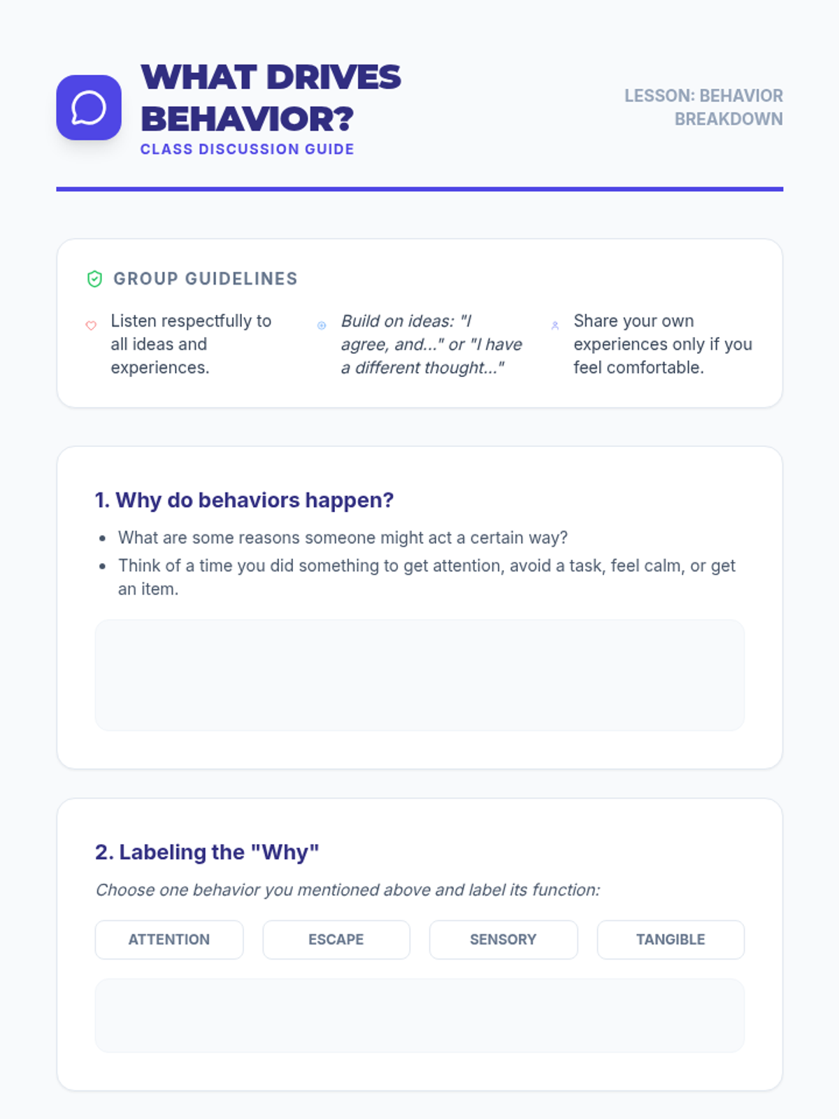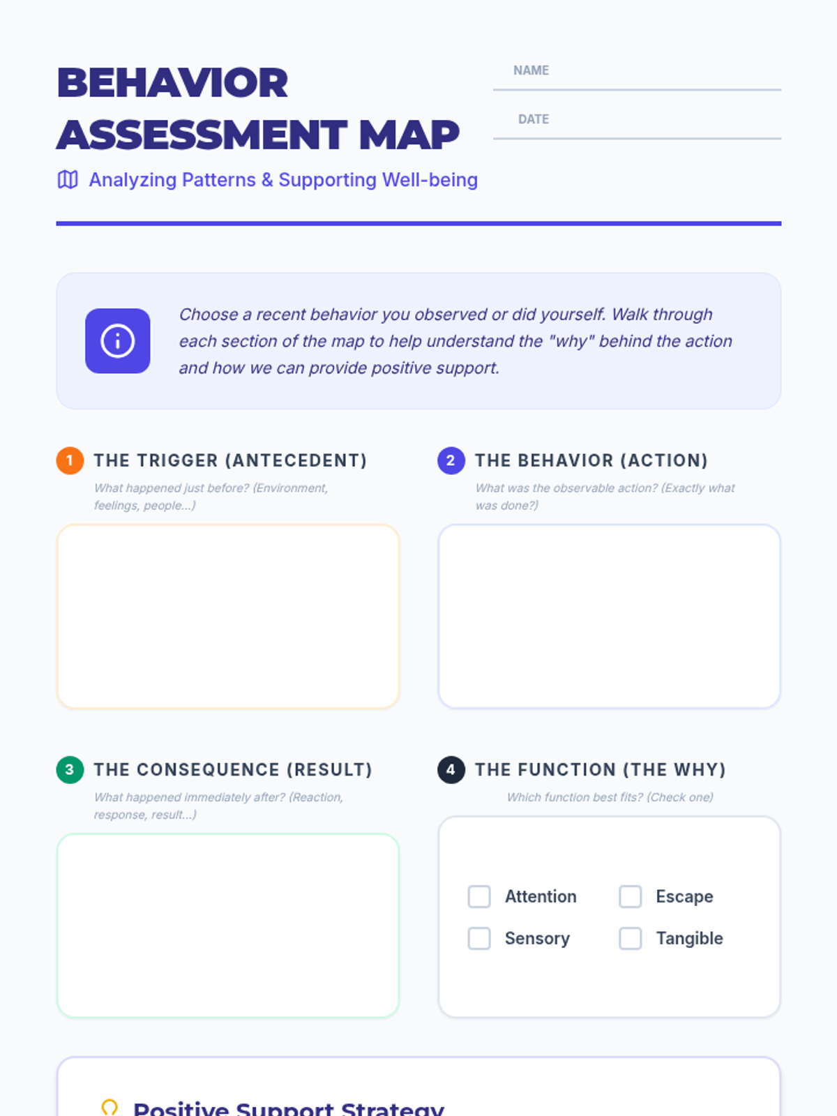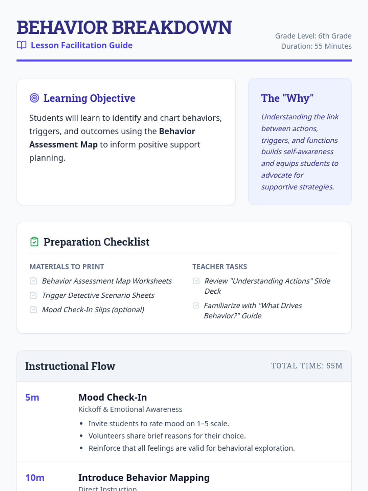 A 55-minute session for 6th graders to explore behavior patterns, triggers, and functions using assessment maps and scenario-based activities. Students learn to advocate for positive supports by understanding the 'why' behind actions.