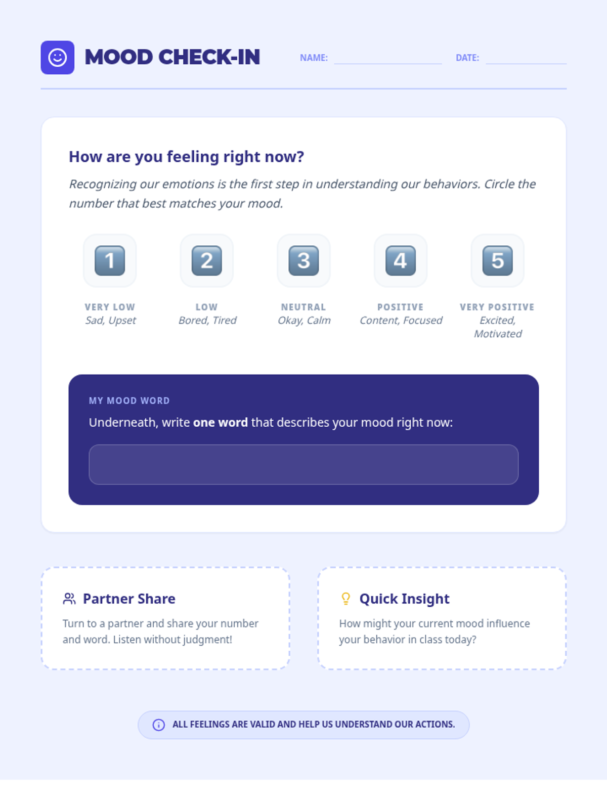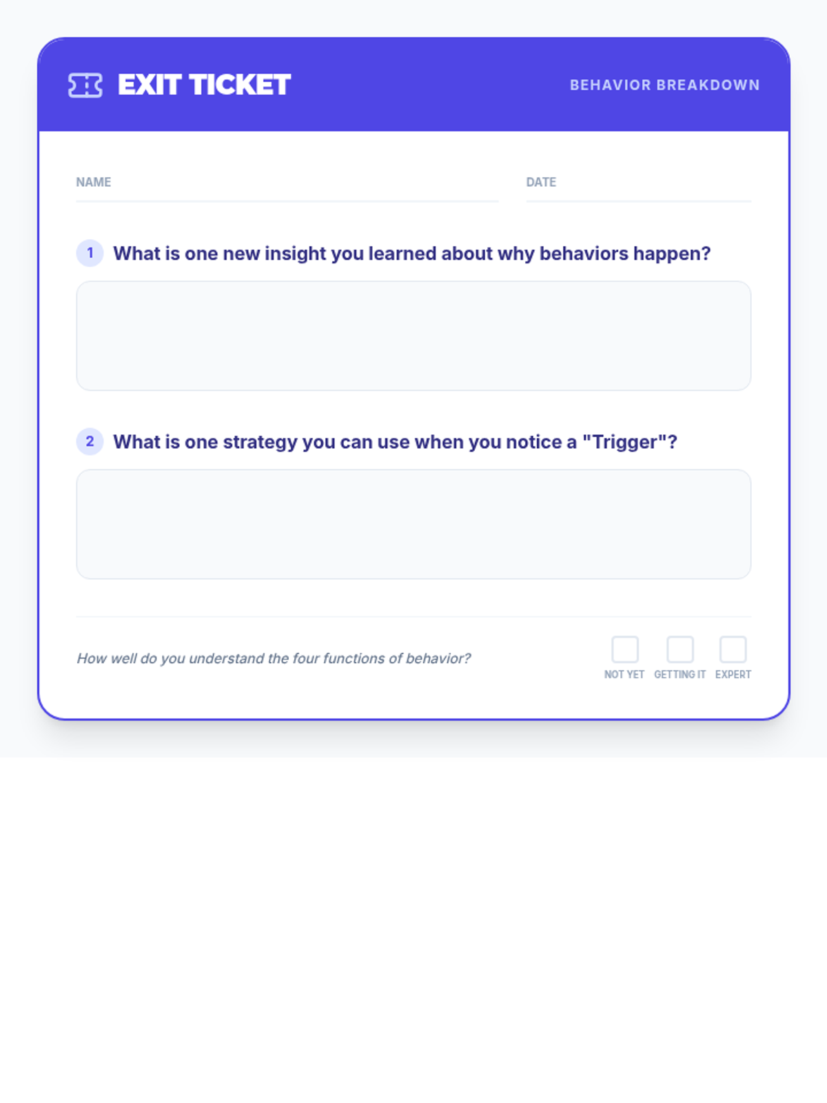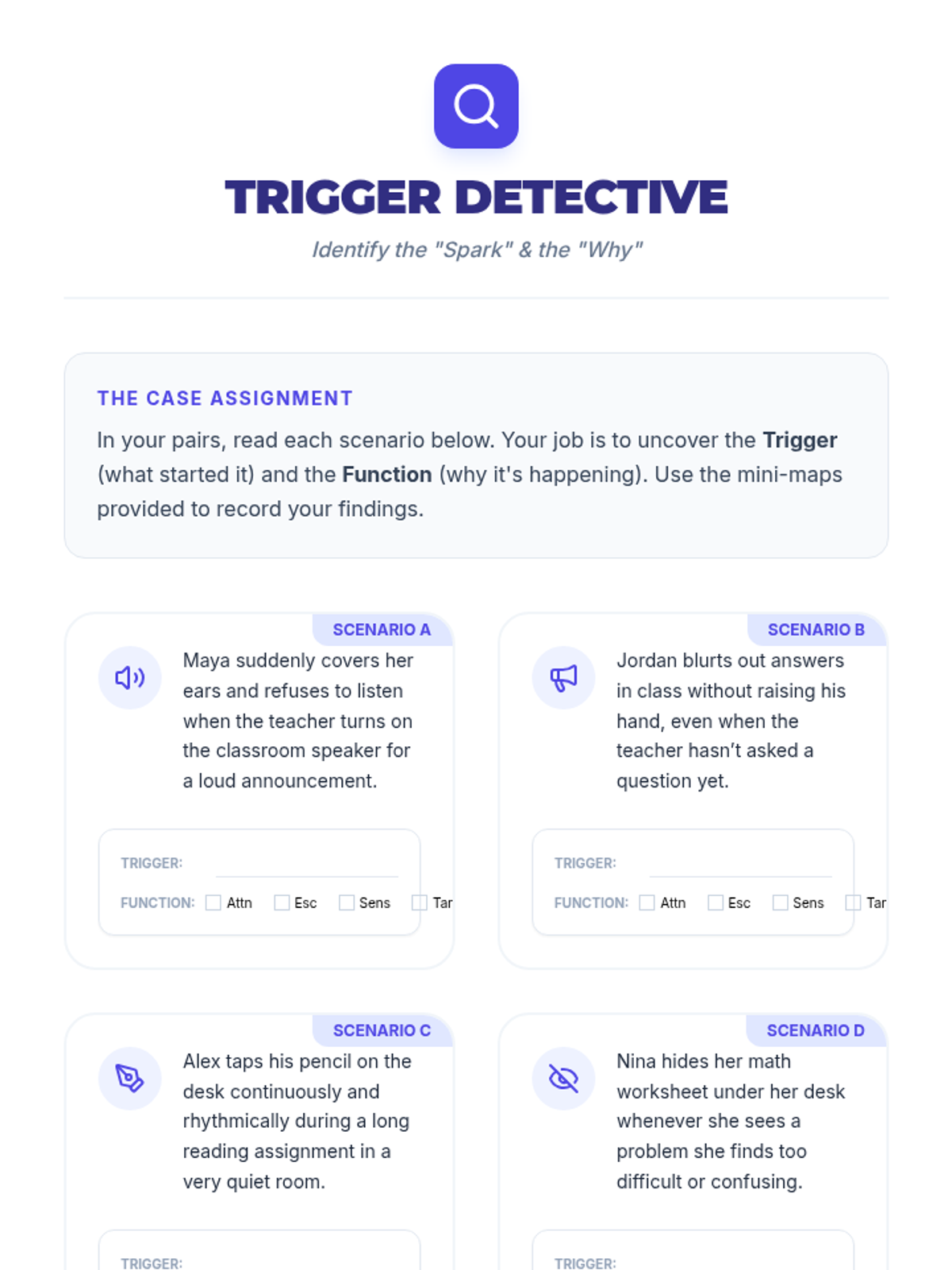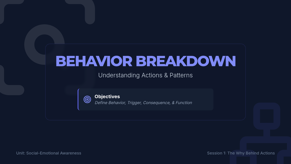 A 55-minute session for 6th graders to explore behavior patterns, triggers, and functions using assessment maps and scenario-based activities. Students learn to advocate for positive supports by understanding the 'why' behind actions.