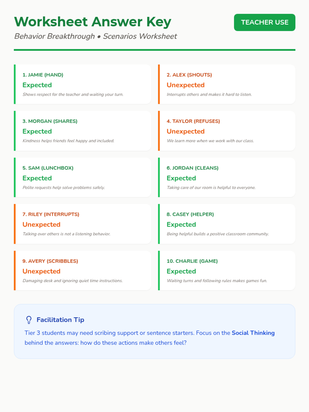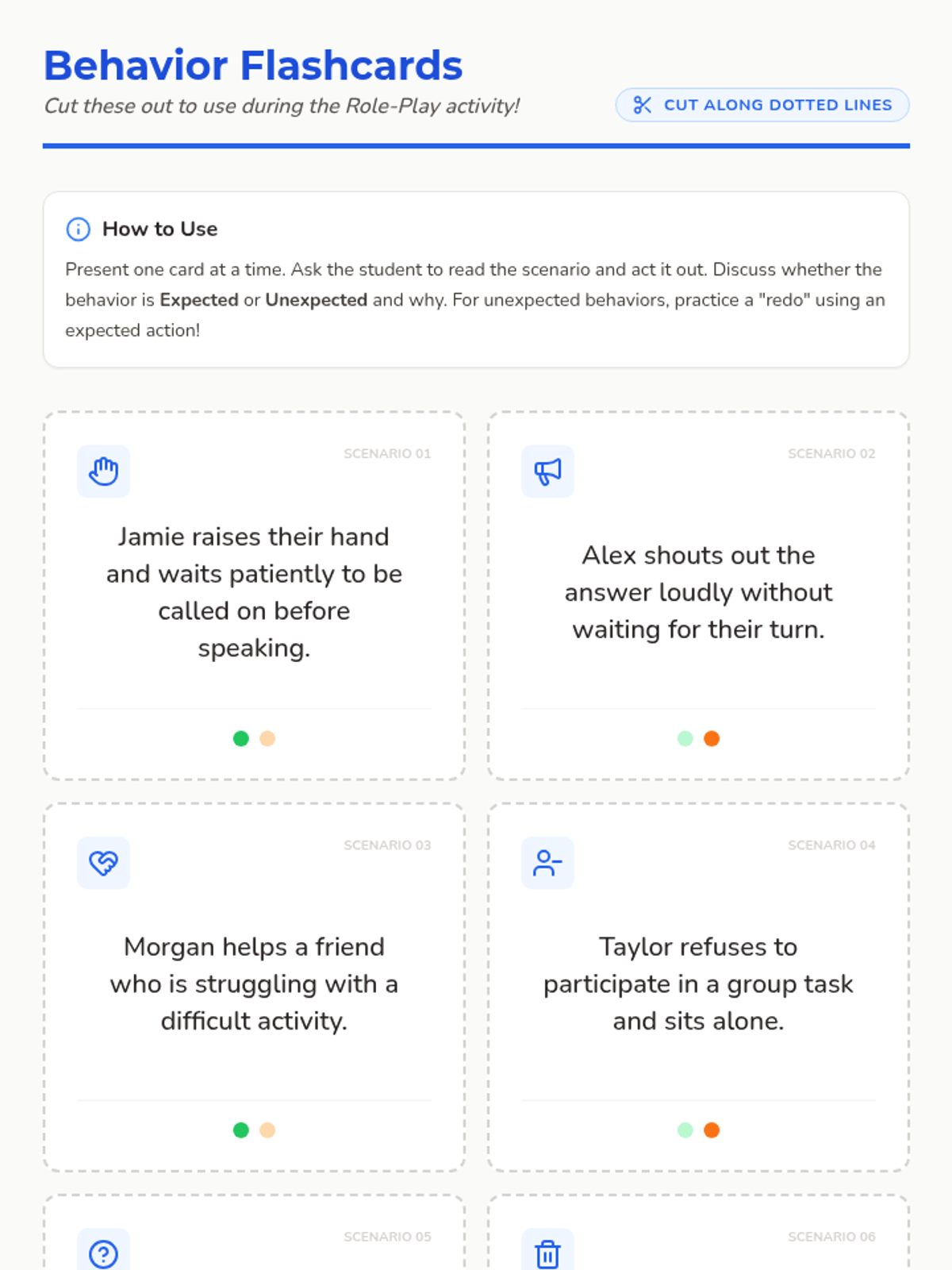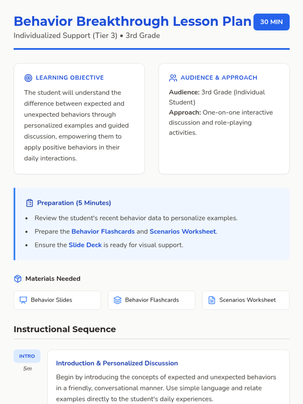 This lesson helps 3rd-grade students understand the difference between expected and unexpected behaviors through personalized discussion, role-playing, and reflection. It is designed for individual (Tier 3) support to help students improve their social skills and classroom interactions.