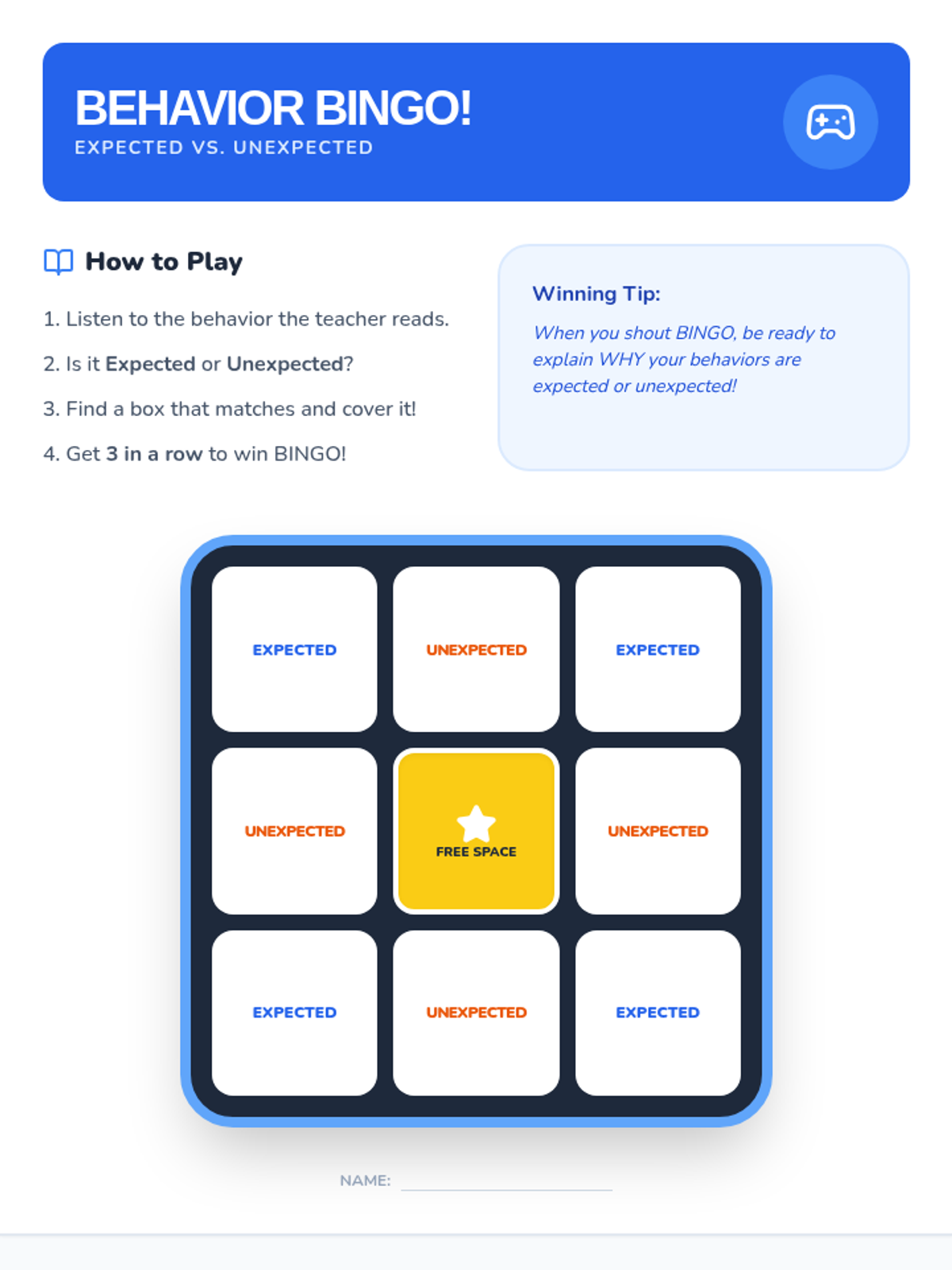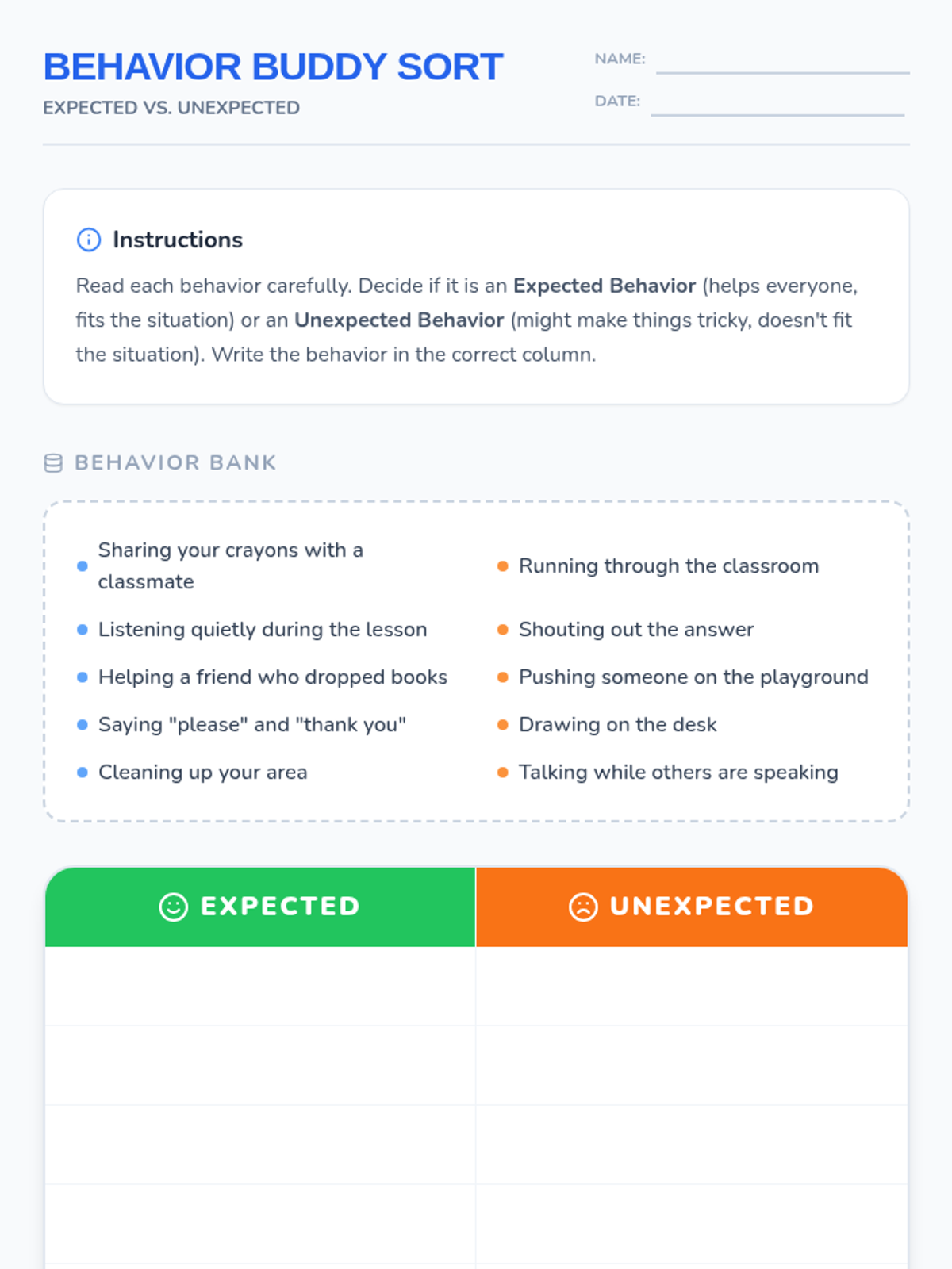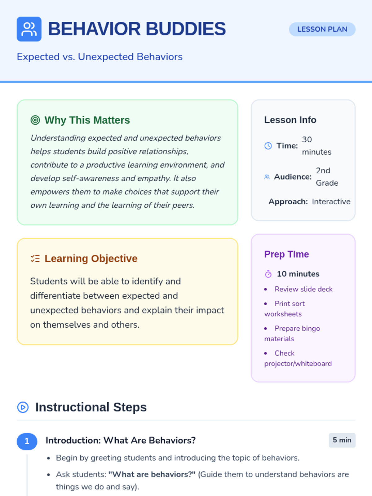 A 30-minute lesson for 2nd-grade students to understand the difference between expected and unexpected behaviors and their impact on the classroom environment.