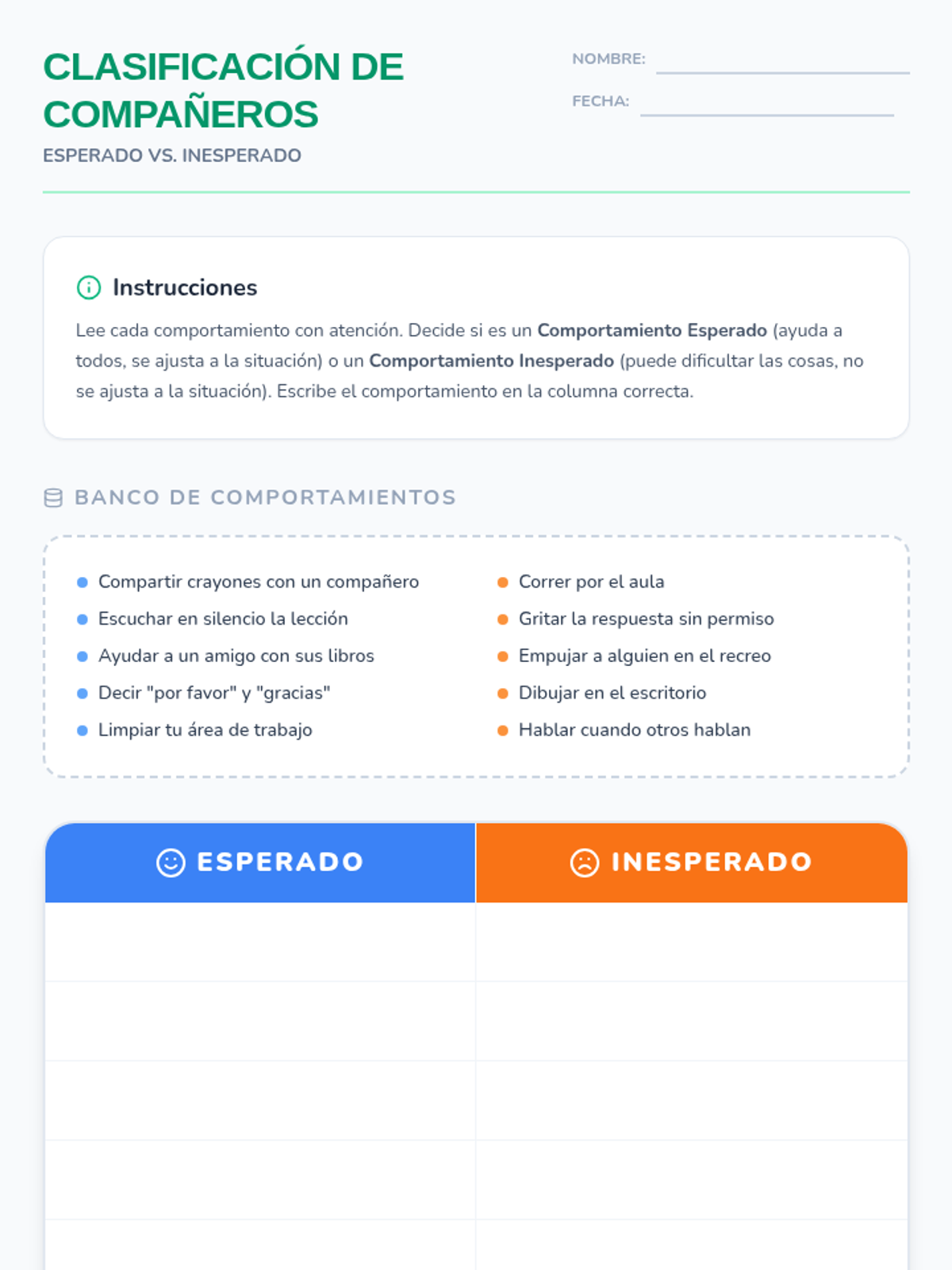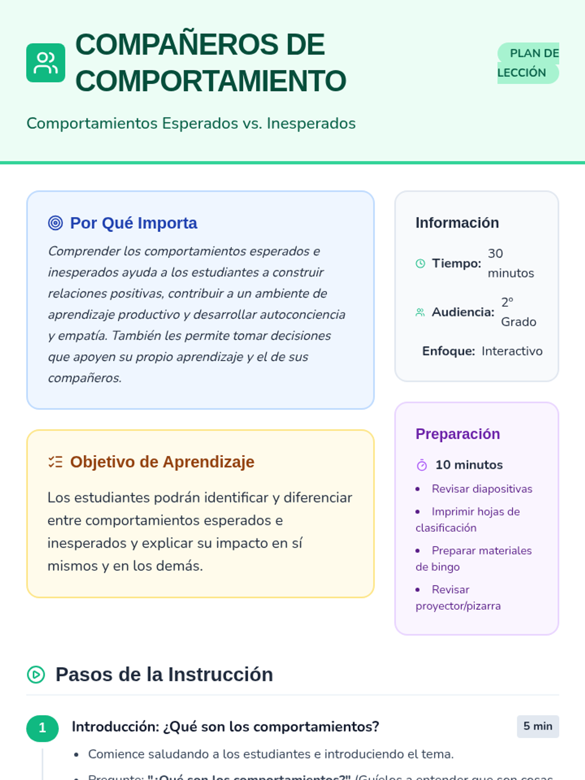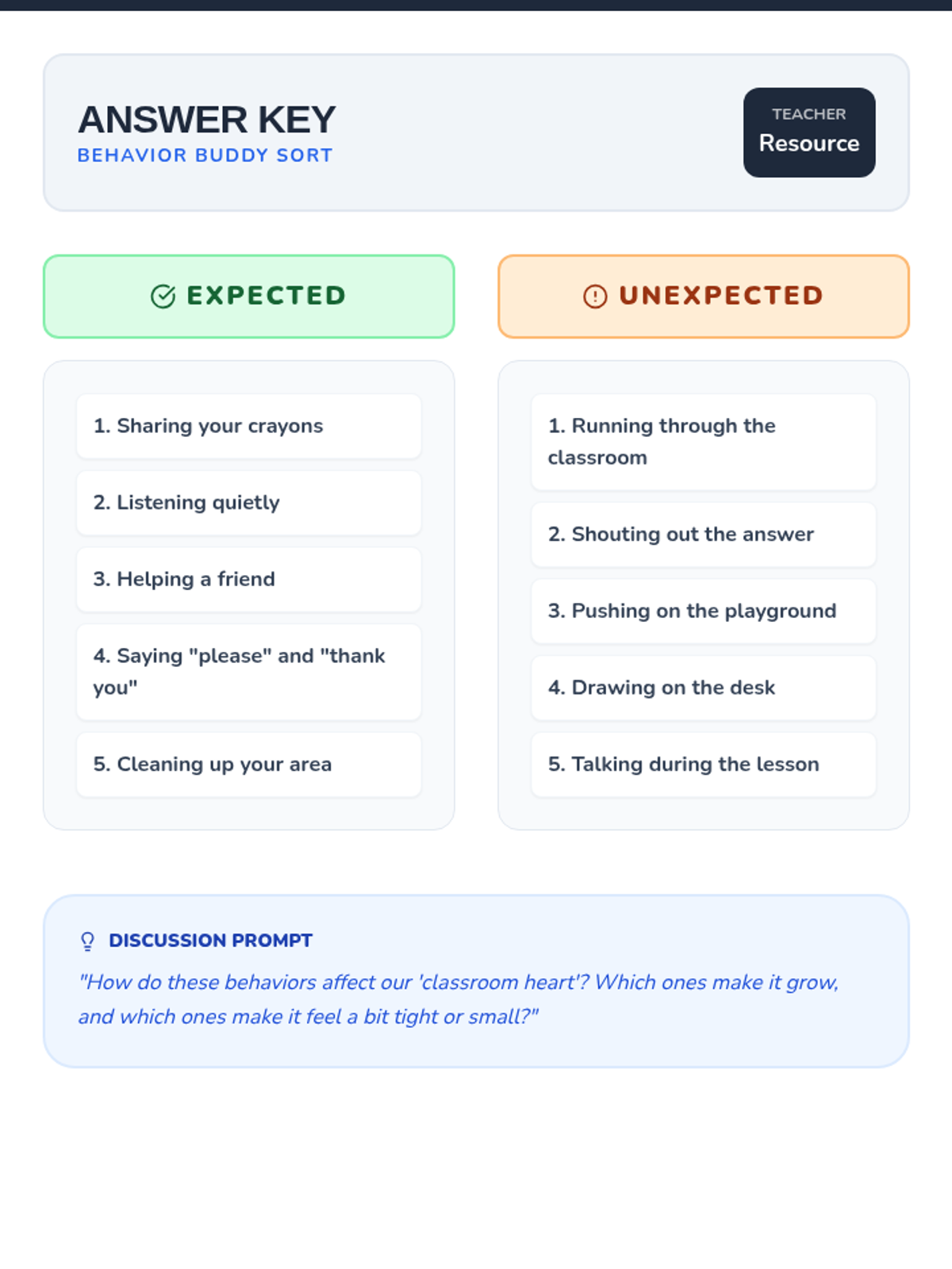 A 30-minute lesson for 2nd-grade students to understand the difference between expected and unexpected behaviors and their impact on the classroom environment.