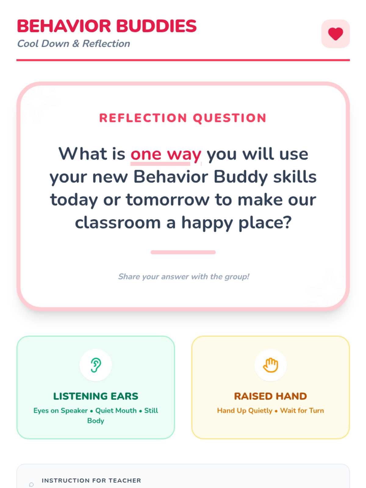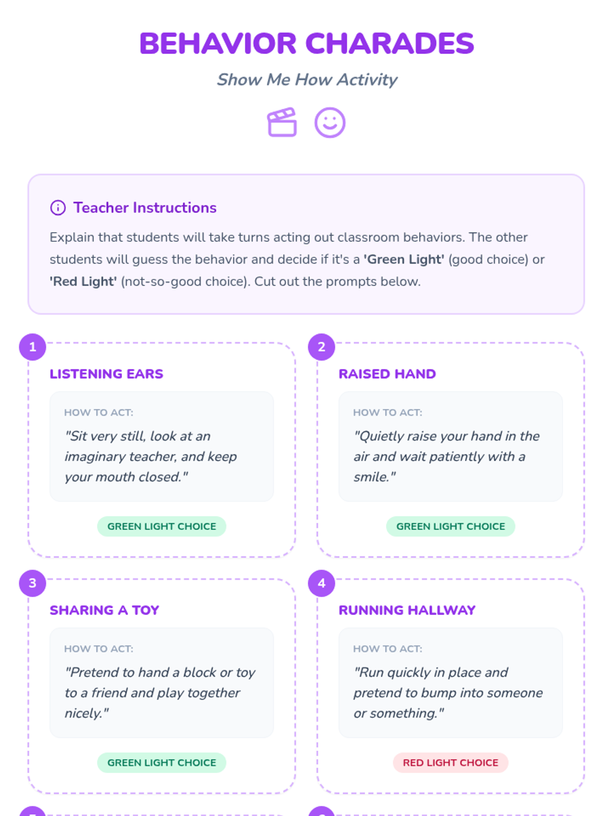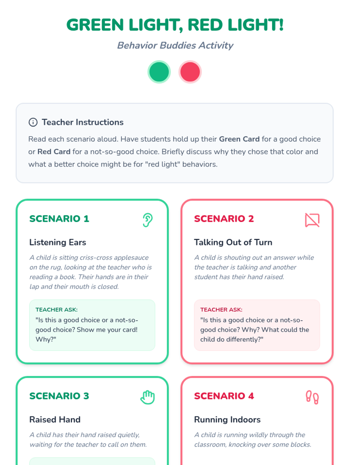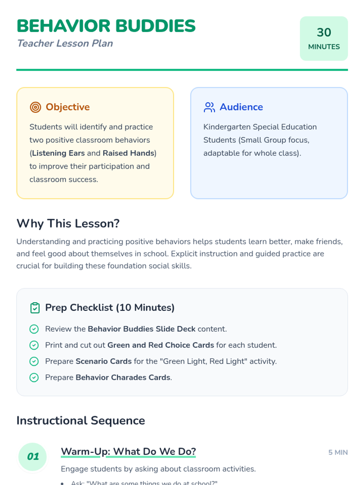 A 30-minute interactive lesson for Kindergarten students (specifically designed for small-group special education) to learn and practice two key positive behaviors: Listening Ears and Raised Hands. Students use 'Green Light' and 'Red Light' concepts to identify and practice choices that help the classroom community.
