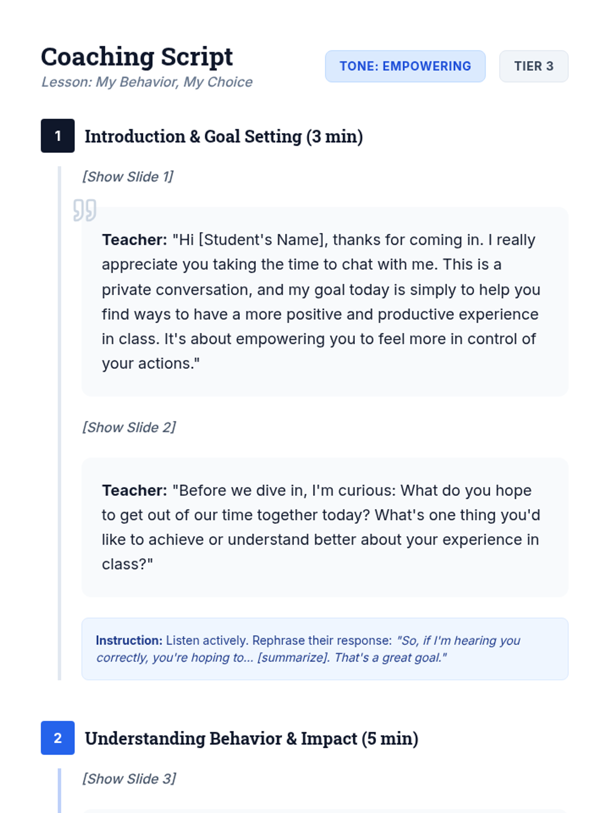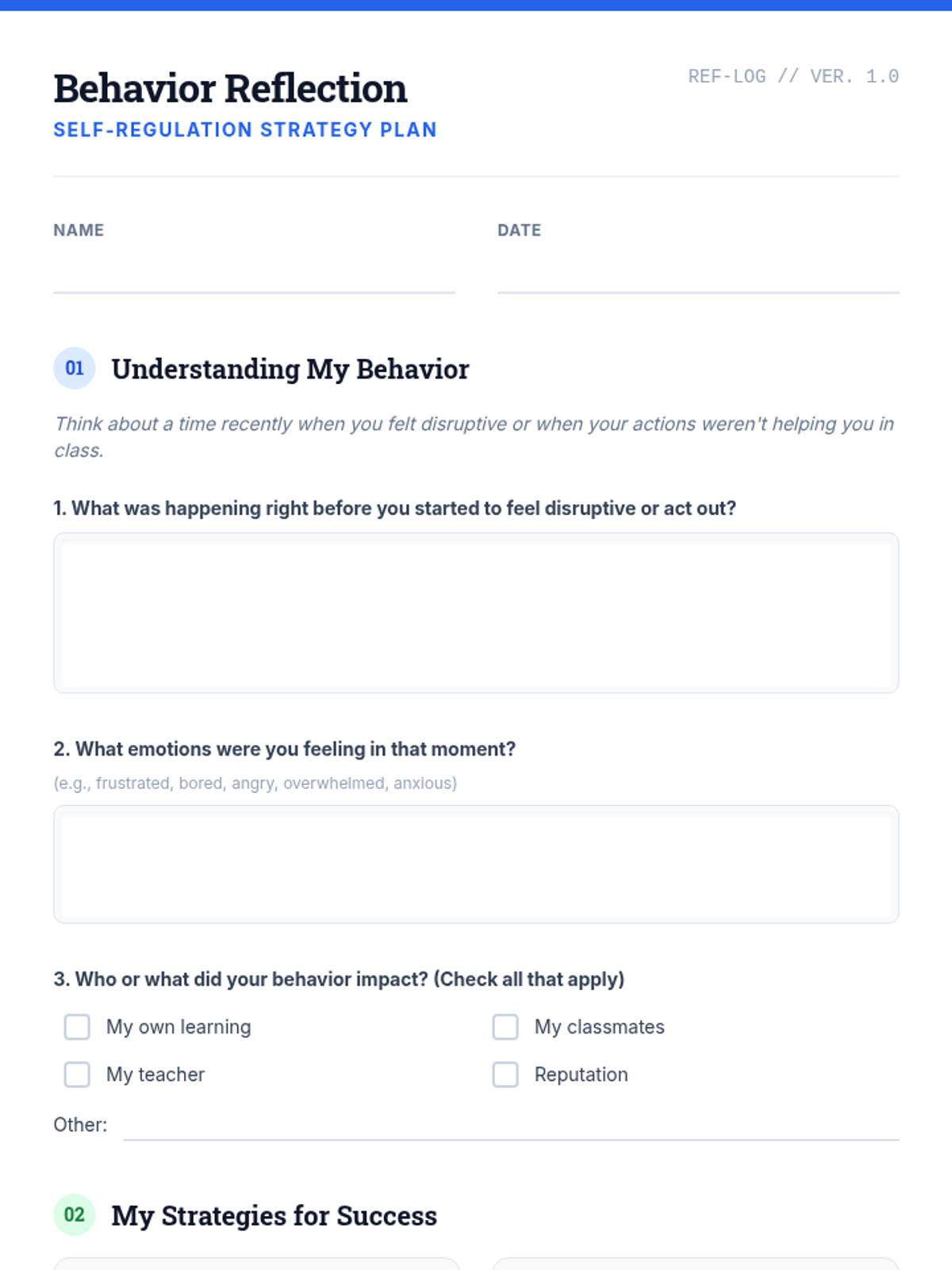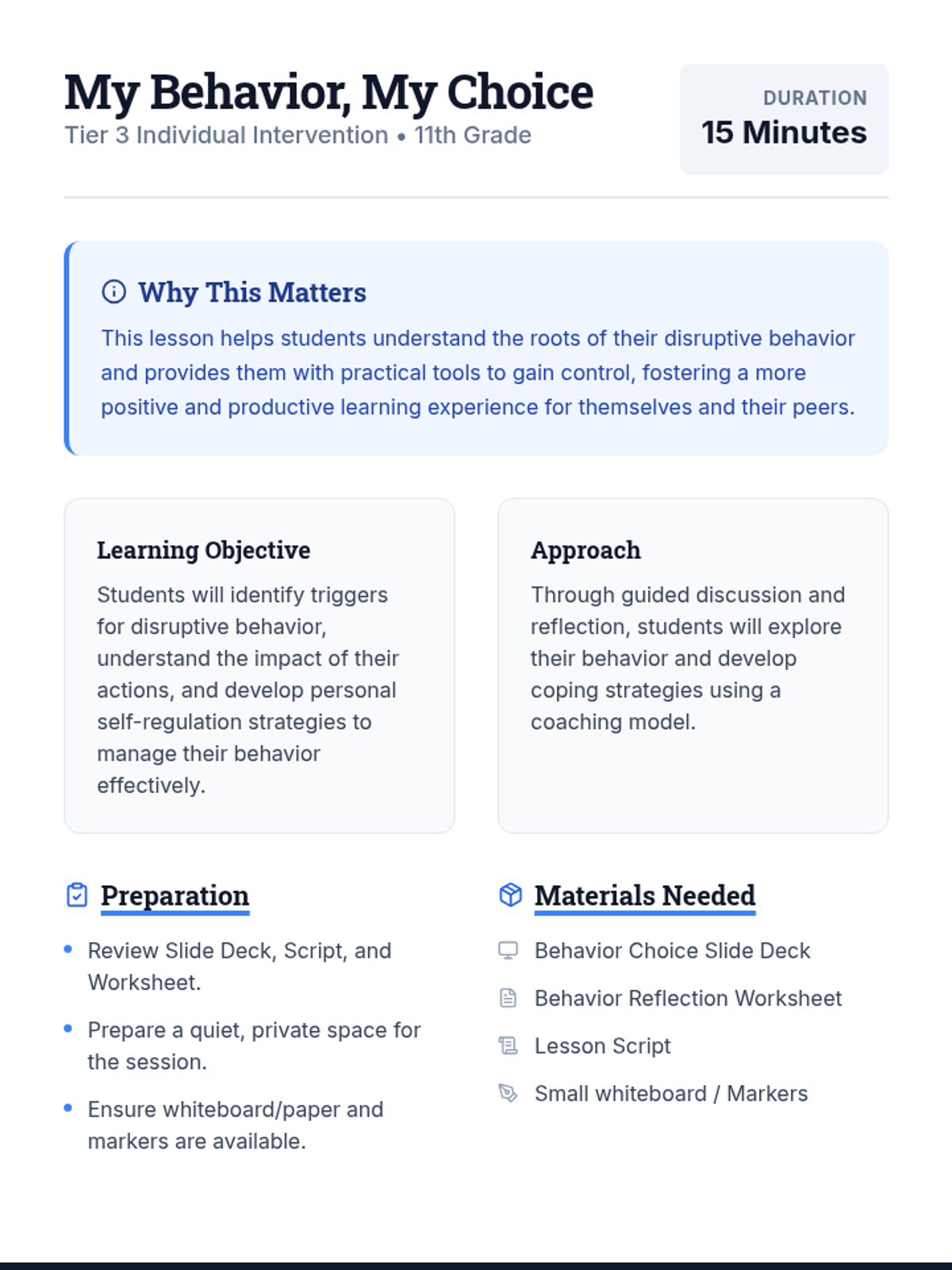 A Tier 3 intervention for 11th-grade students to analyze disruptive behavior patterns and implement self-regulation strategies through a "Control Your Response" framework.