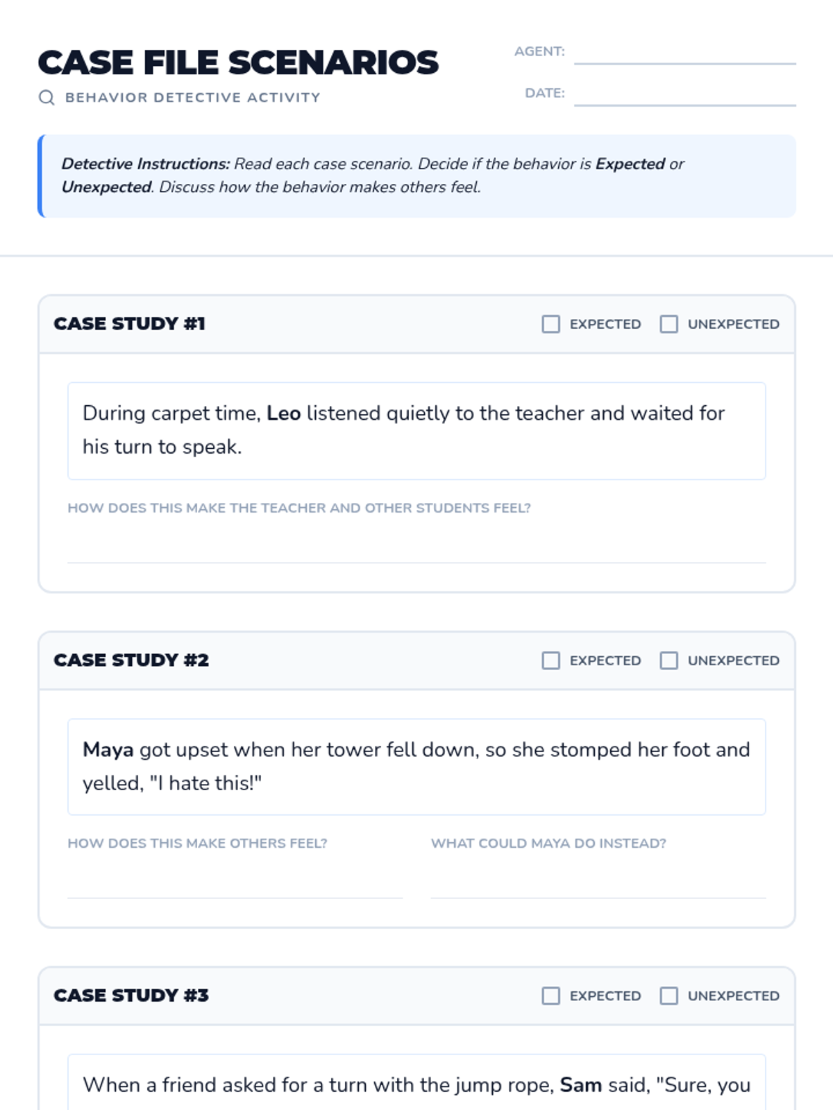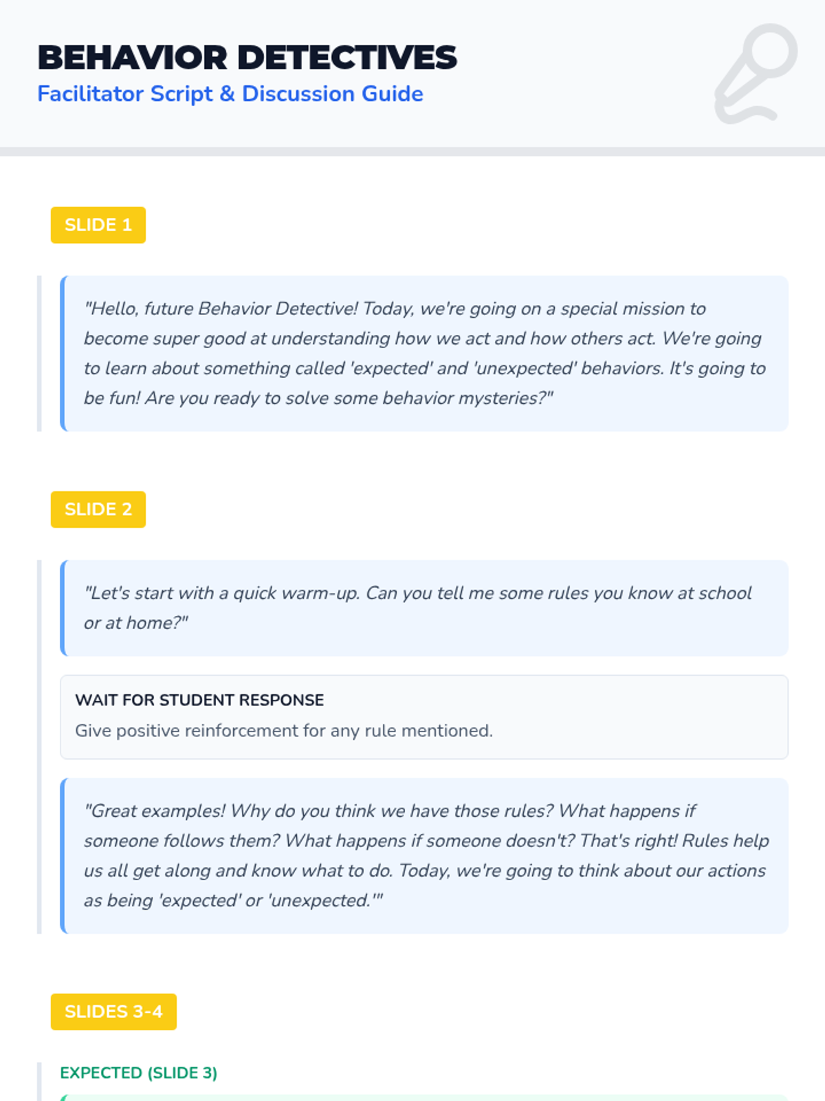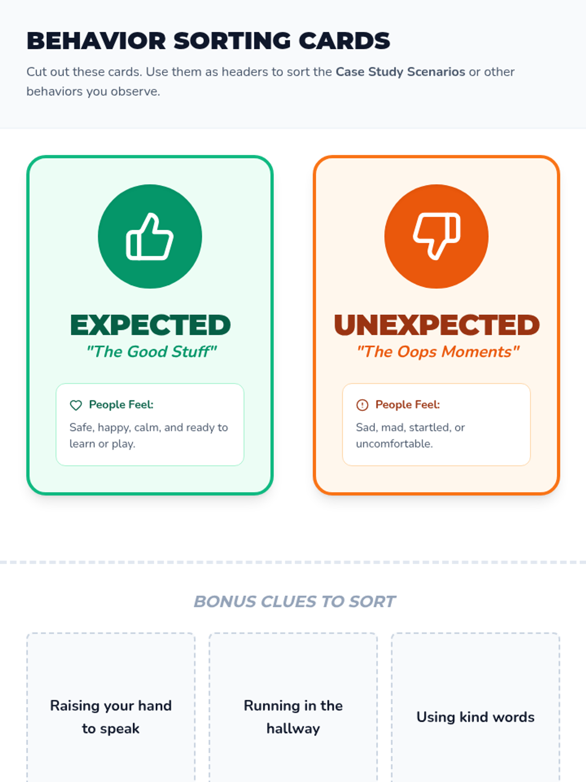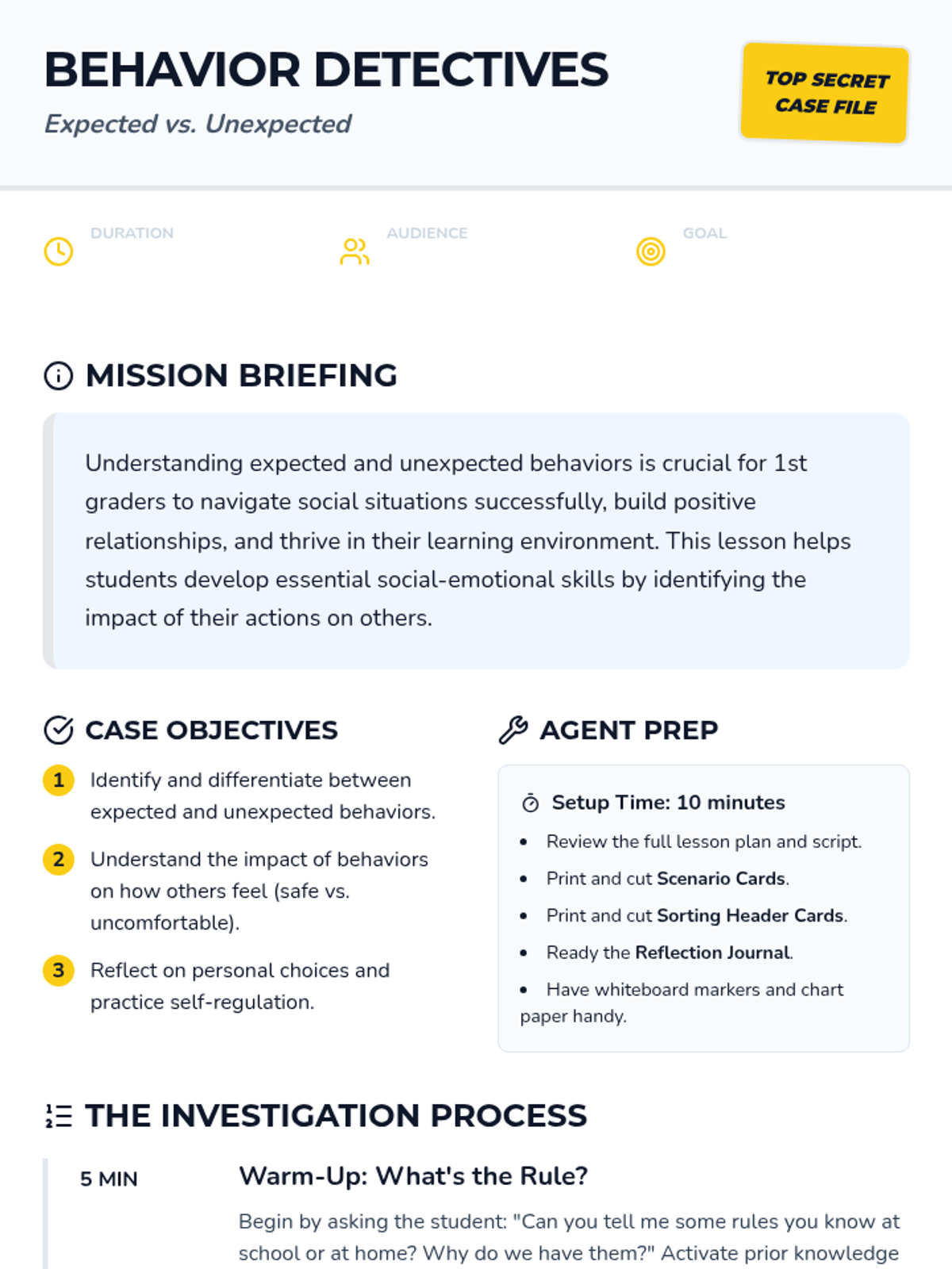A 30-minute Tier 3 social-emotional learning session for 1st graders to identify expected and unexpected behaviors and understand their social impact.