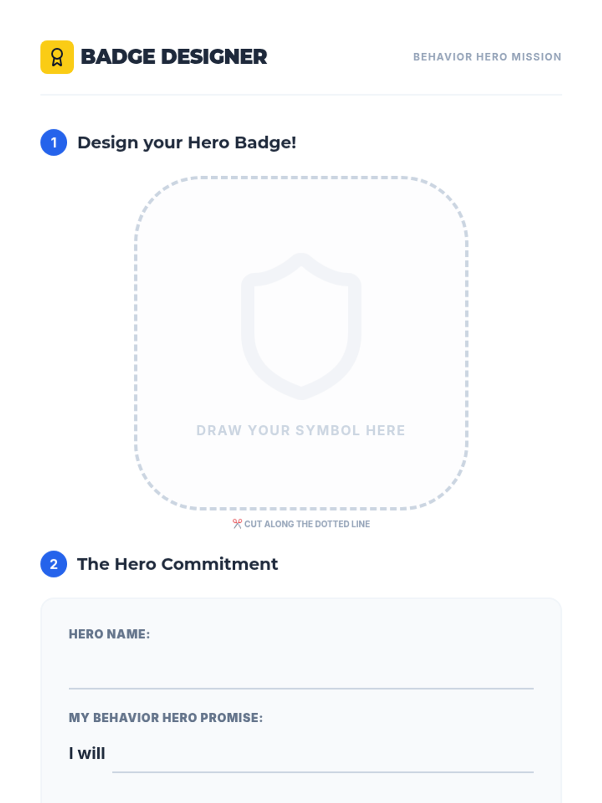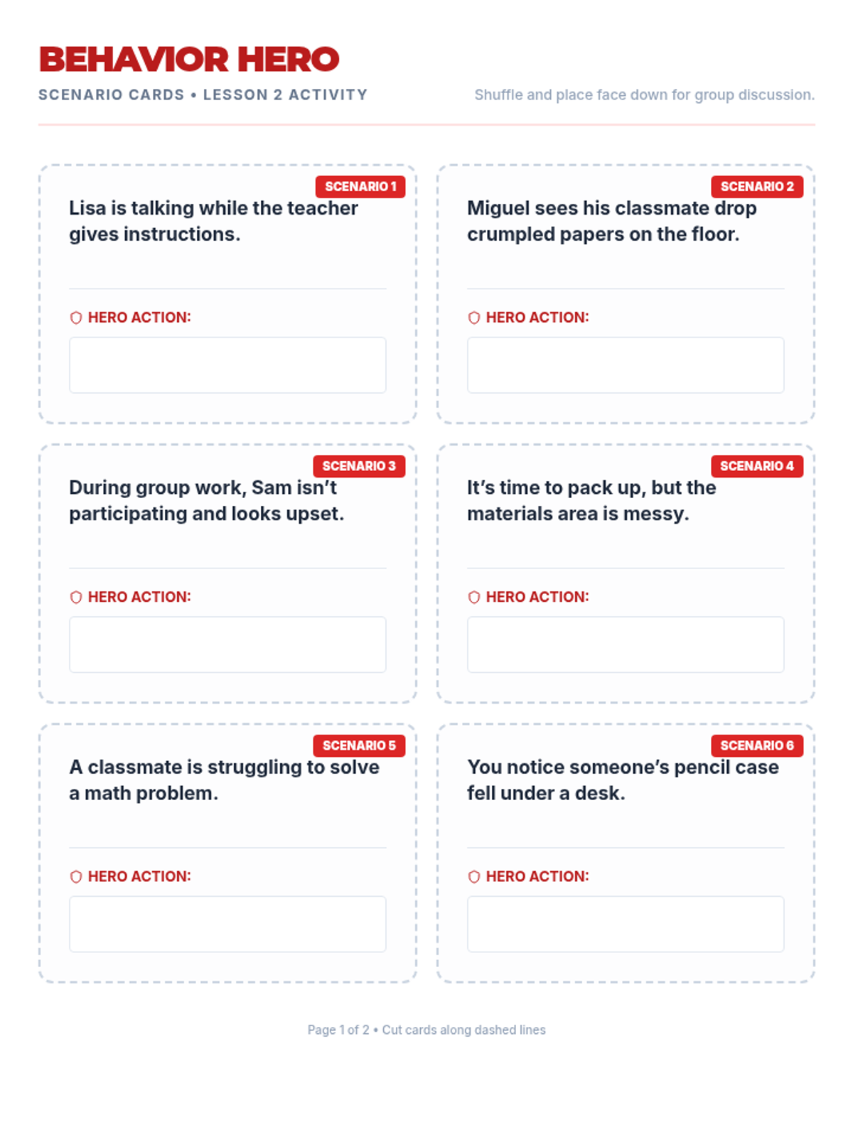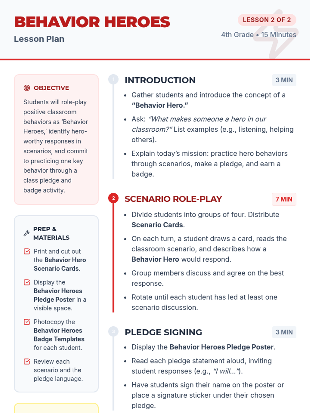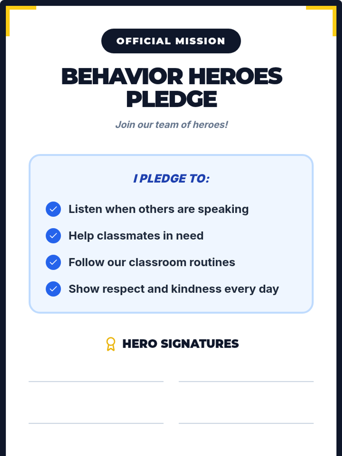 Students step into their roles as 'Behavior Heroes' by role-playing classroom scenarios, signing a class pledge, and creating their own hero badges.