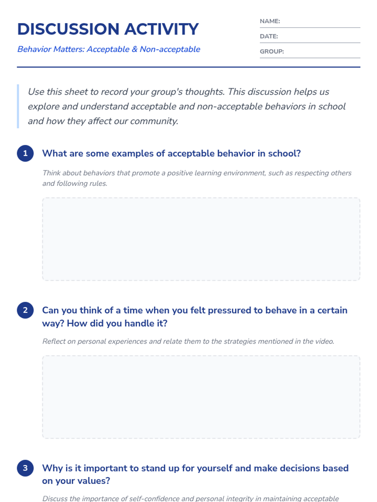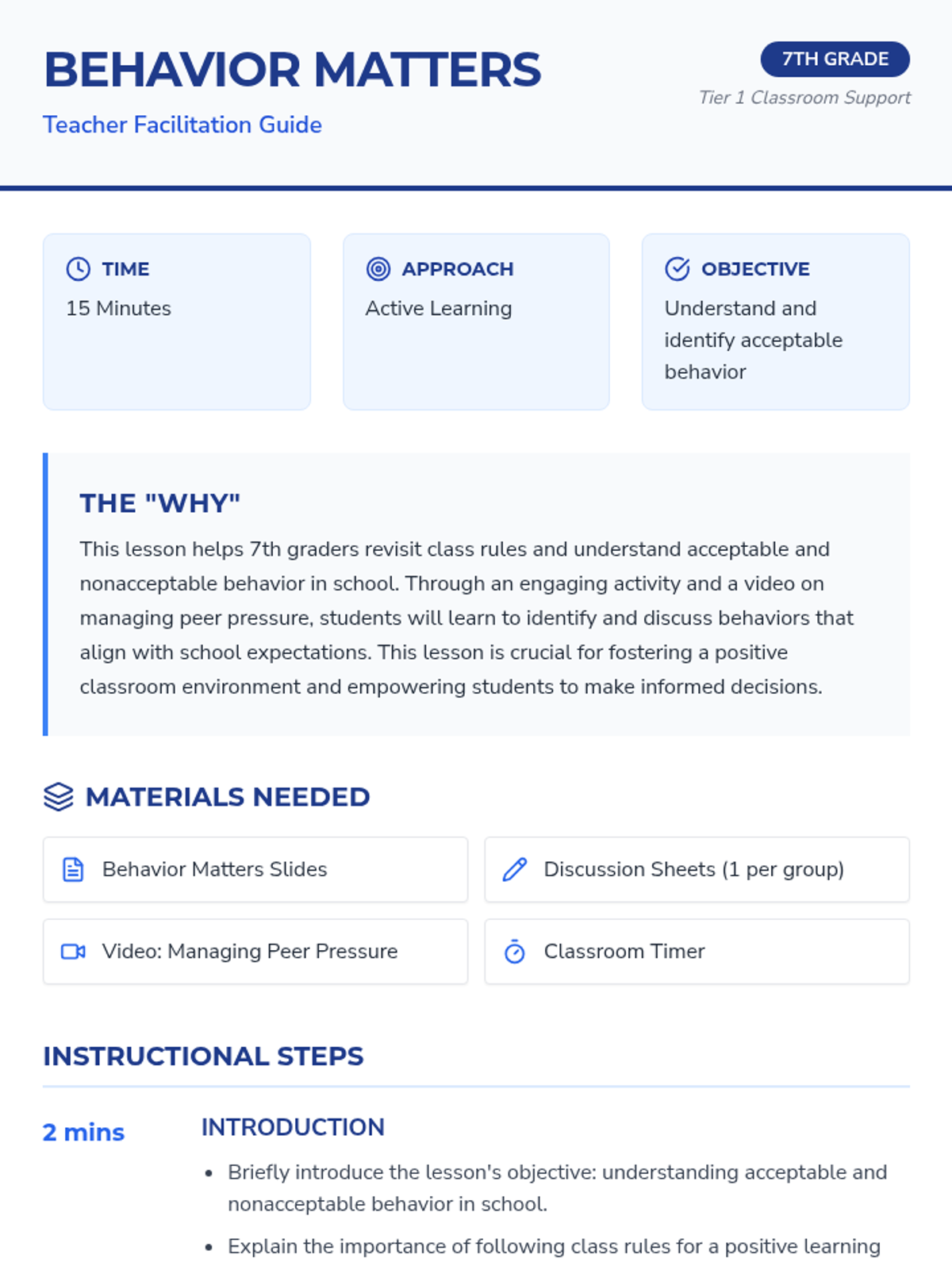 This 15-minute lesson for 7th graders focuses on school expectations and managing peer pressure to maintain a positive learning environment. Students will watch a video, engage in group discussions, and reflect on their personal values to better understand acceptable vs. non-acceptable behaviors.