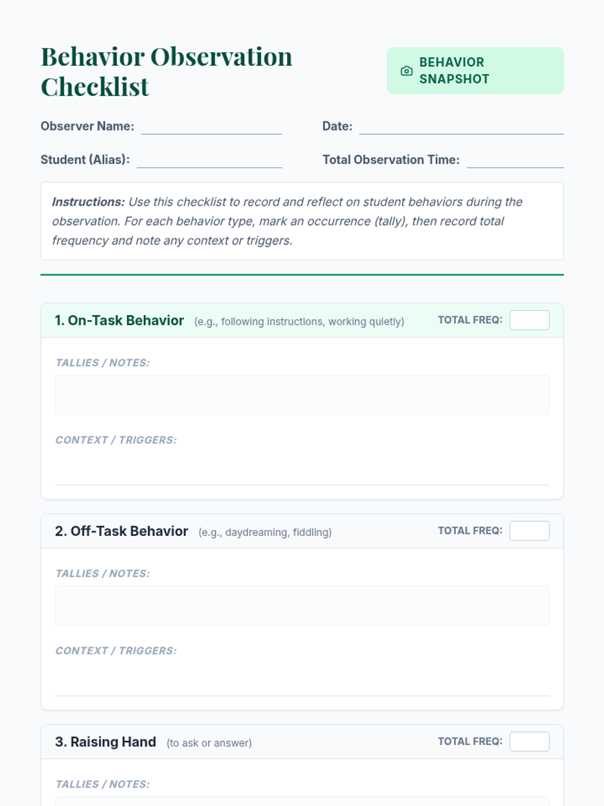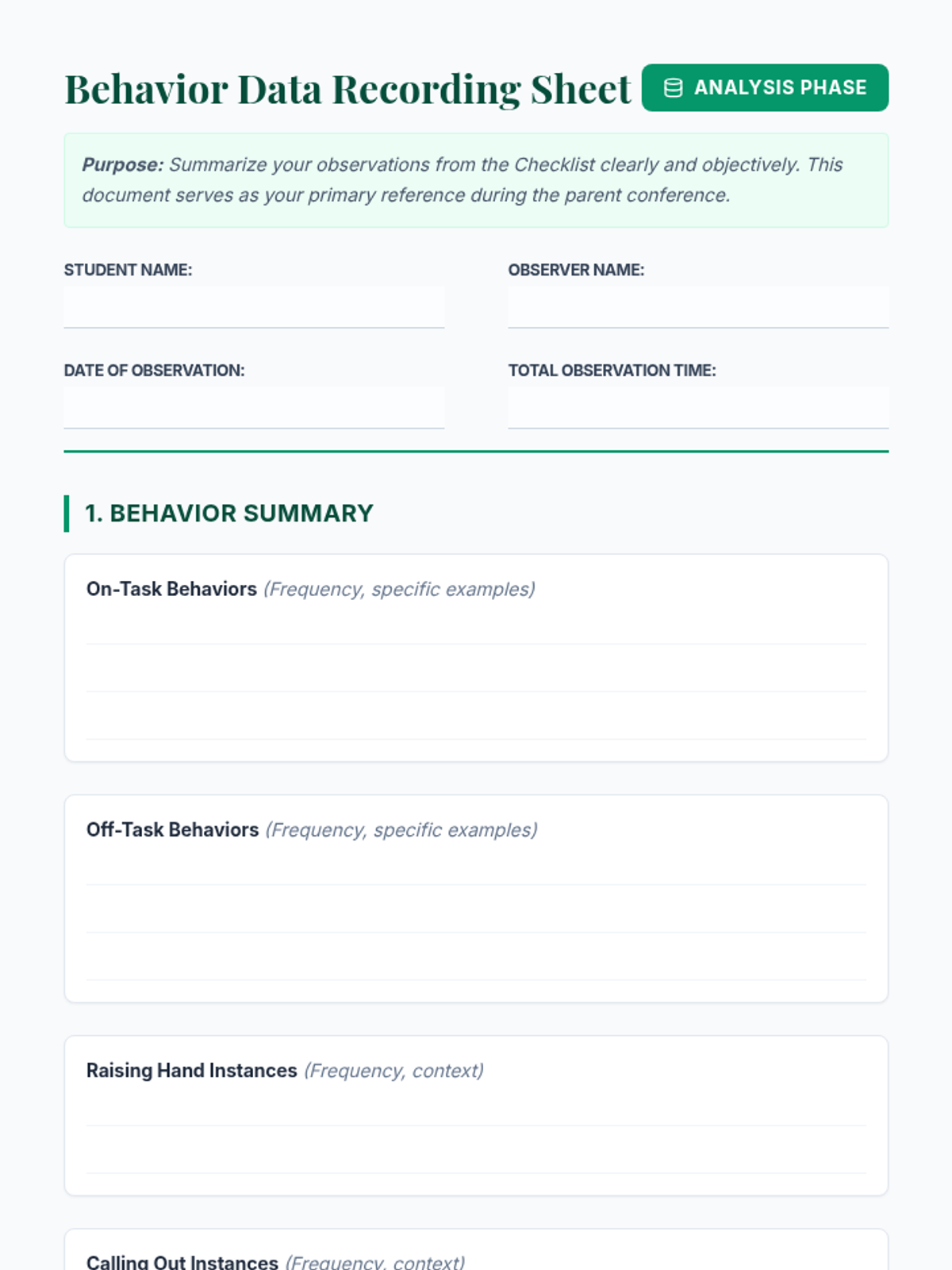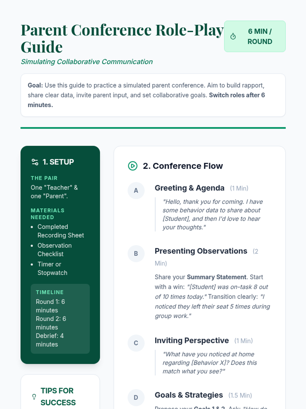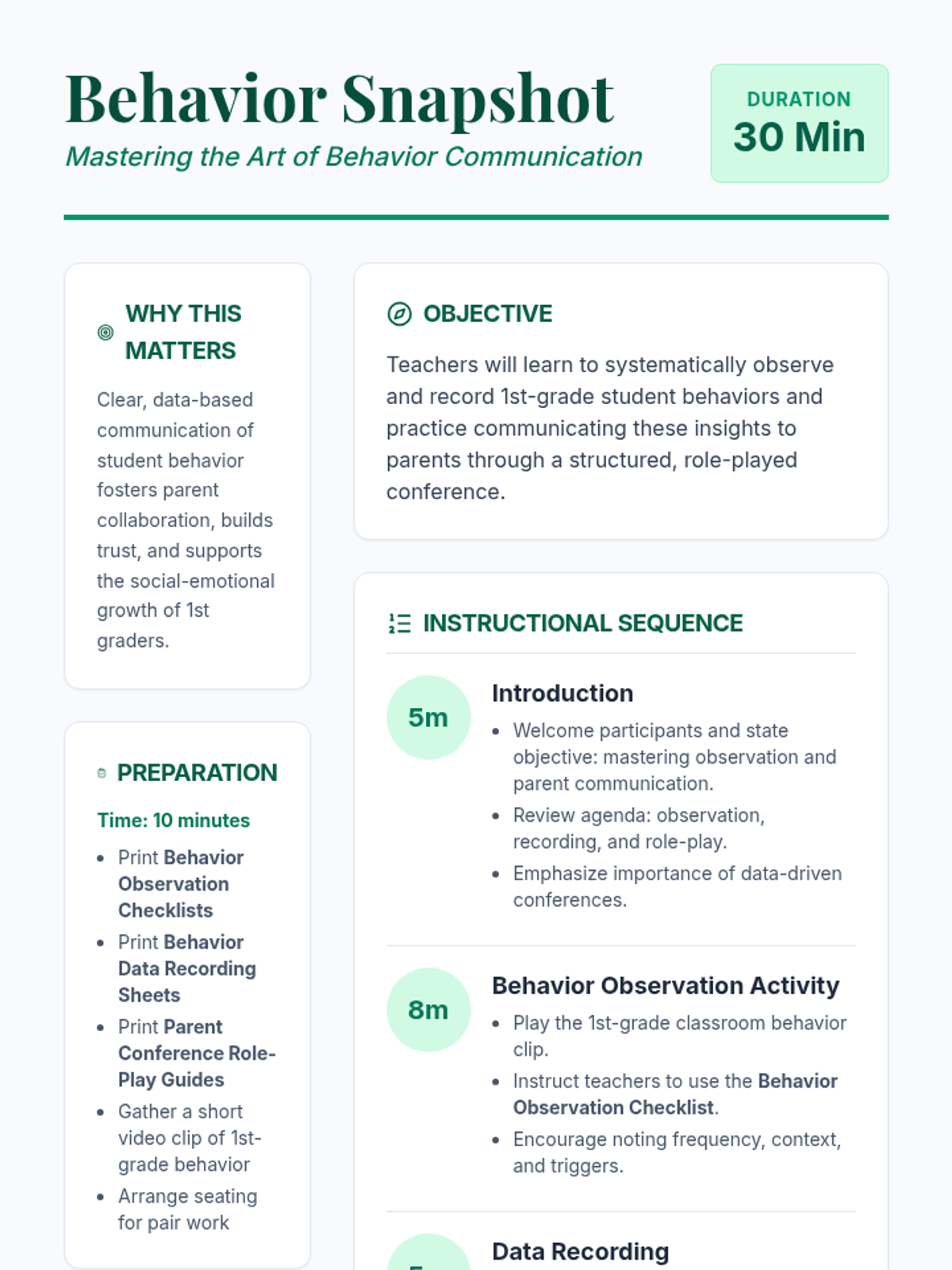 A concise one-session guide for 1st-grade teachers to assess and communicate student behavior to parents through systematic observation, data recording, and role-played conferences.