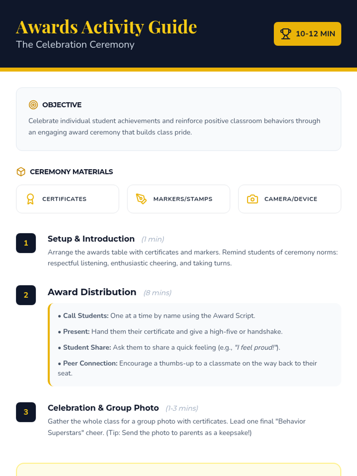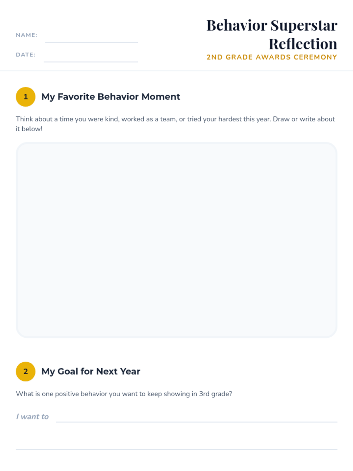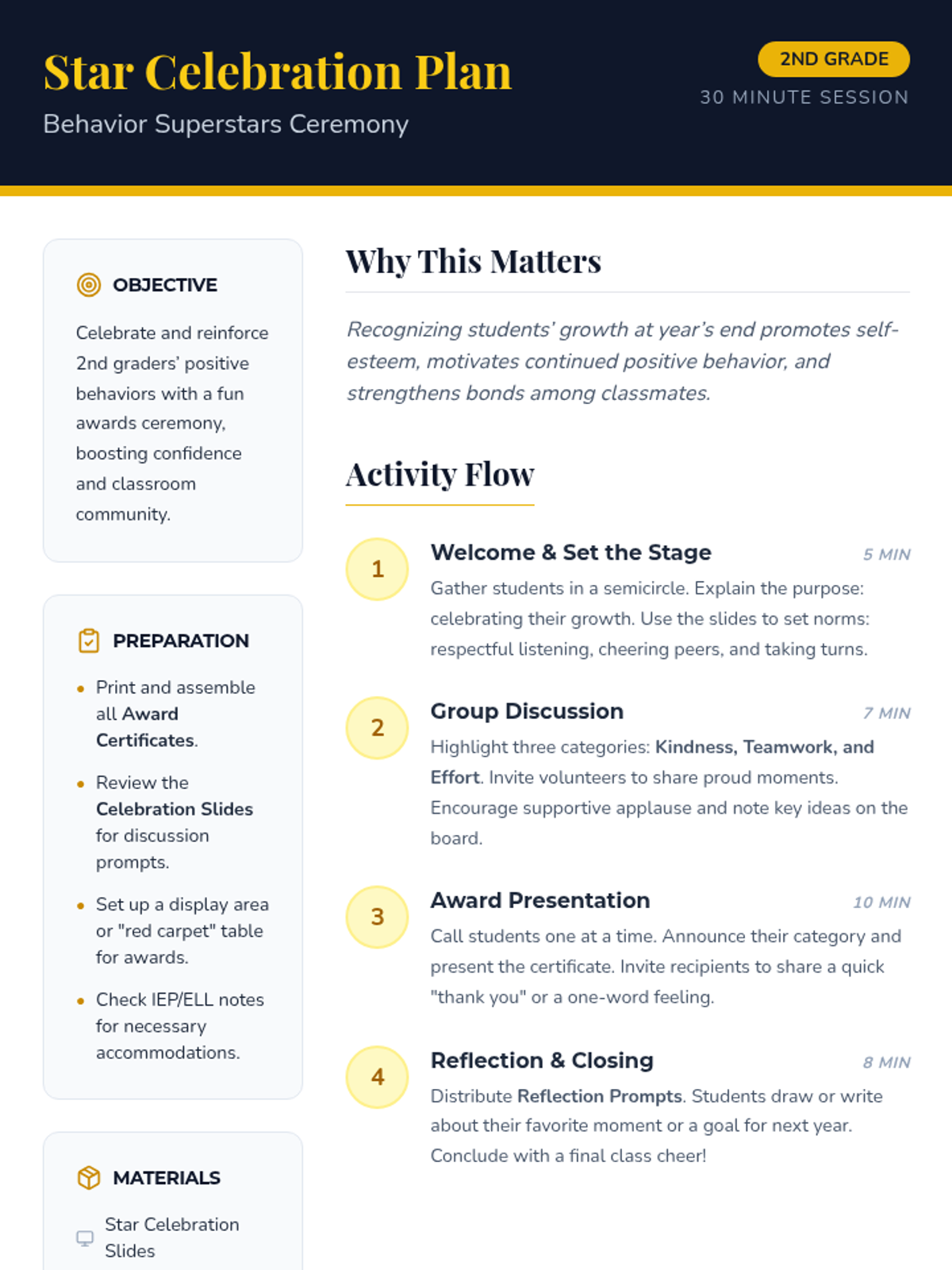 A fun, end-of-year lesson celebrating 2nd graders’ positive behaviors with an award ceremony to honor growth and boost confidence.