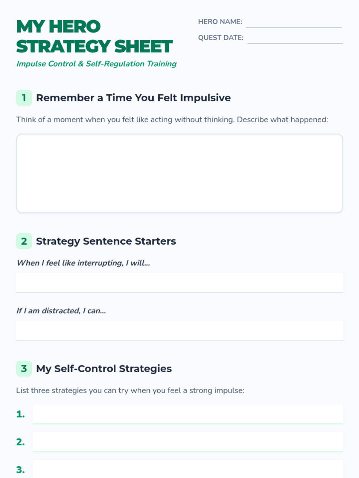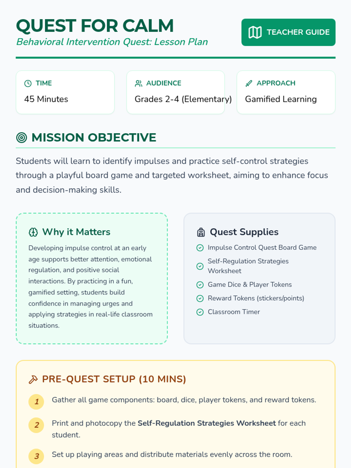 A gamified lesson for elementary students to recognize and manage impulses through interactive quests, a board game, and reflective exercises.