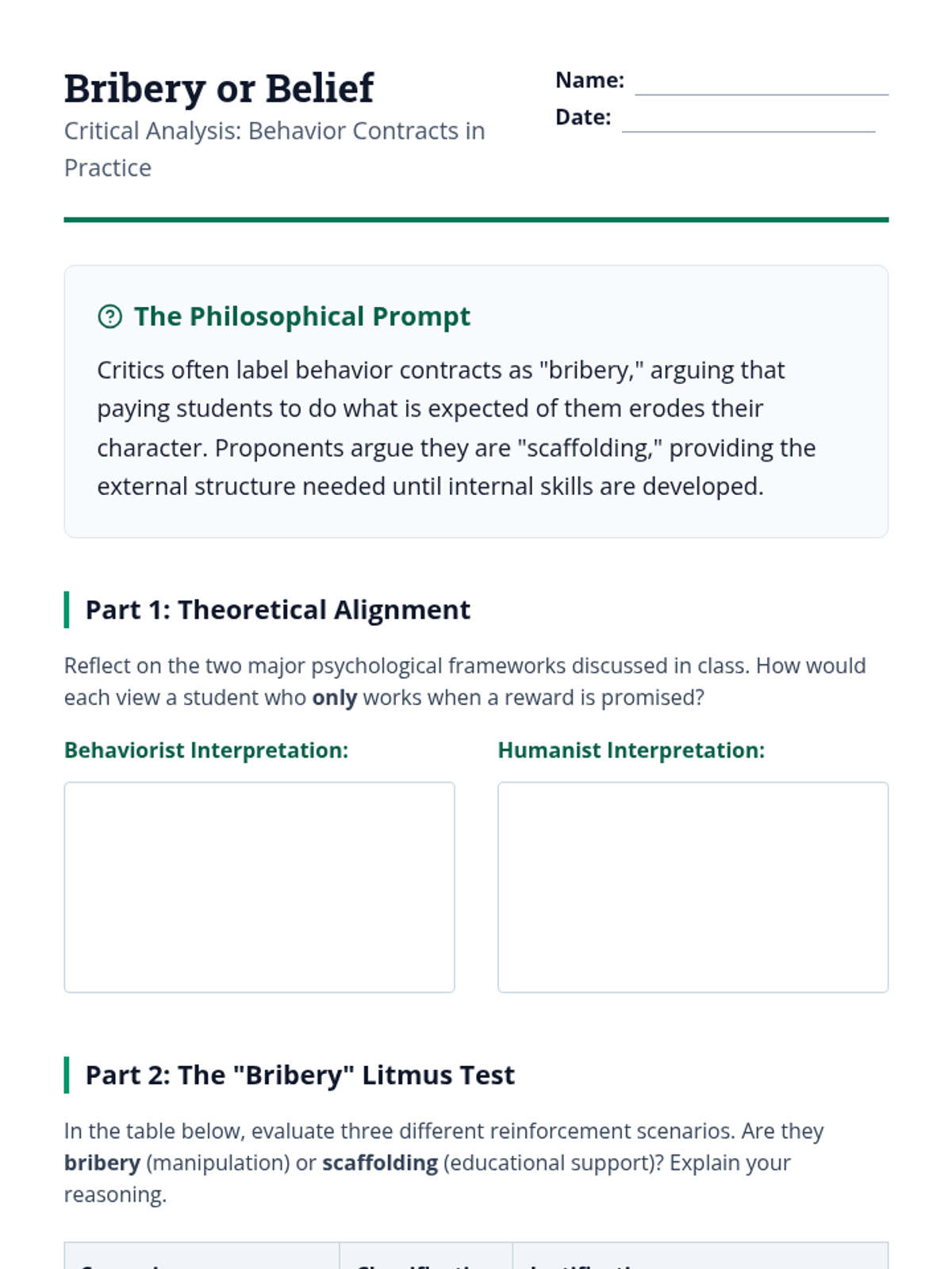 Students compare Skinnerian behaviorism with Rogers' humanistic approach to understand how behavior contracts can provide structure while respecting student agency.