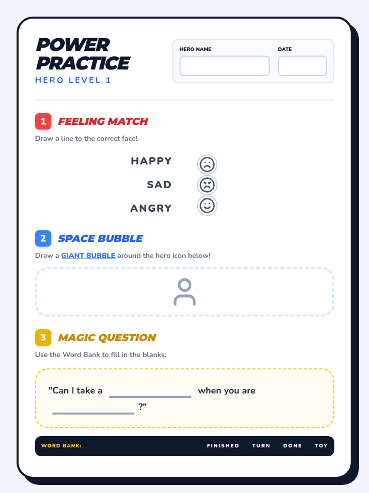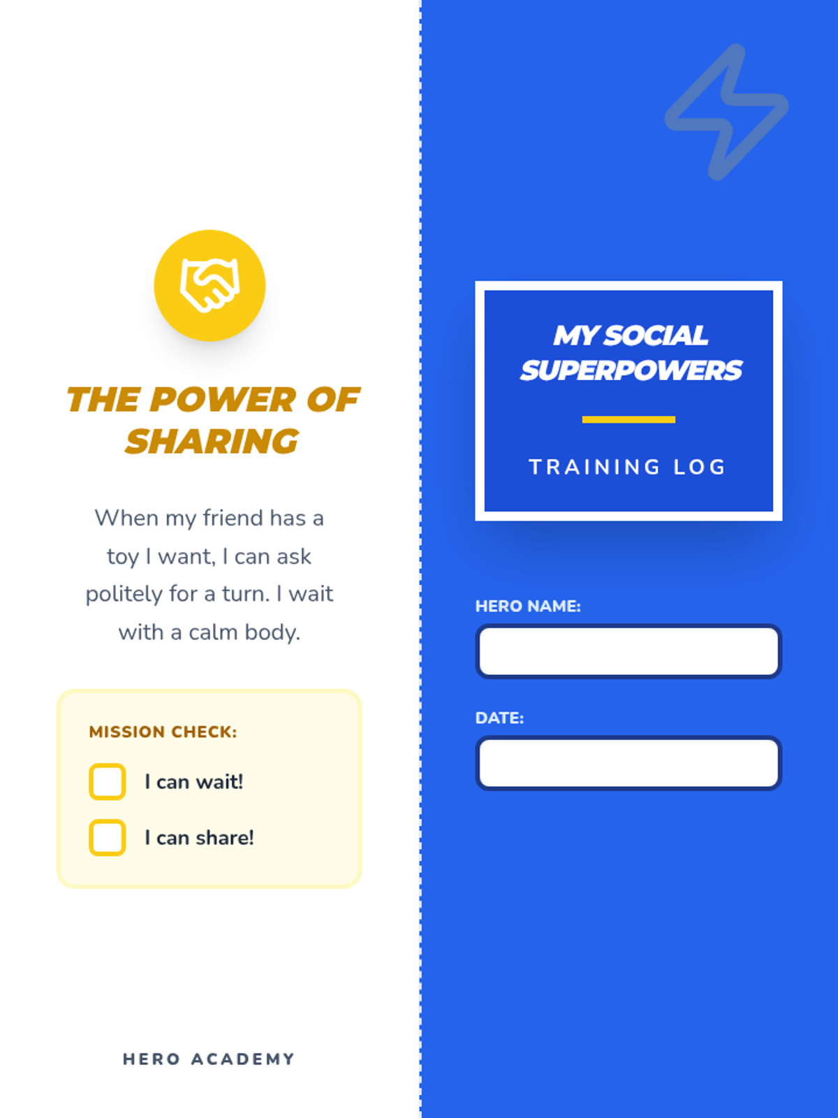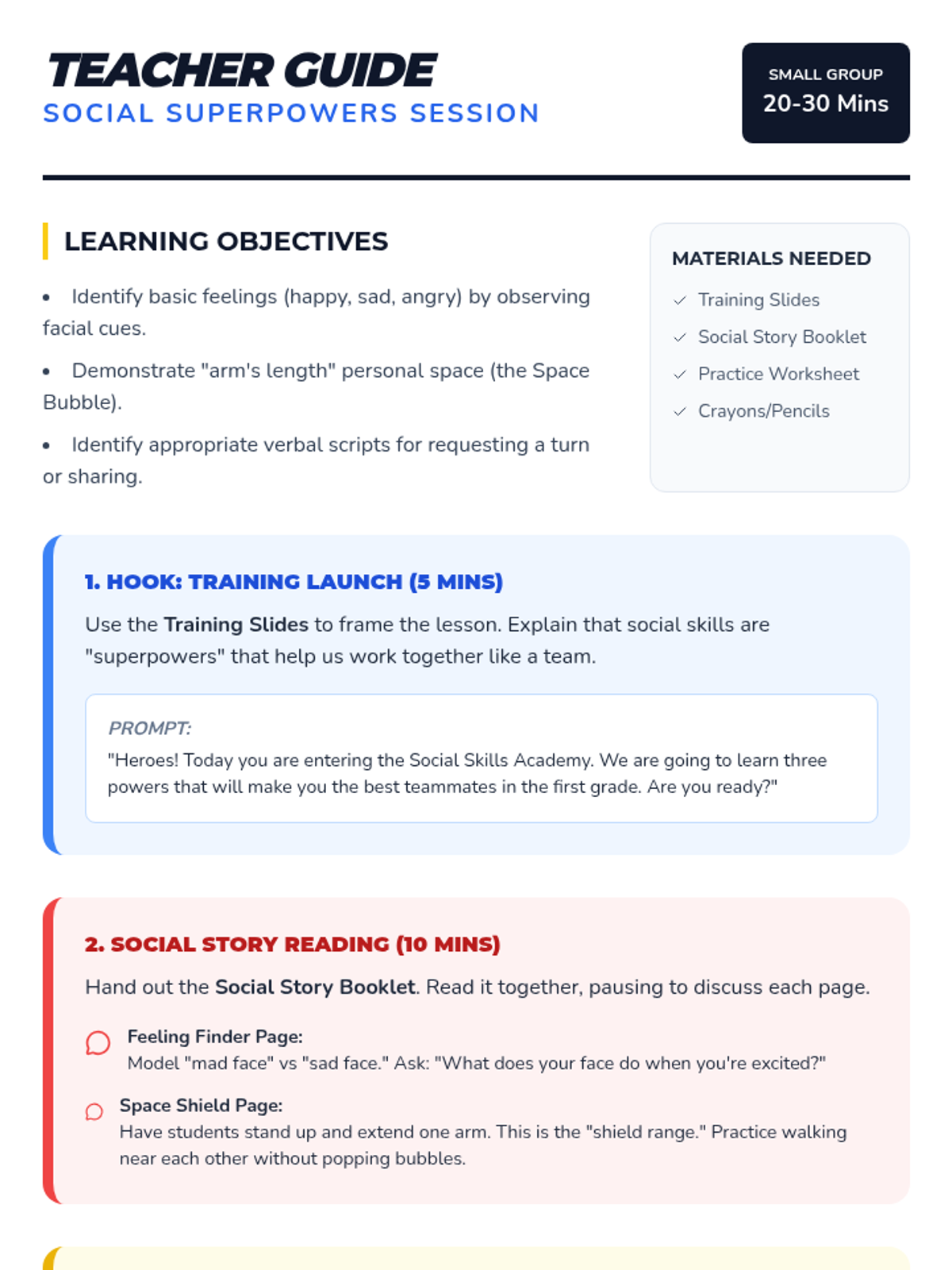 A small group lesson for first graders focused on three essential social skills: identifying feelings, respecting personal space, and mastering sharing and turn-taking through a superhero lens.
