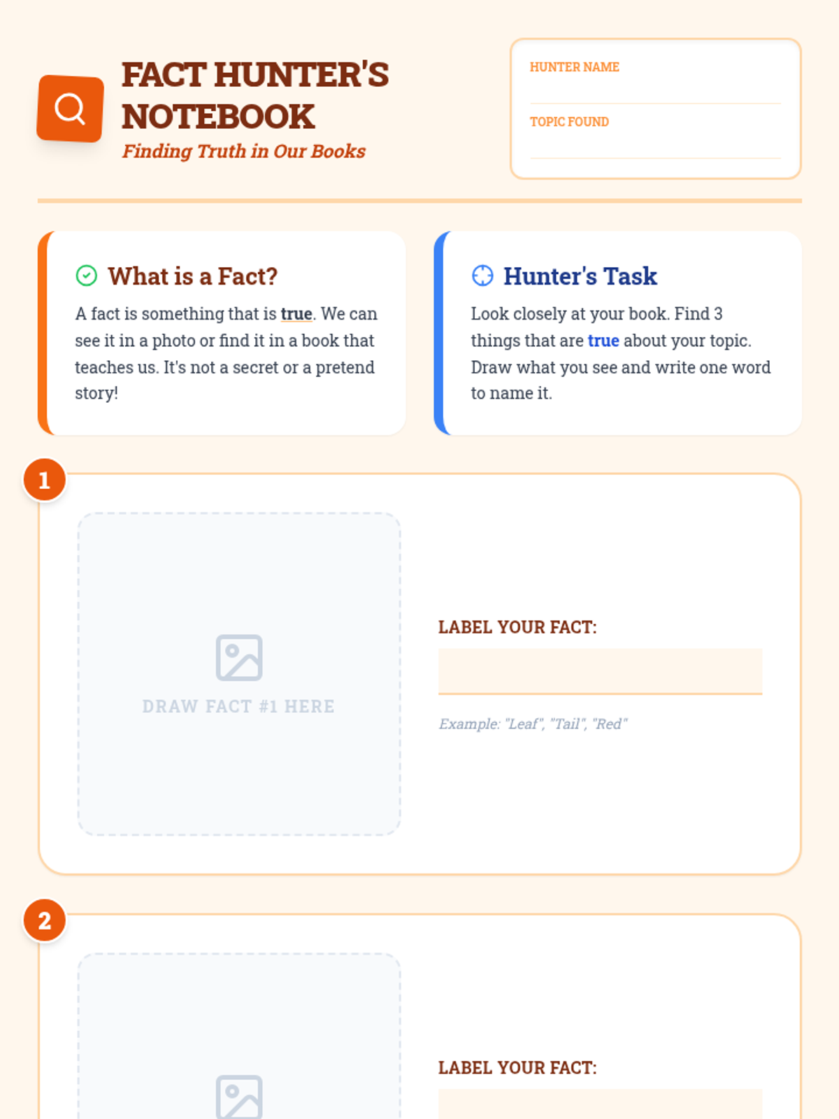 Students use informational texts to 'hunt' for three true facts about a topic, emphasizing accuracy over imagination.